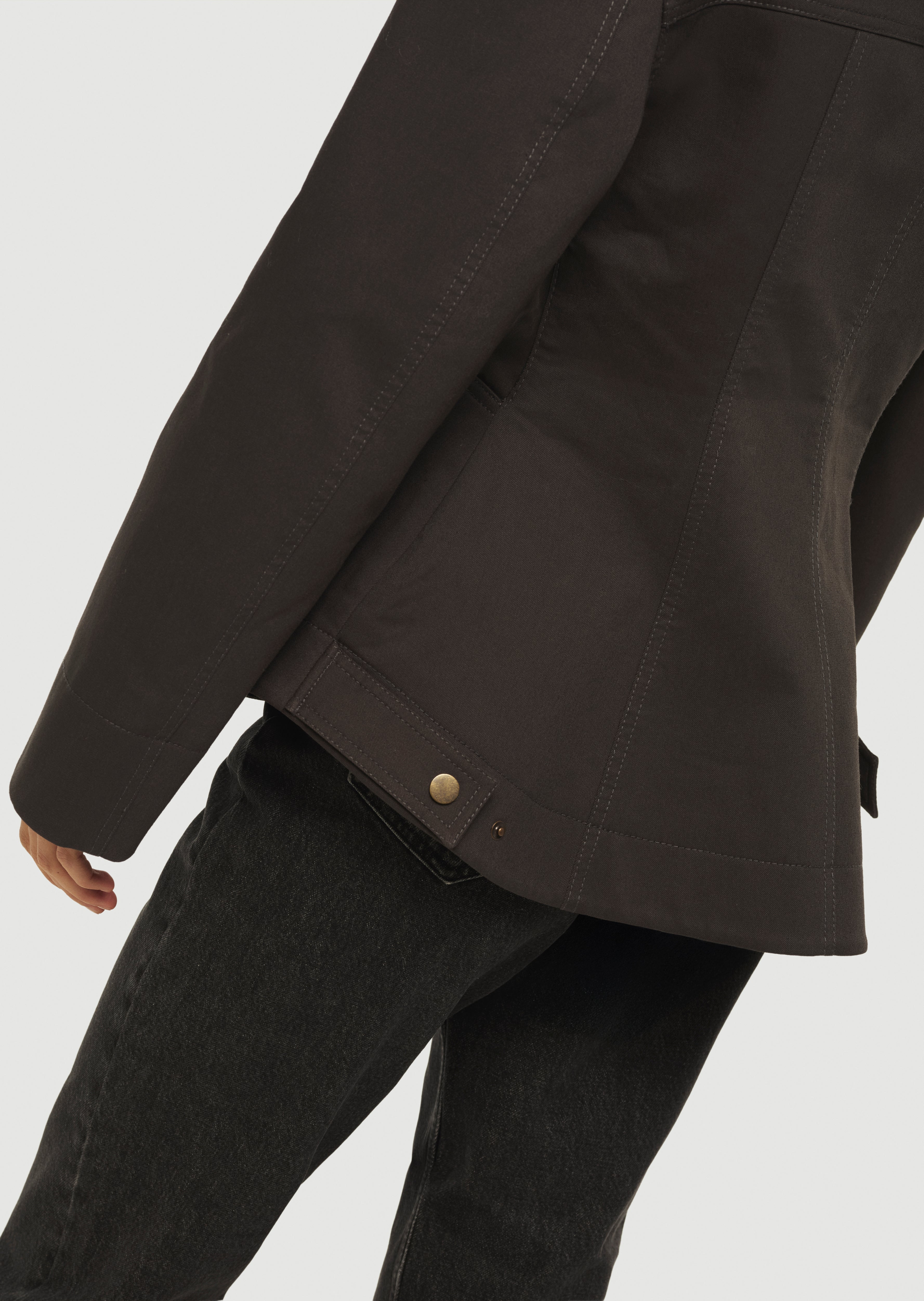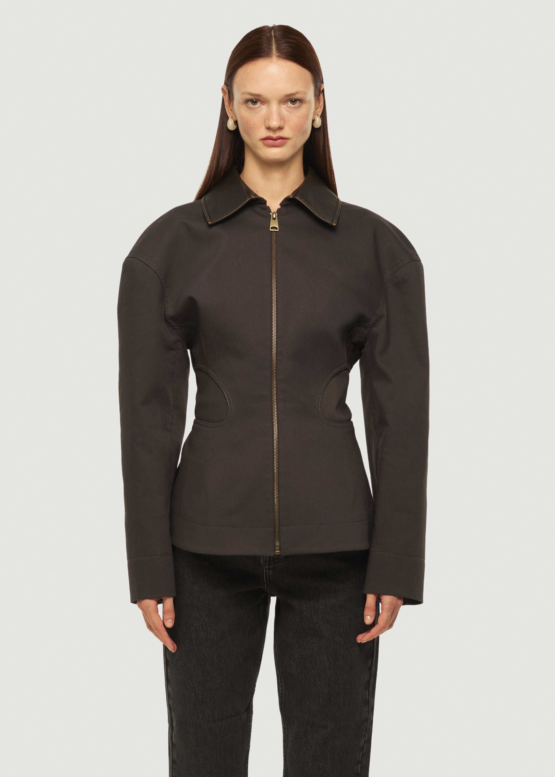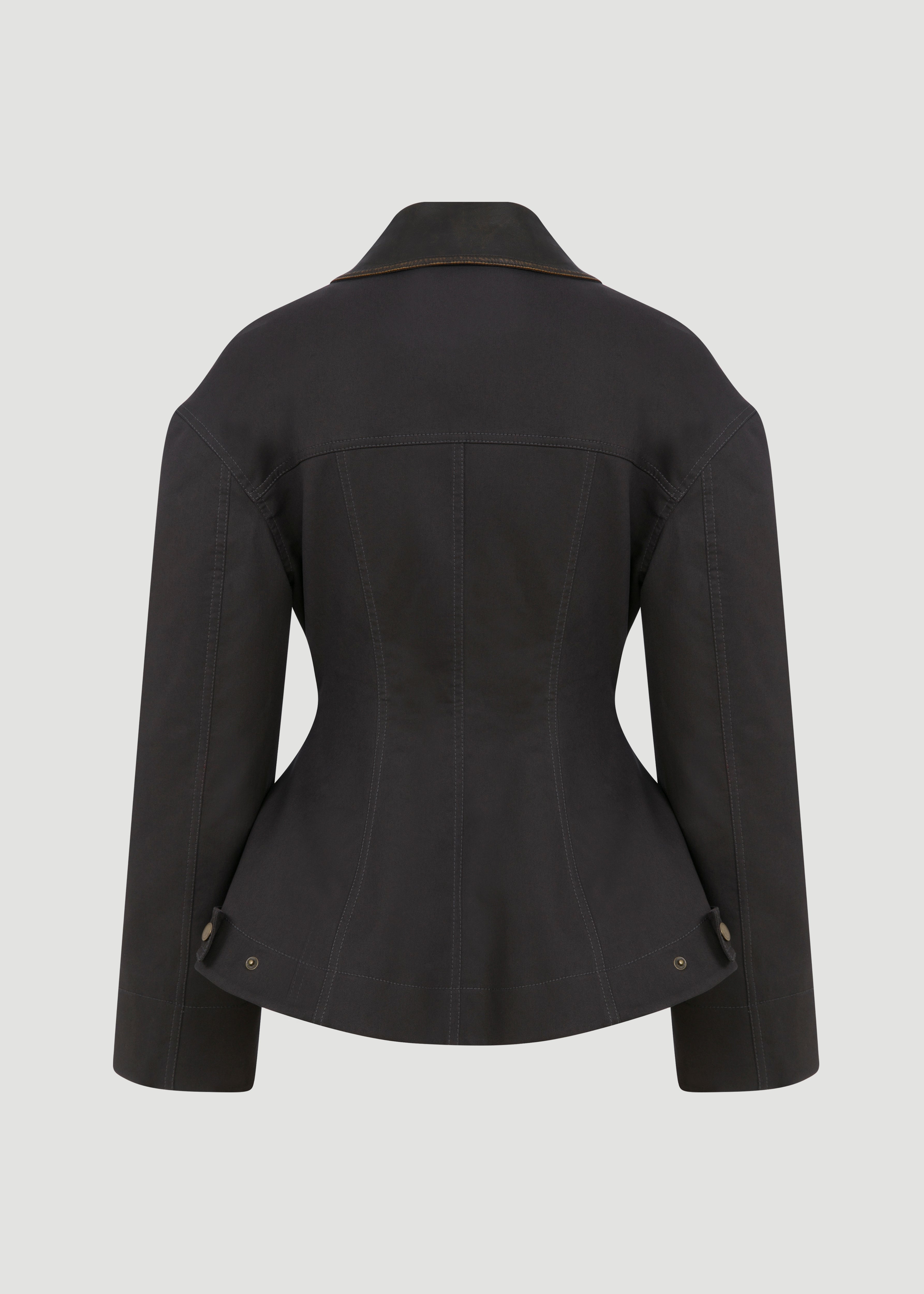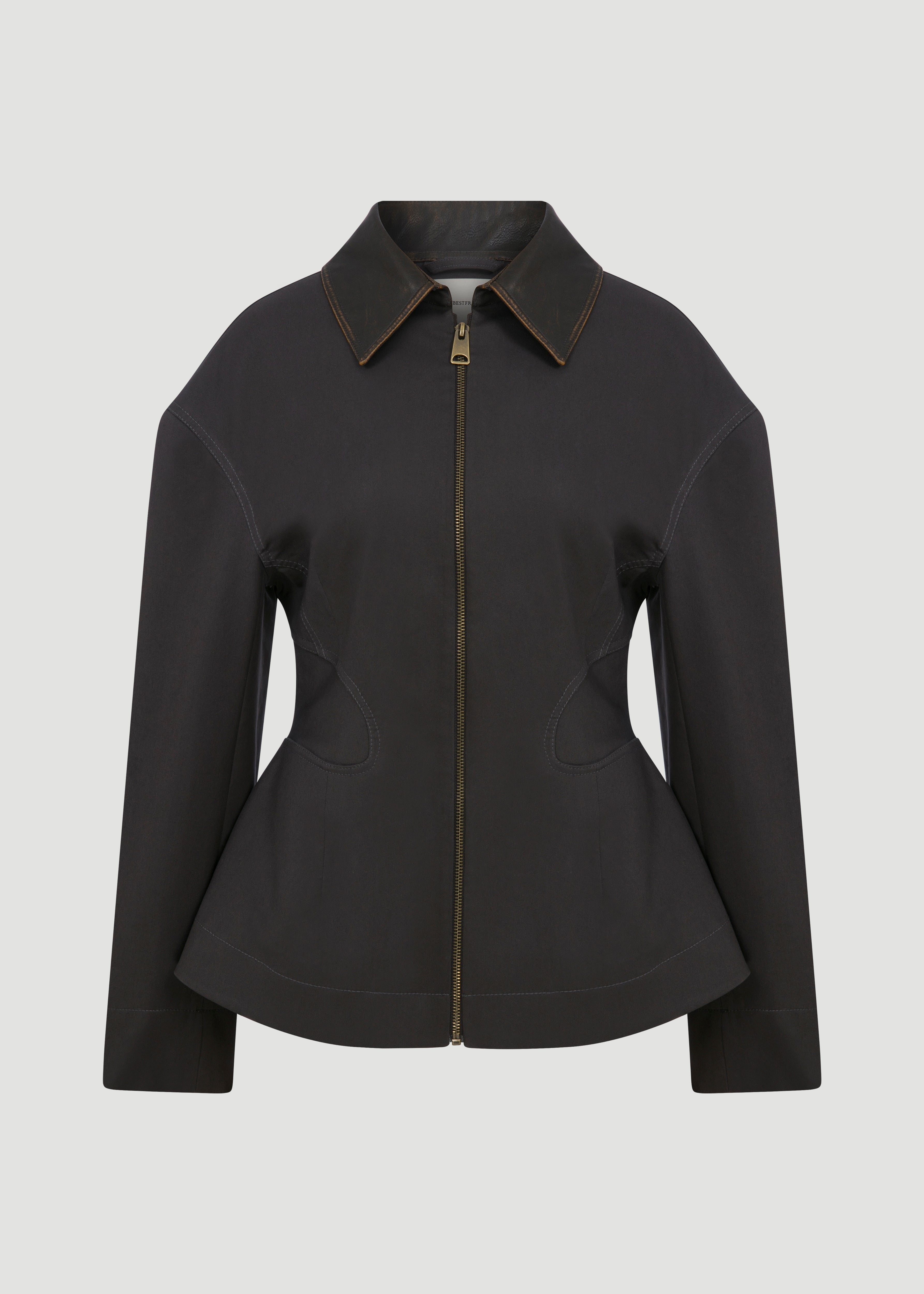 Düşük omuz, bele oturan, fermuar kapatmalı, deri yakalı gabardin ceket.