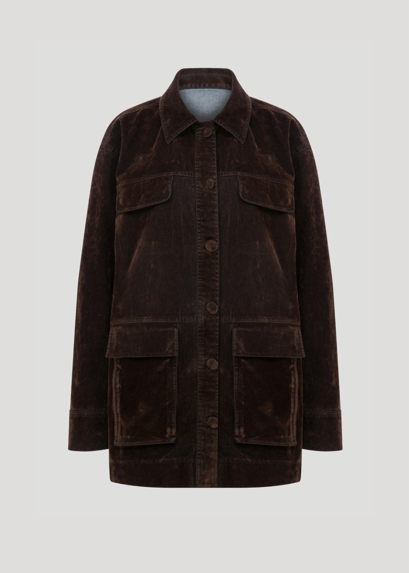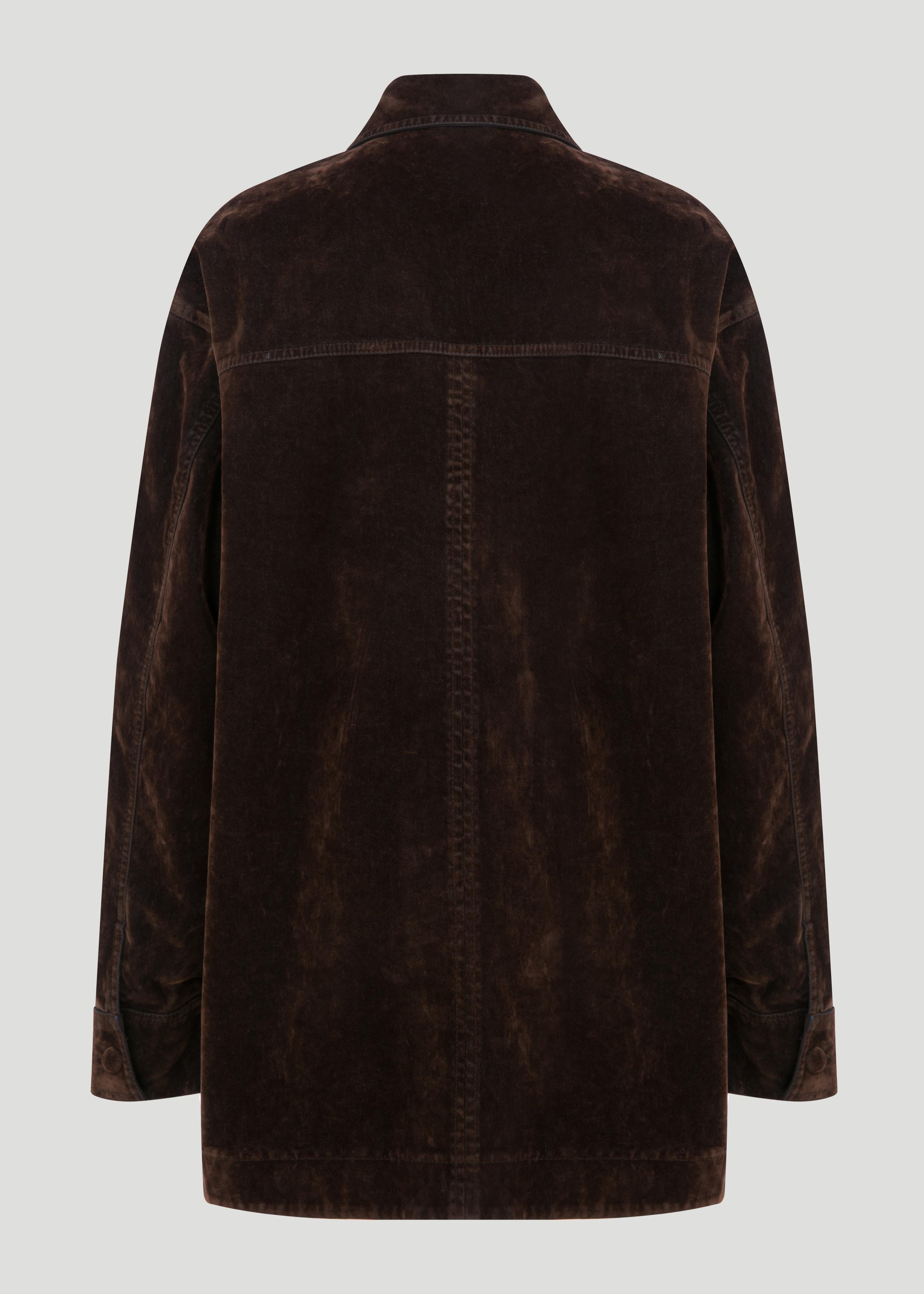 Düz kesim, cep detaylı kadife denim ceket.