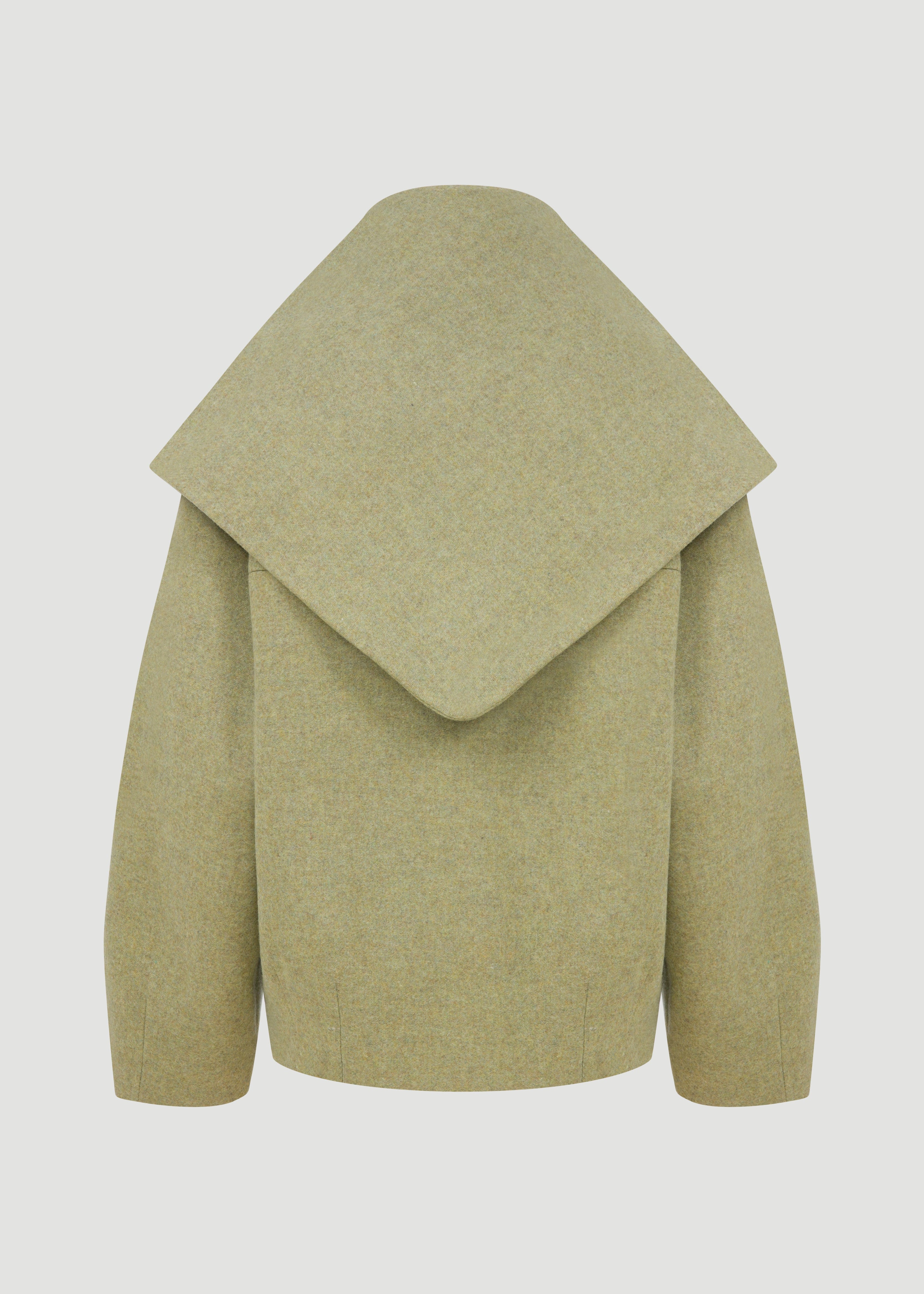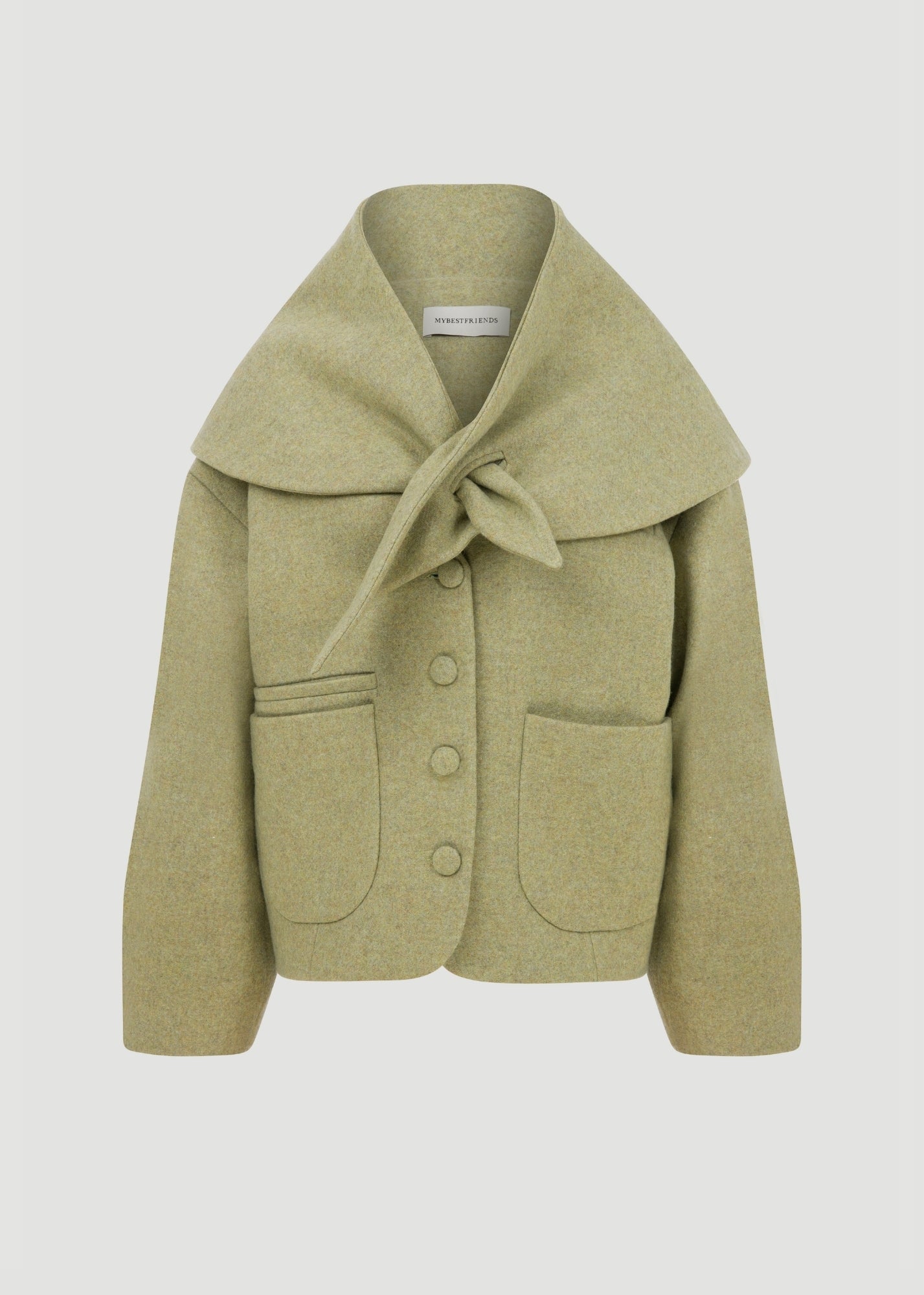 Bağlamalı büyük yaka ve cep detaylı yün kumaştan ceket.