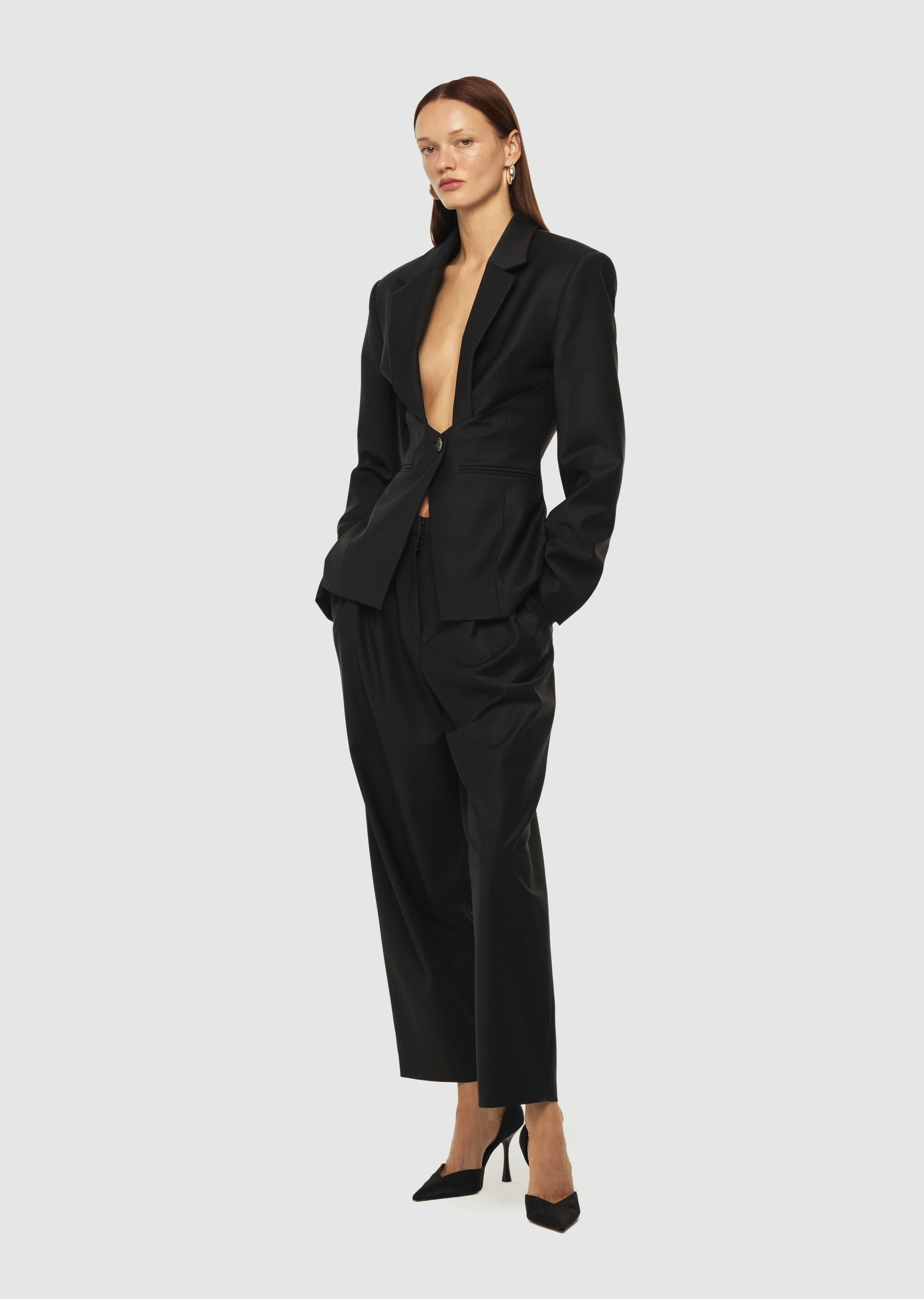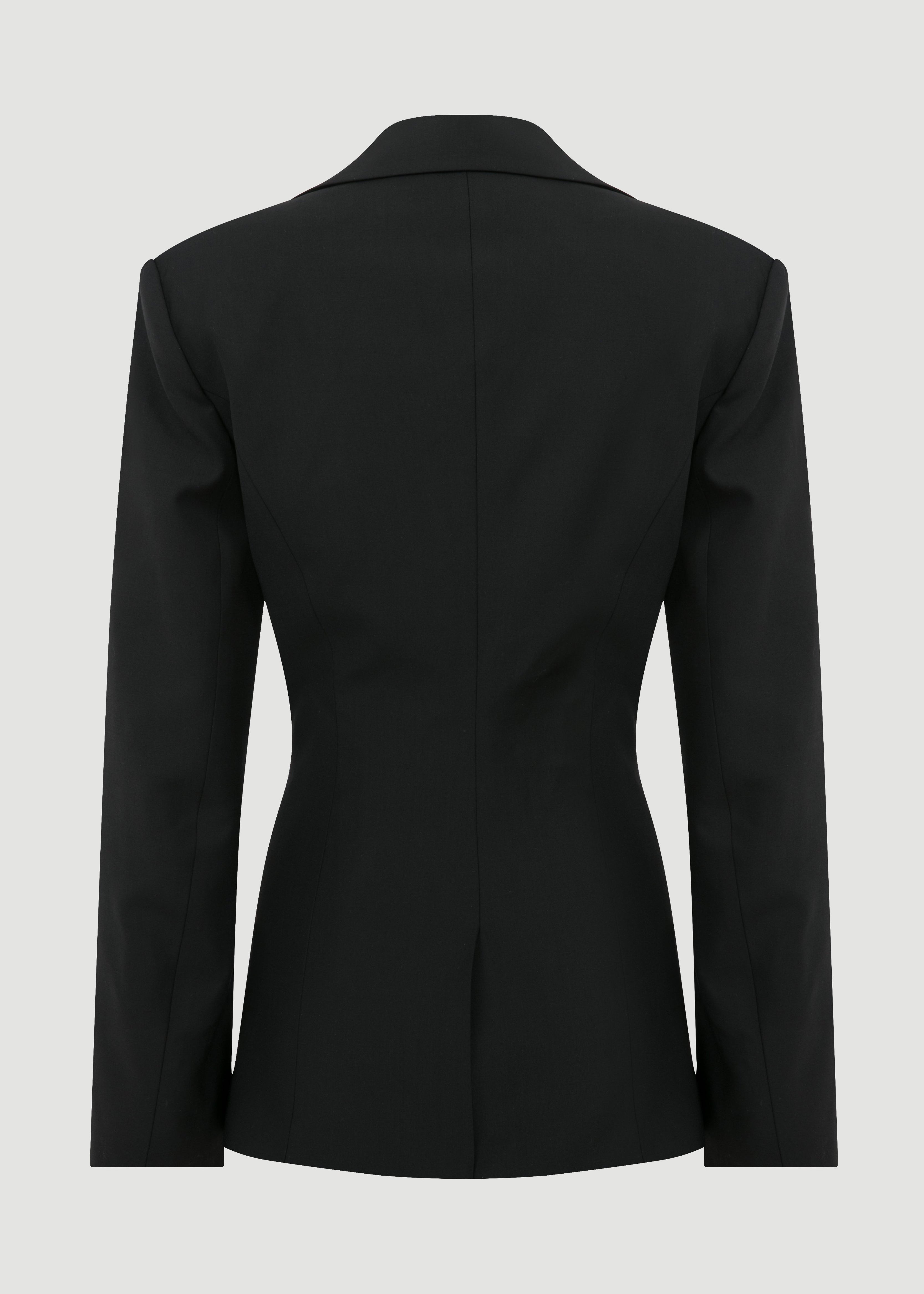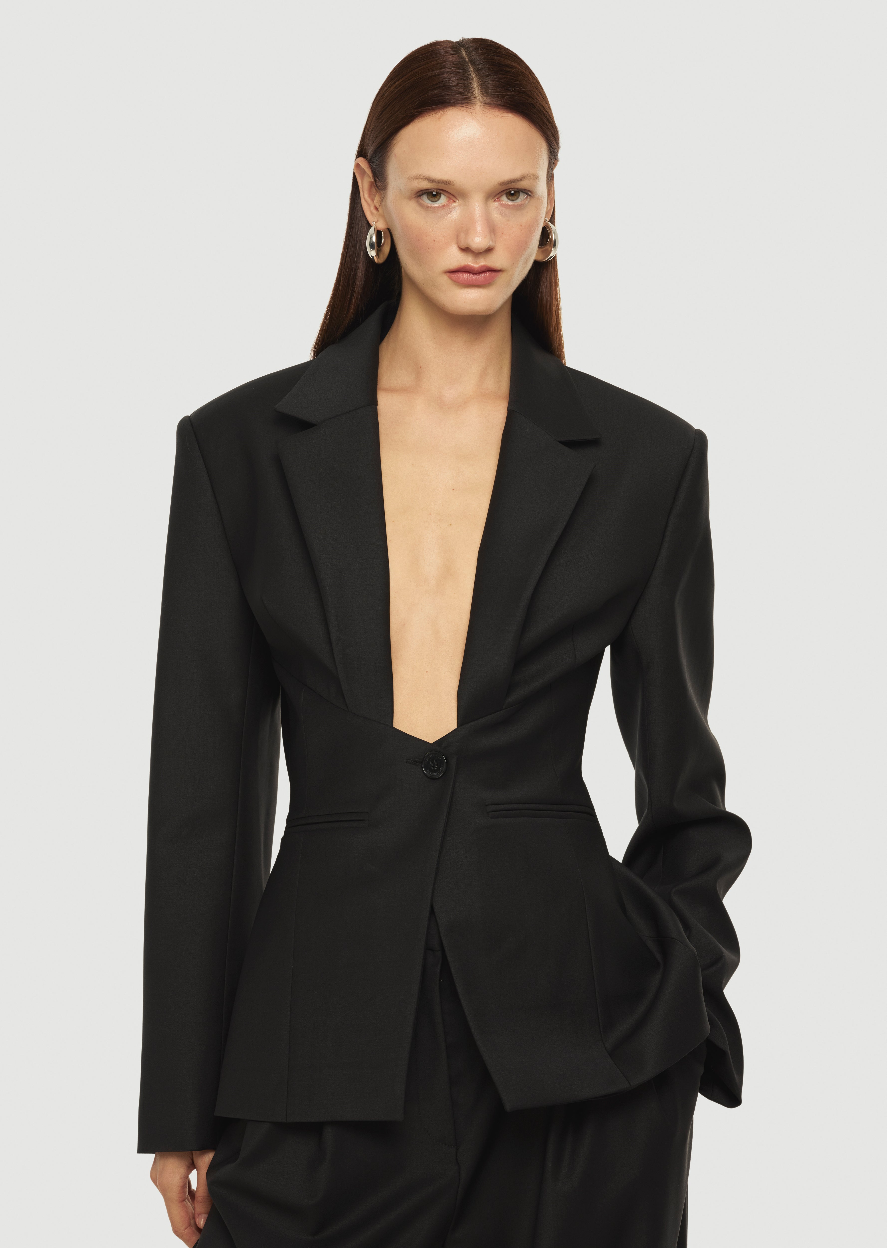 Derin V-dekolteli, kapama yeri üçgen detaylı, şık blazer ceket.