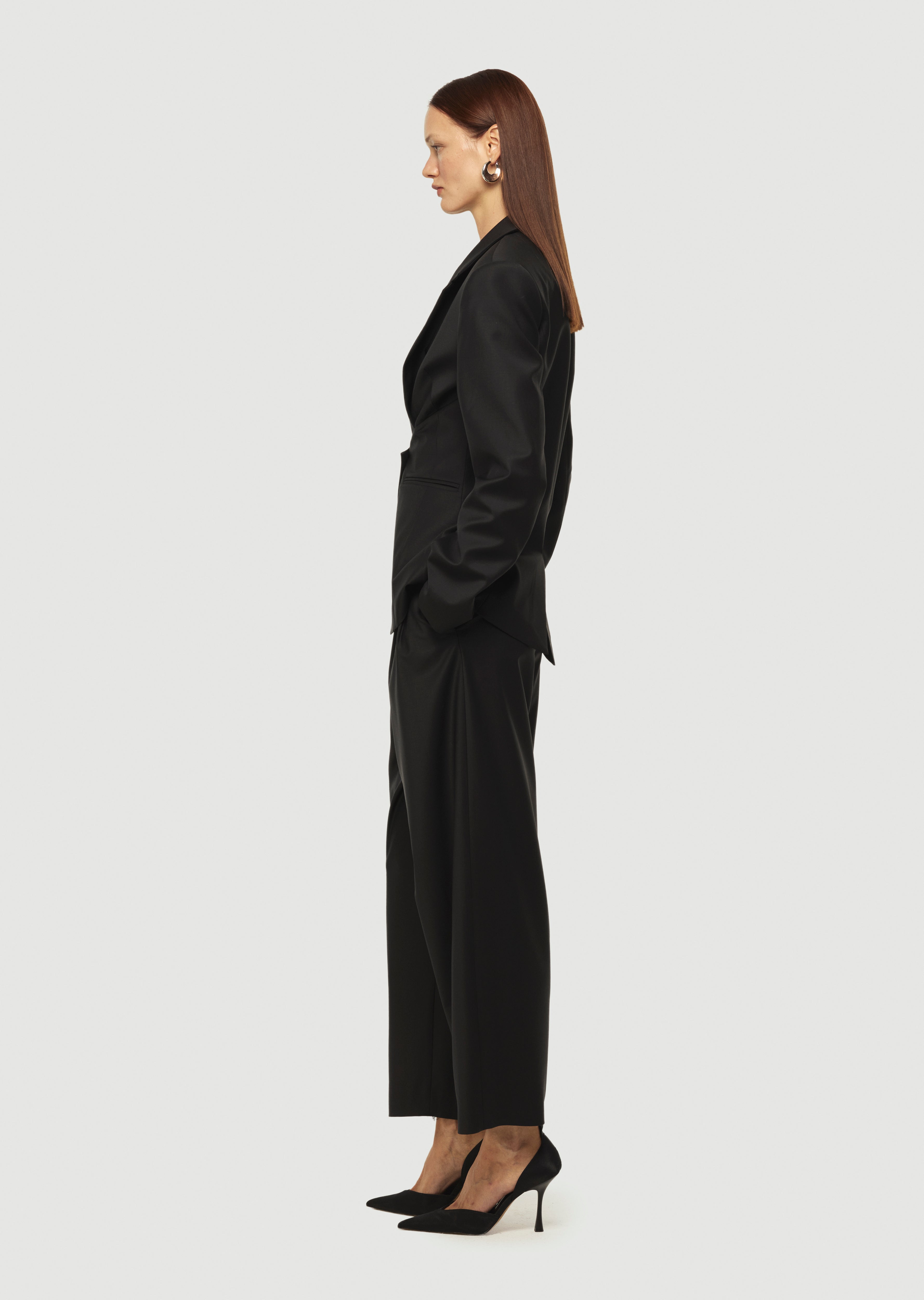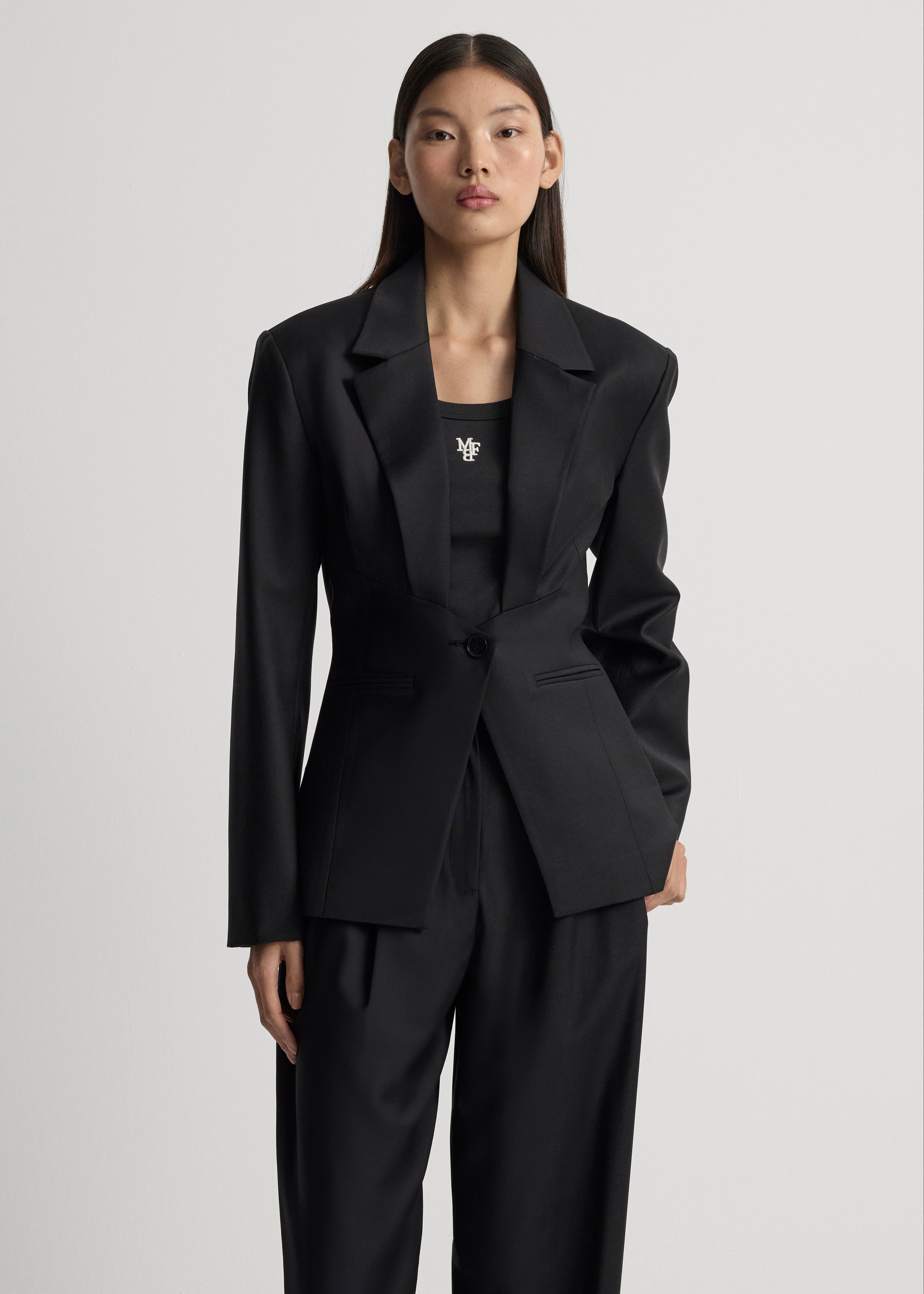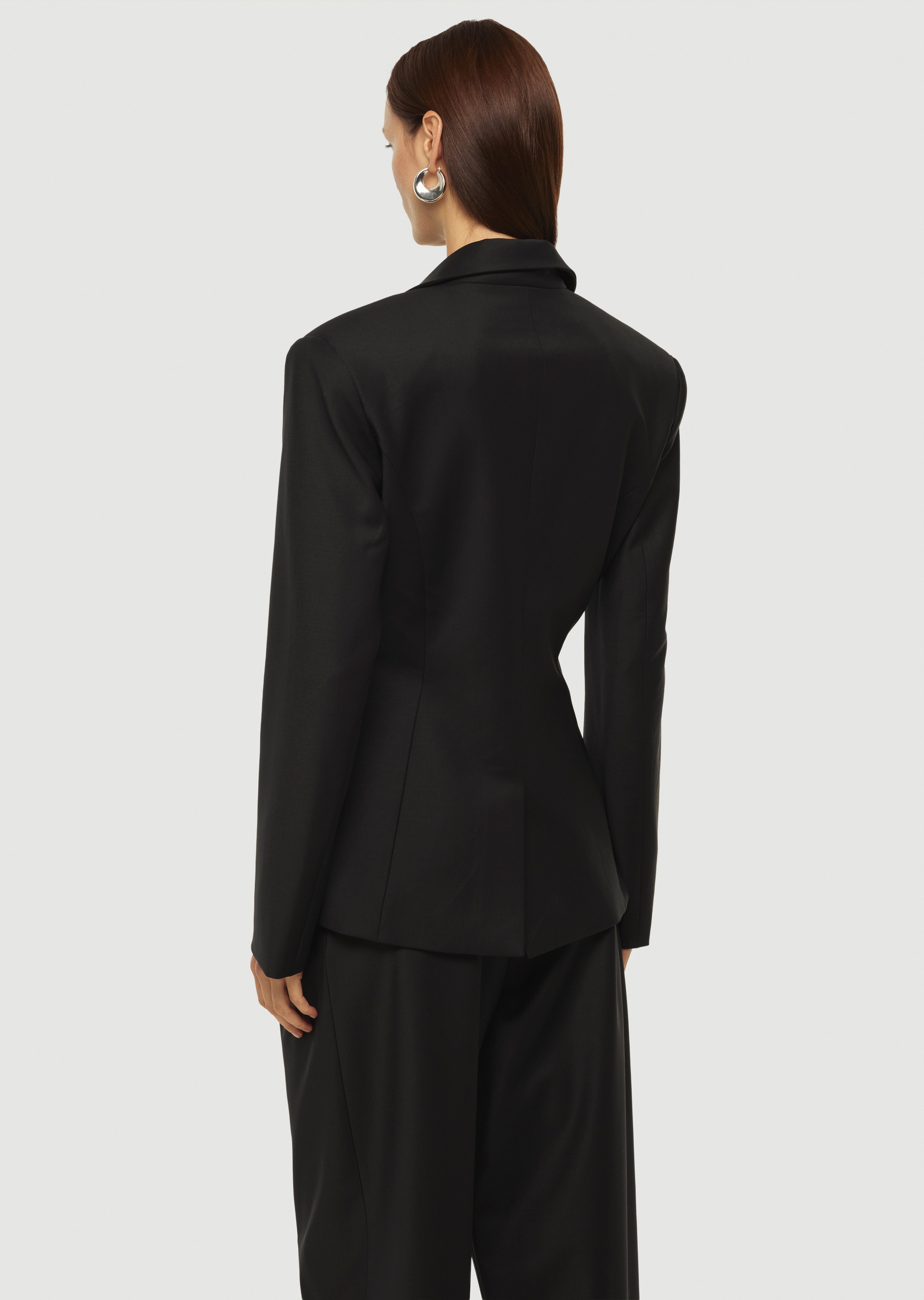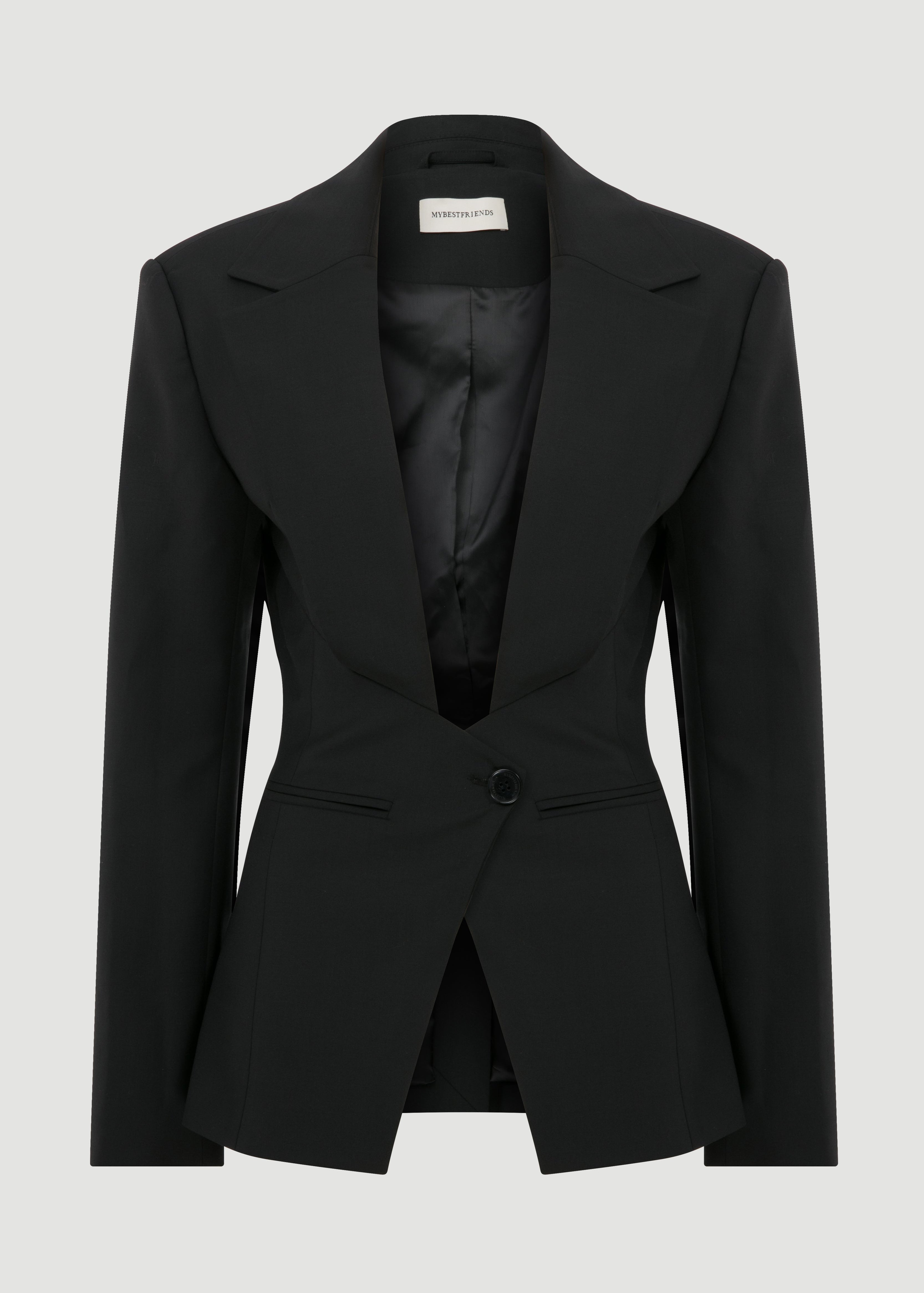Derin V-dekolteli, kapama yeri üçgen detaylı, şık blazer ceket.