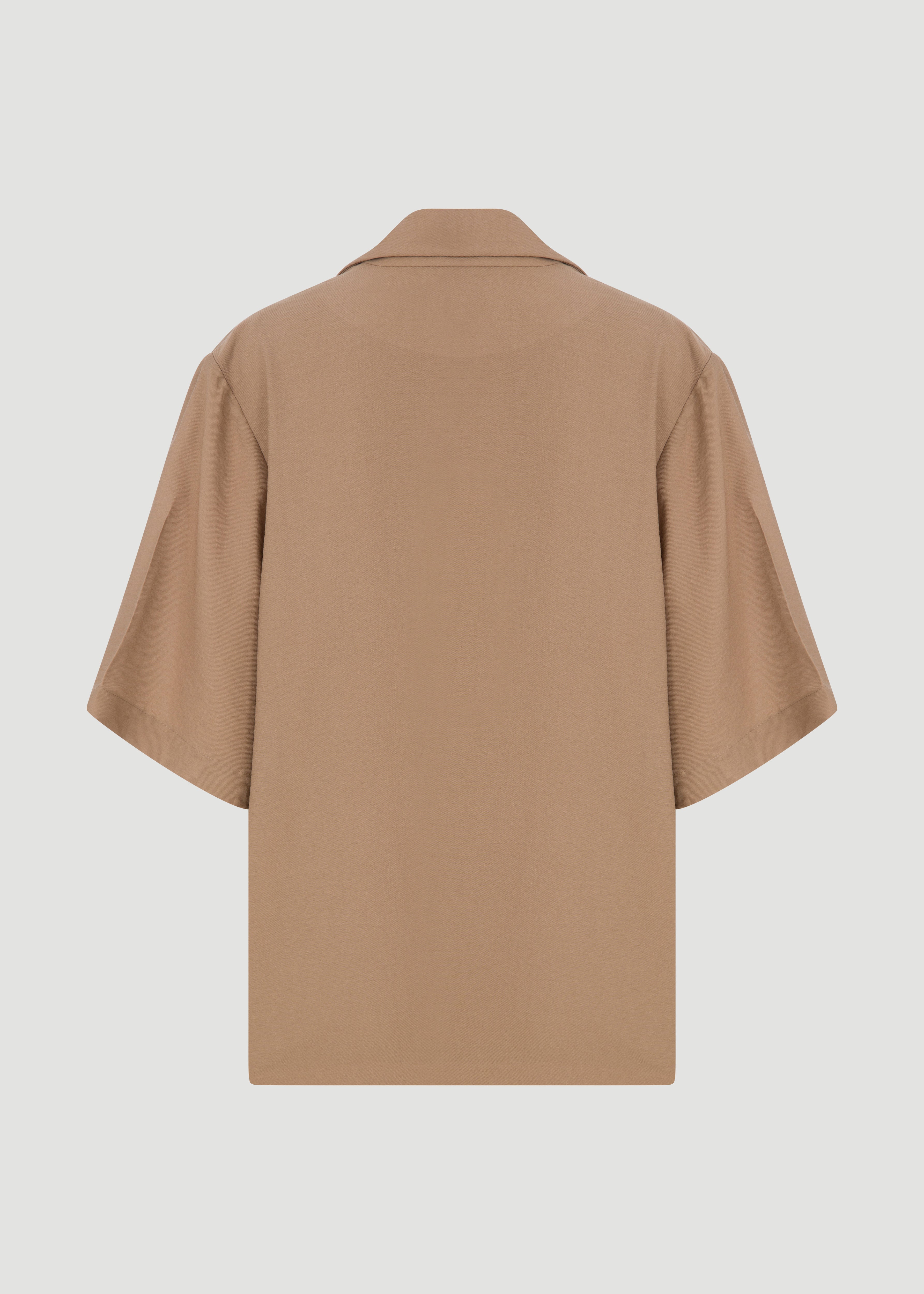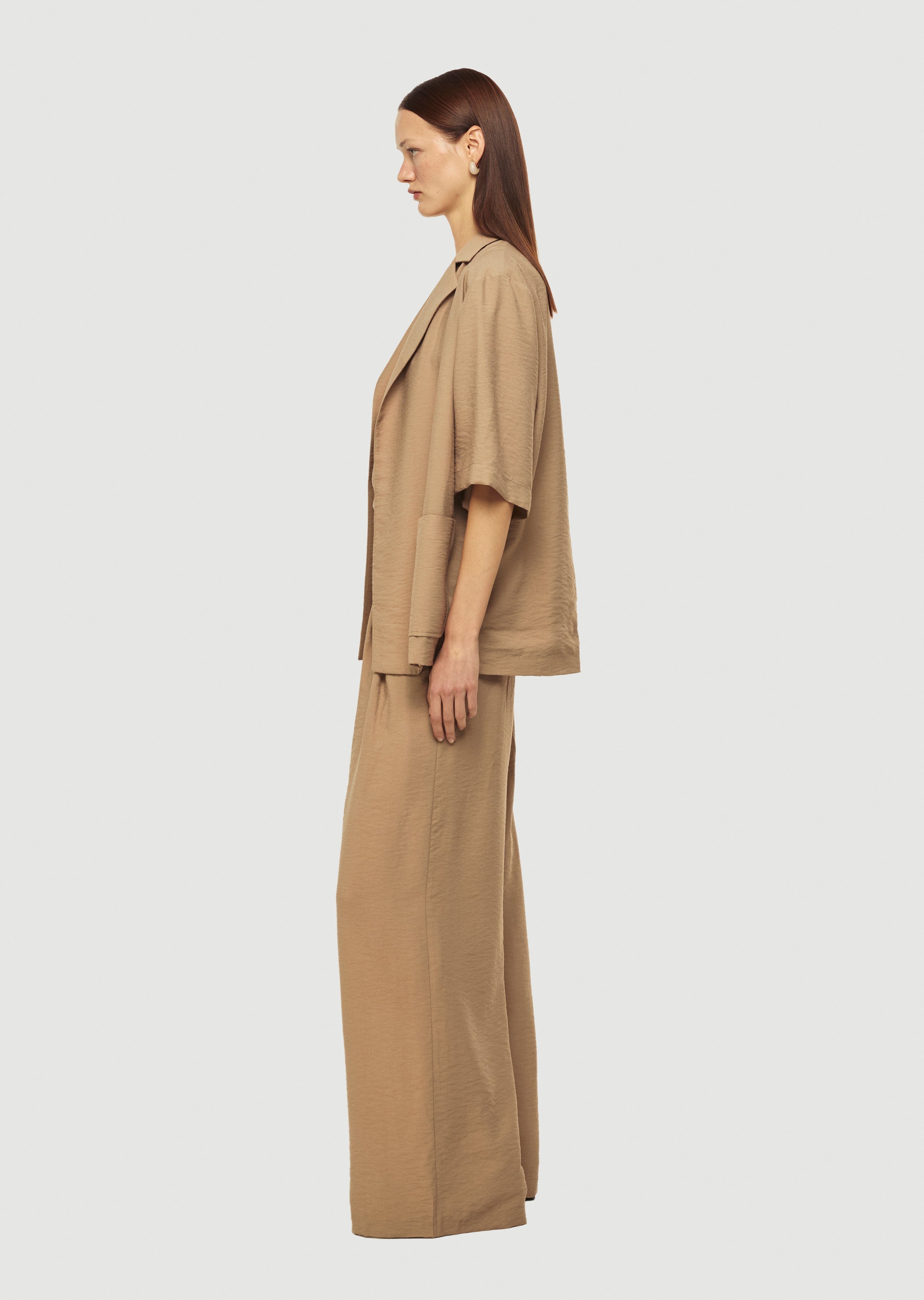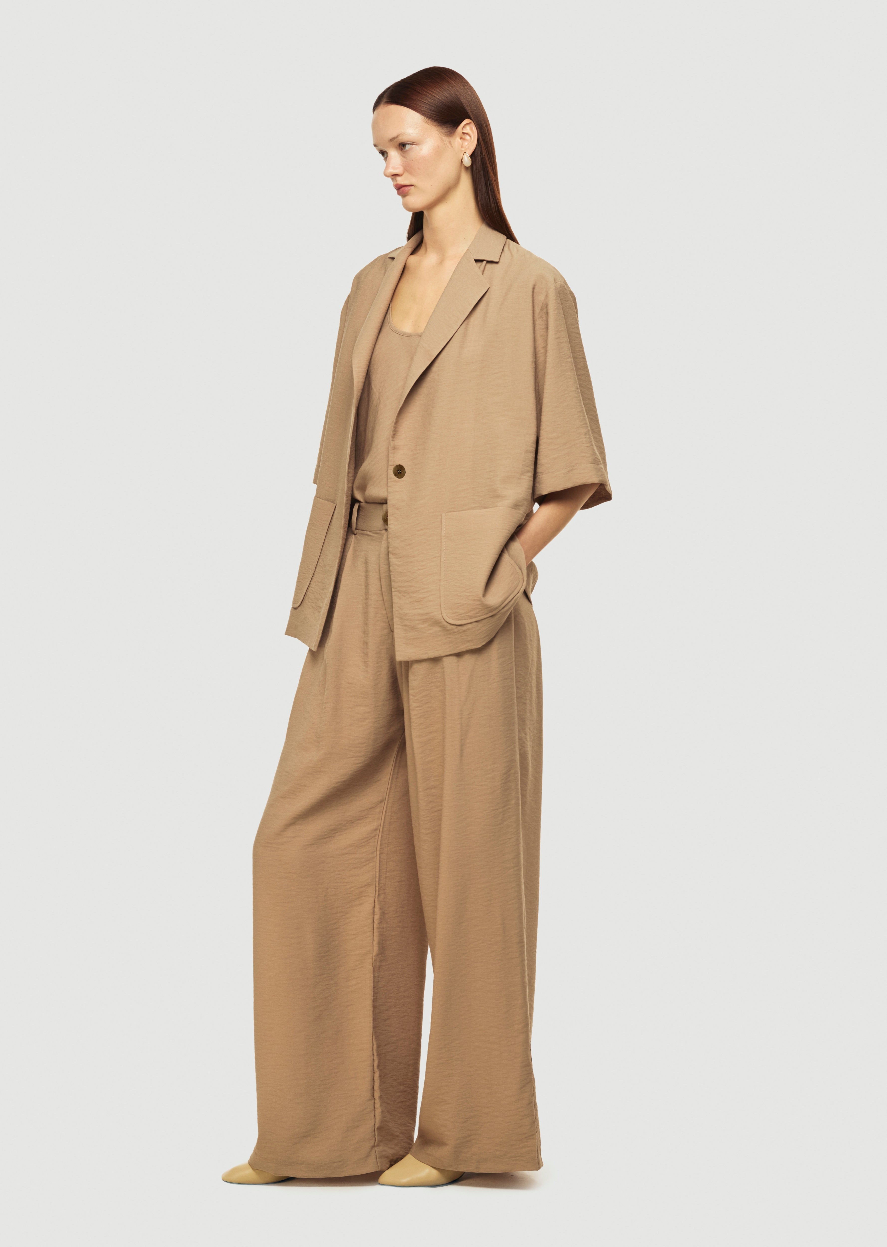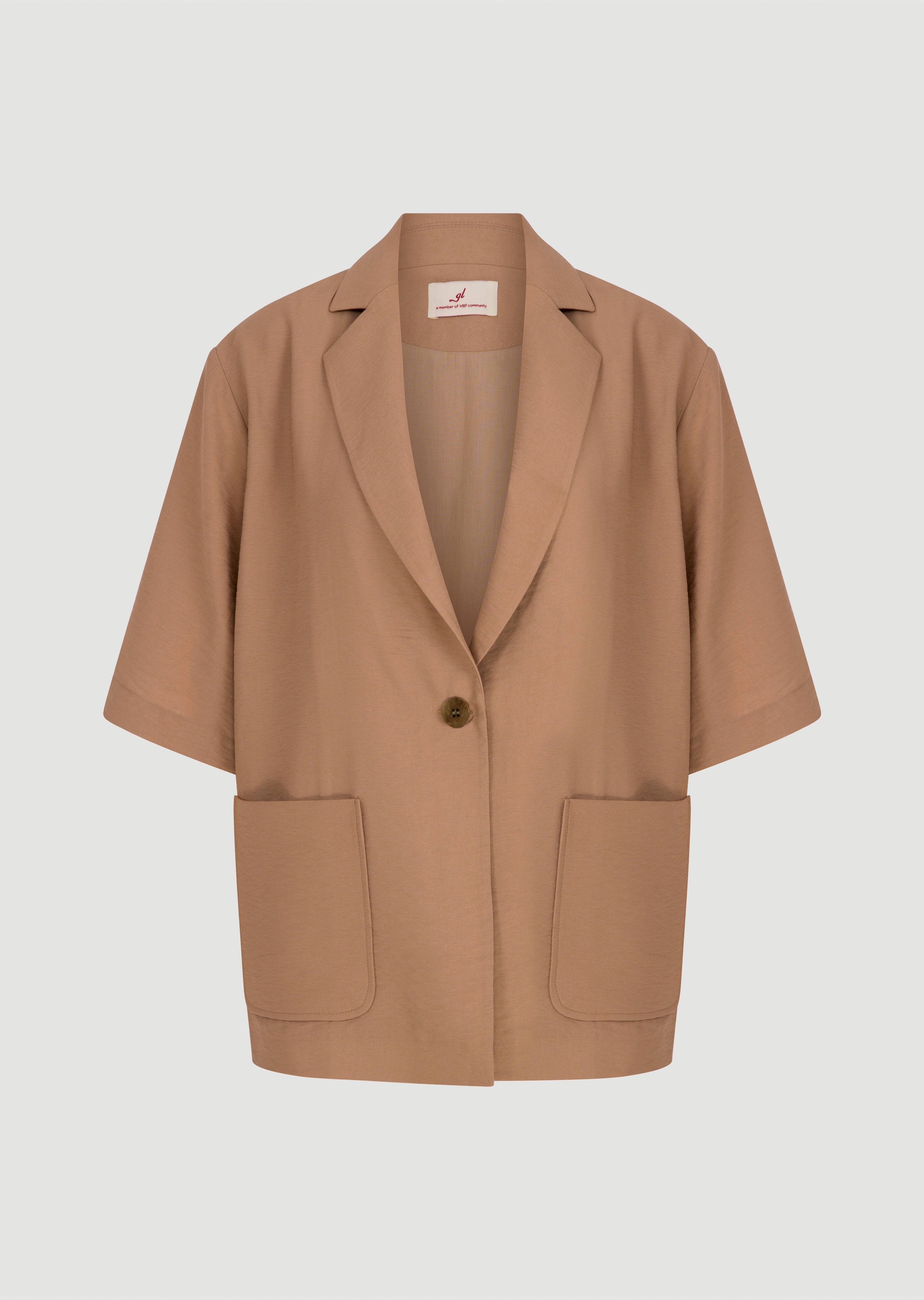Kısa kollu, düğmeli ve iki cep detaylı rahat kesim ceket.