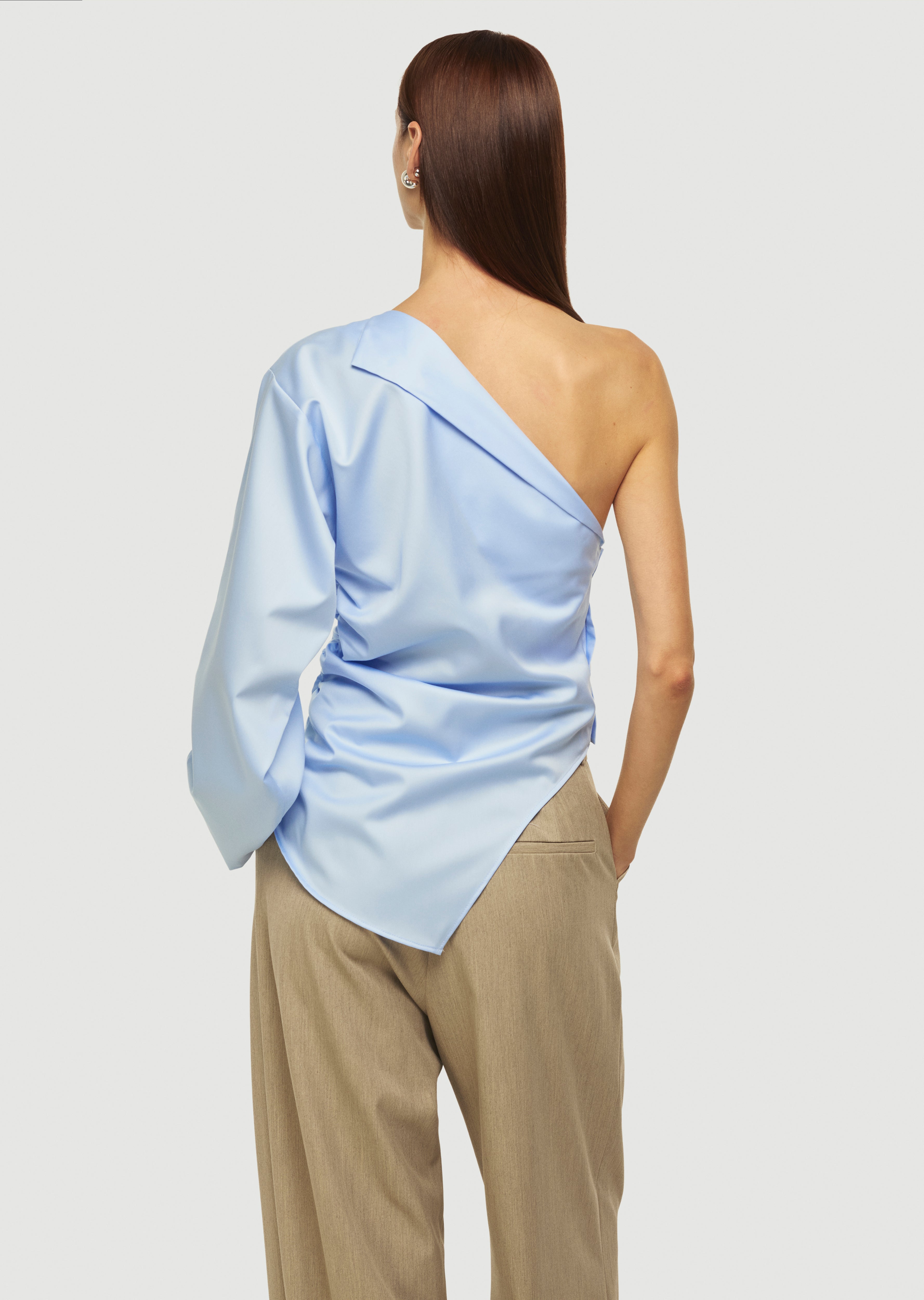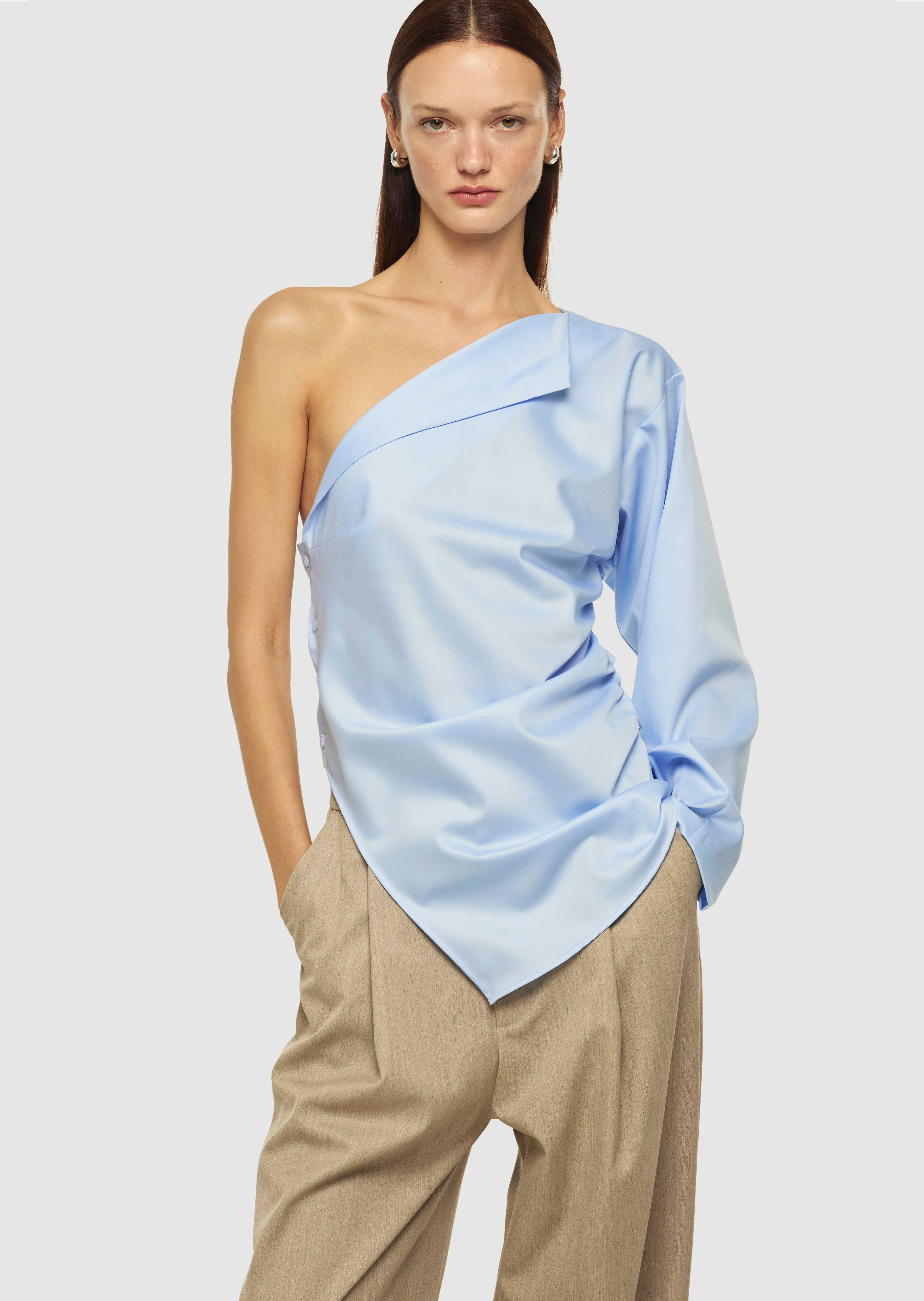 Tek omuz, asimetrik kesim ve yaka detaylı gömlek.