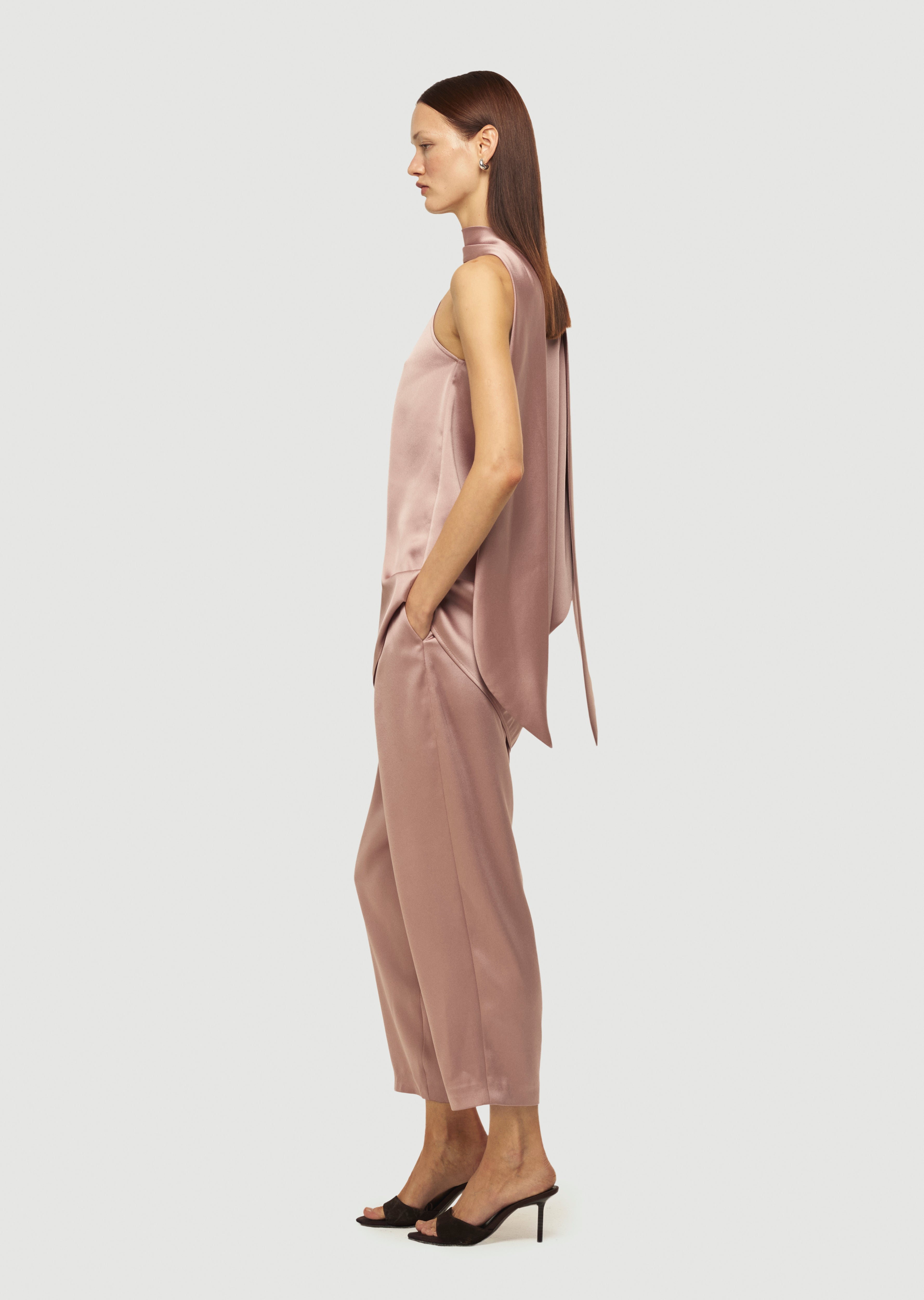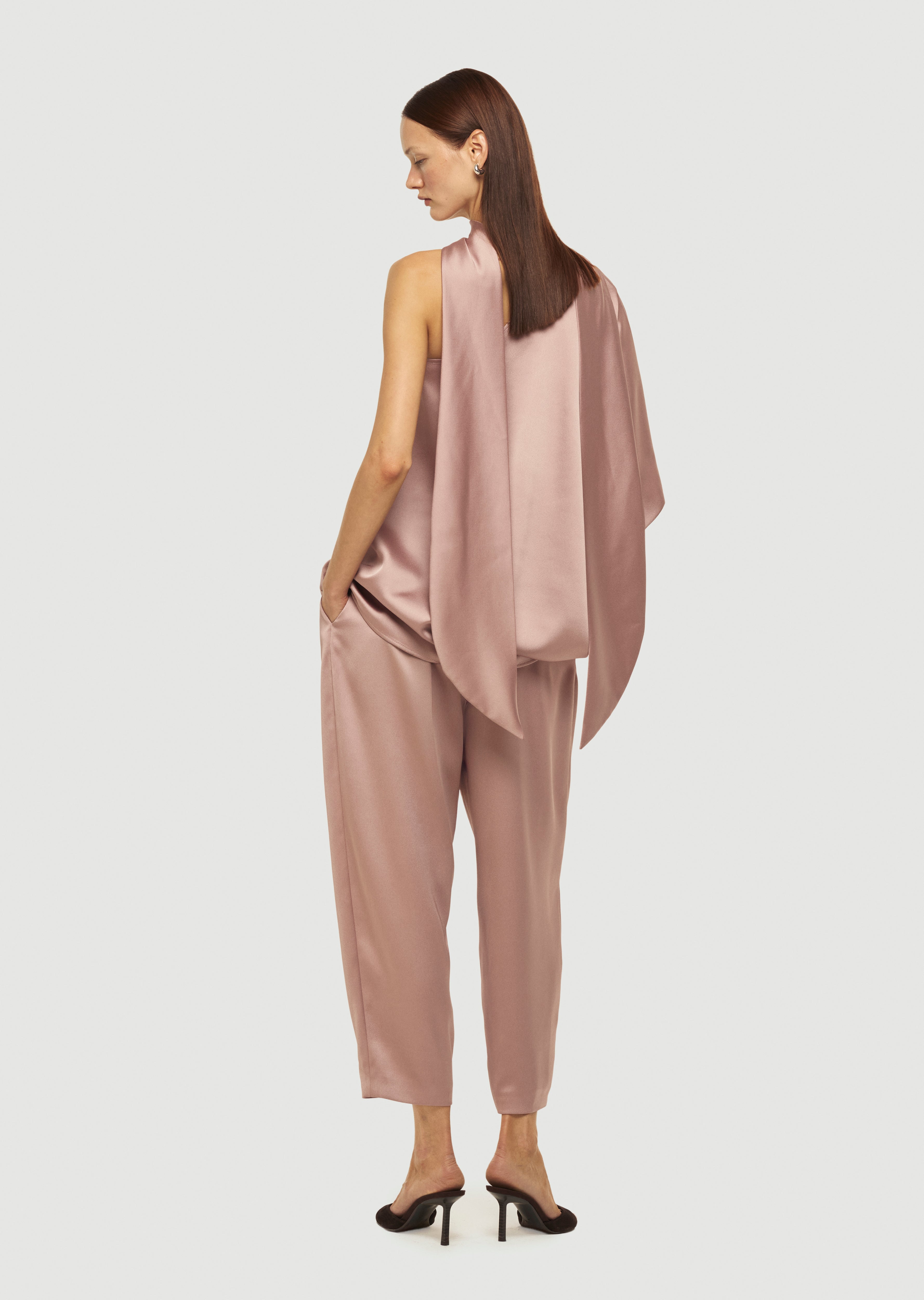 Boynu kendinden fular detaylı, tek omuz düz kesim bluz.