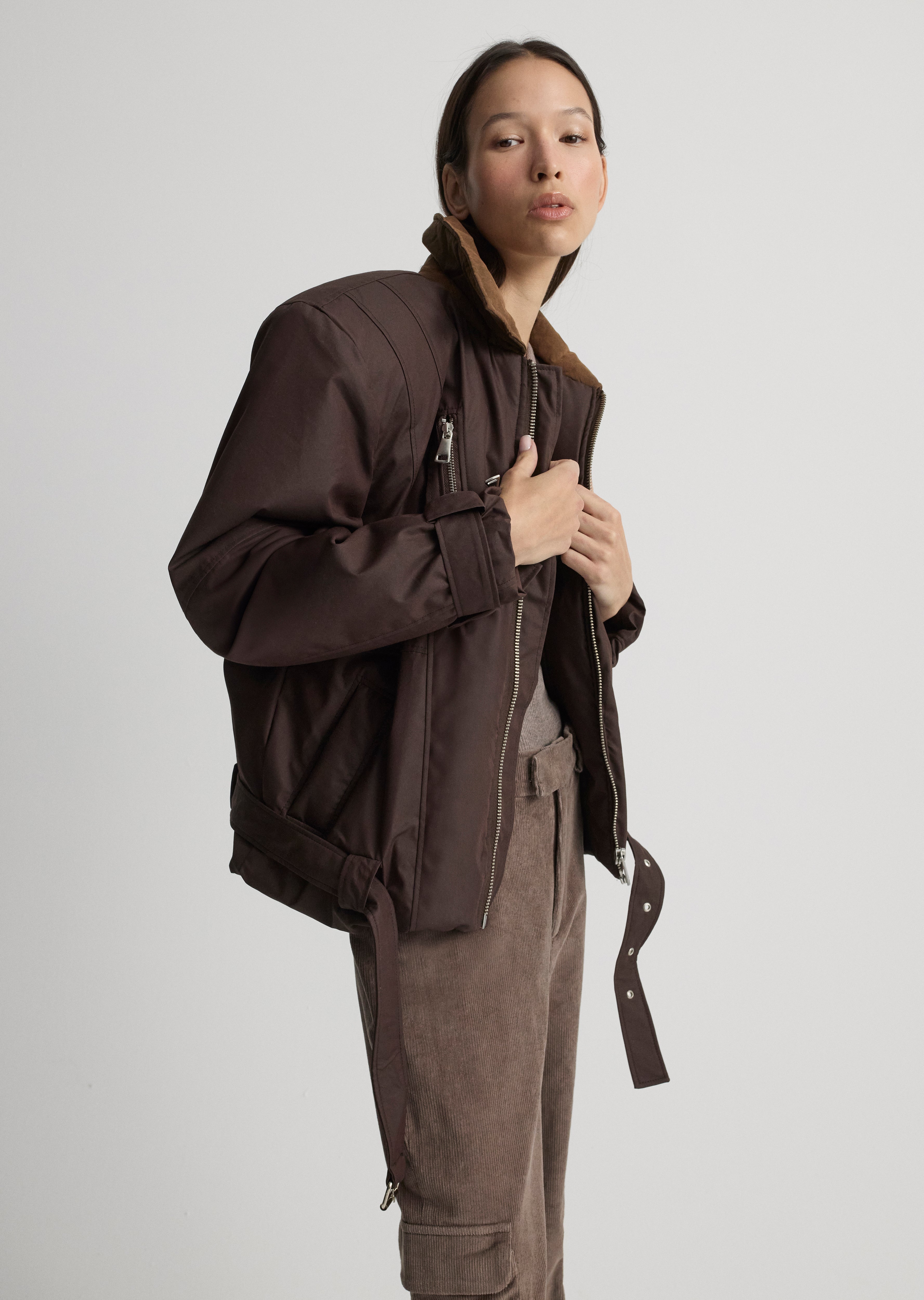Vatkalı, metal fermuar detaylı, oversize ceket.