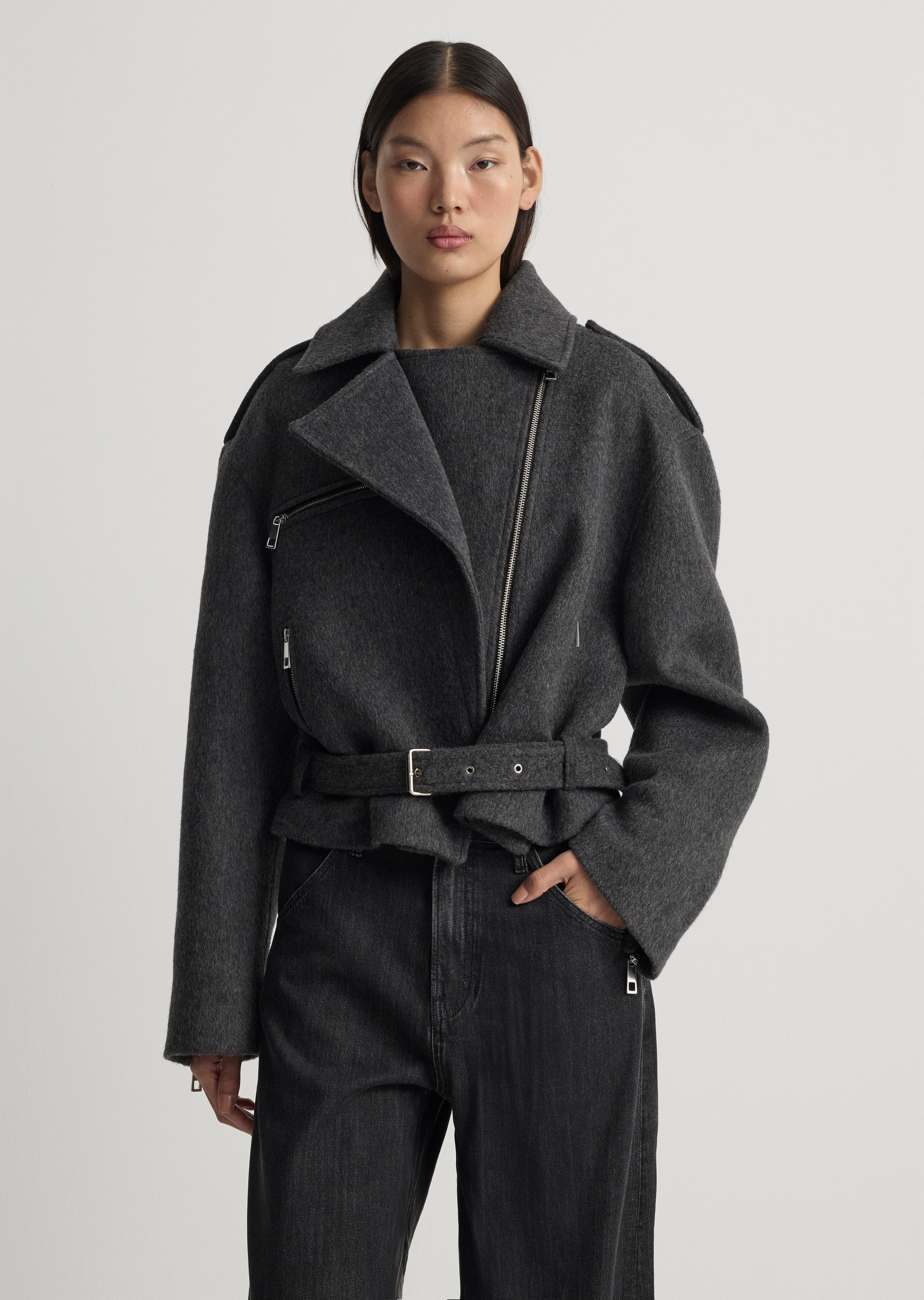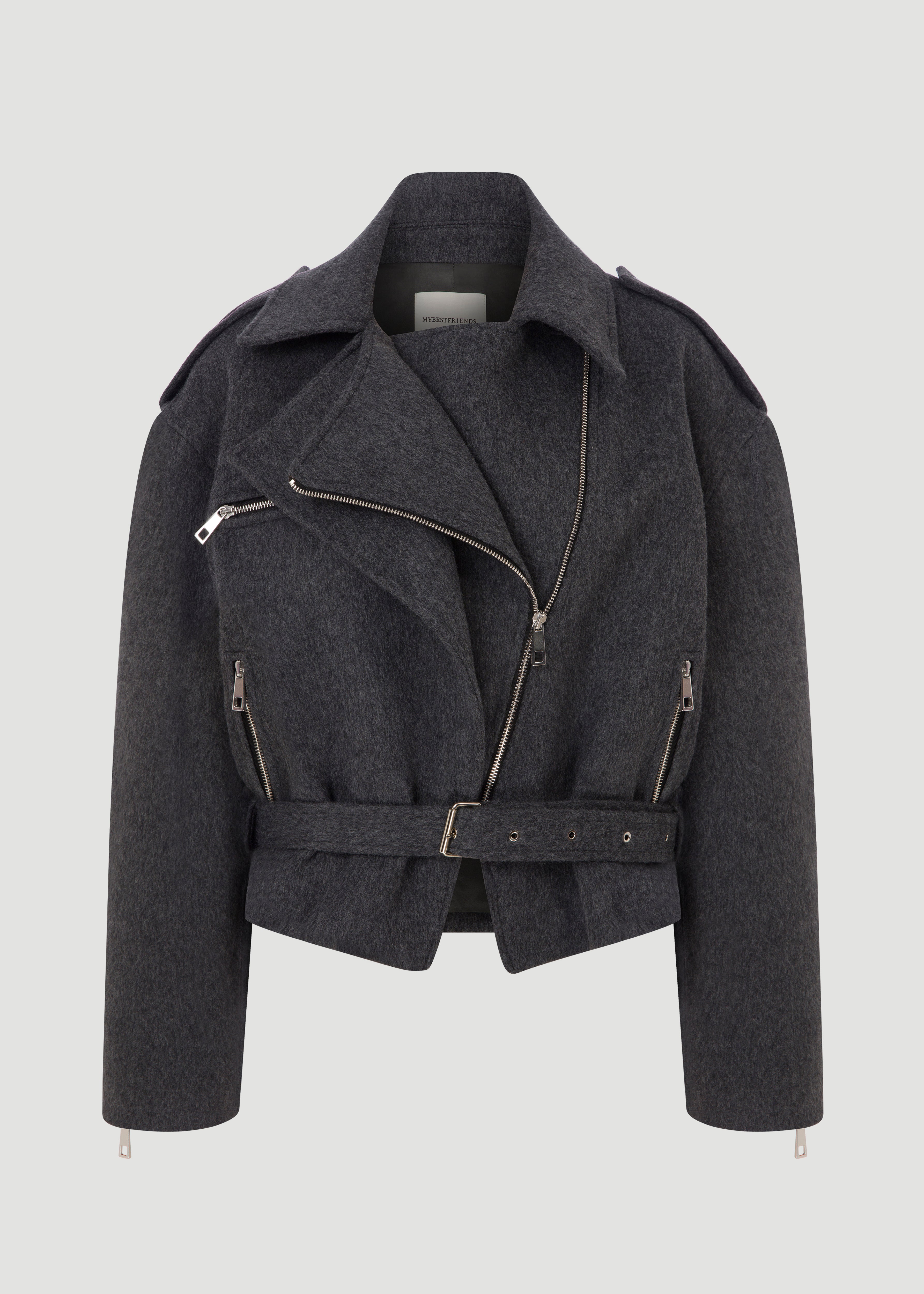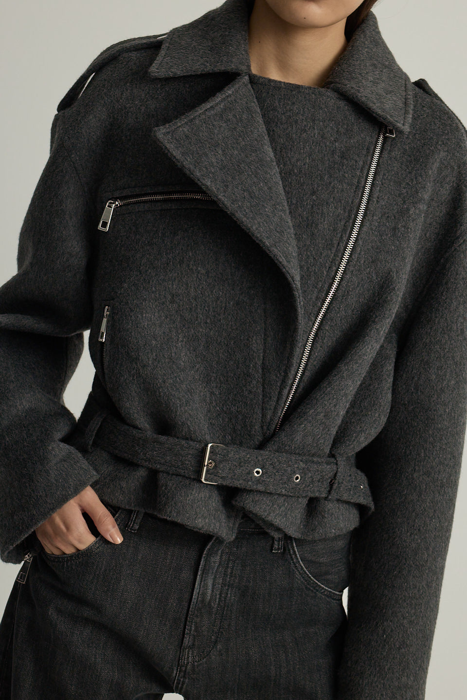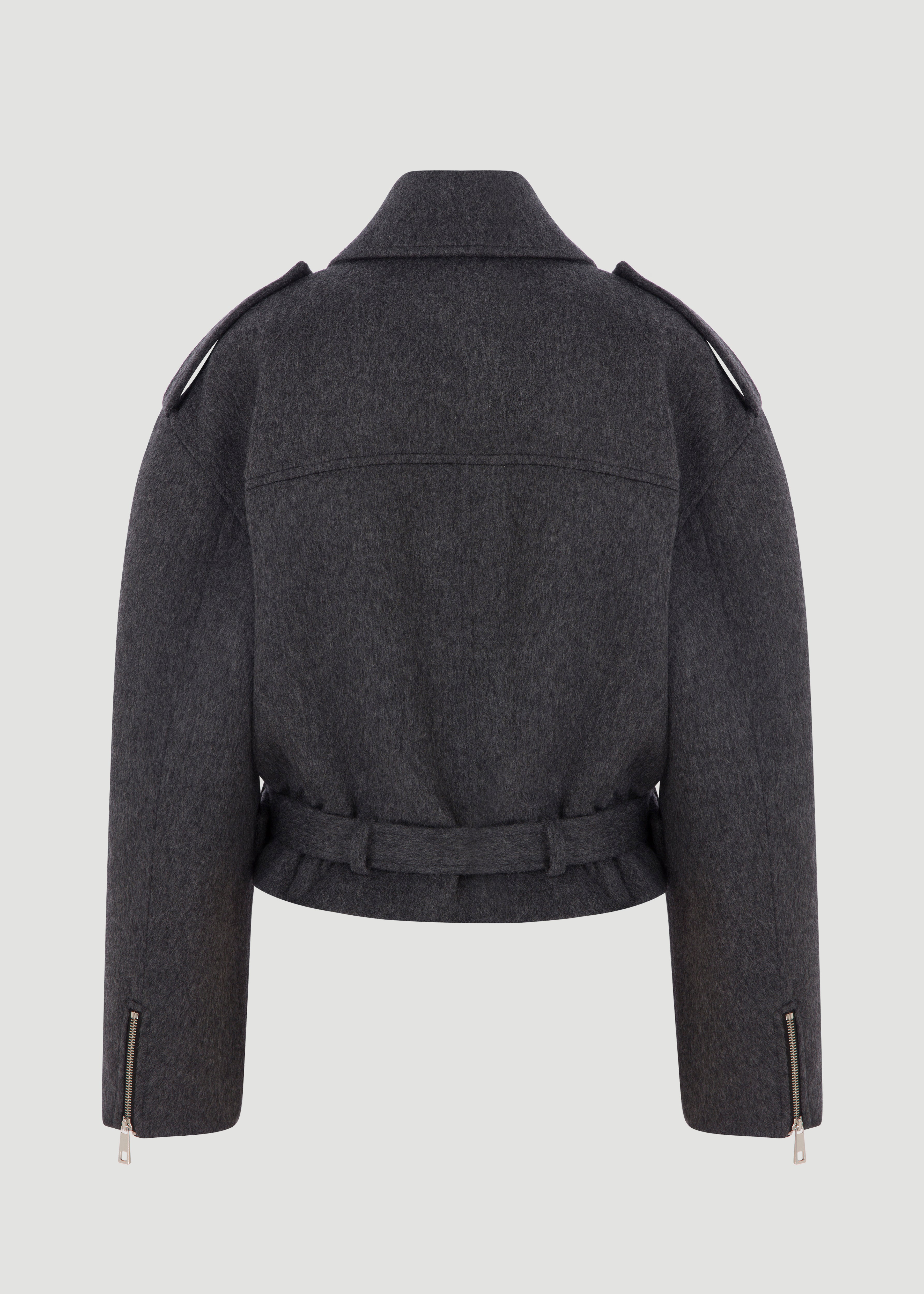 Beli kuşaklı, fermuar detaylı, yün kumaştan, oversize kesim, kısa kaban.