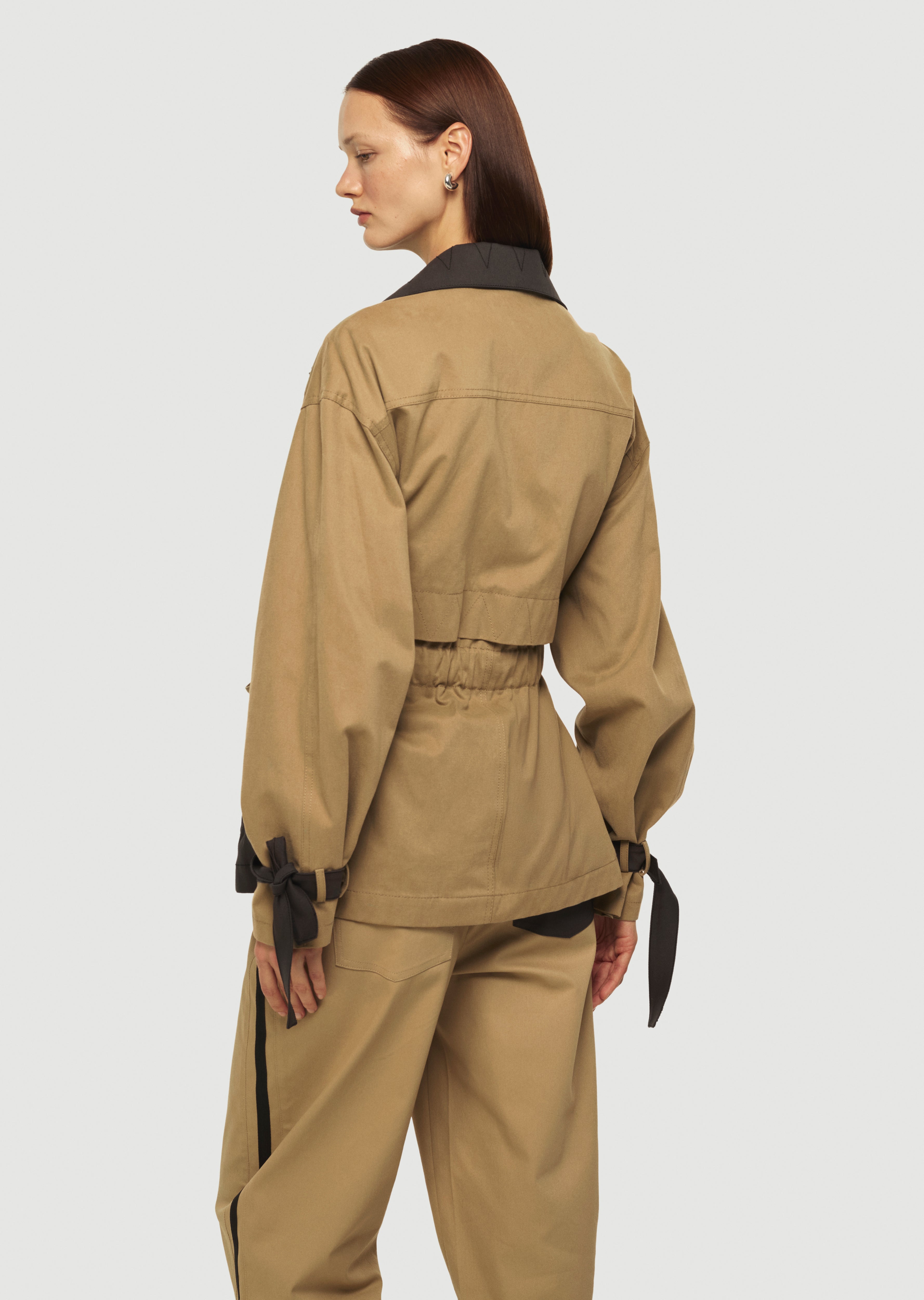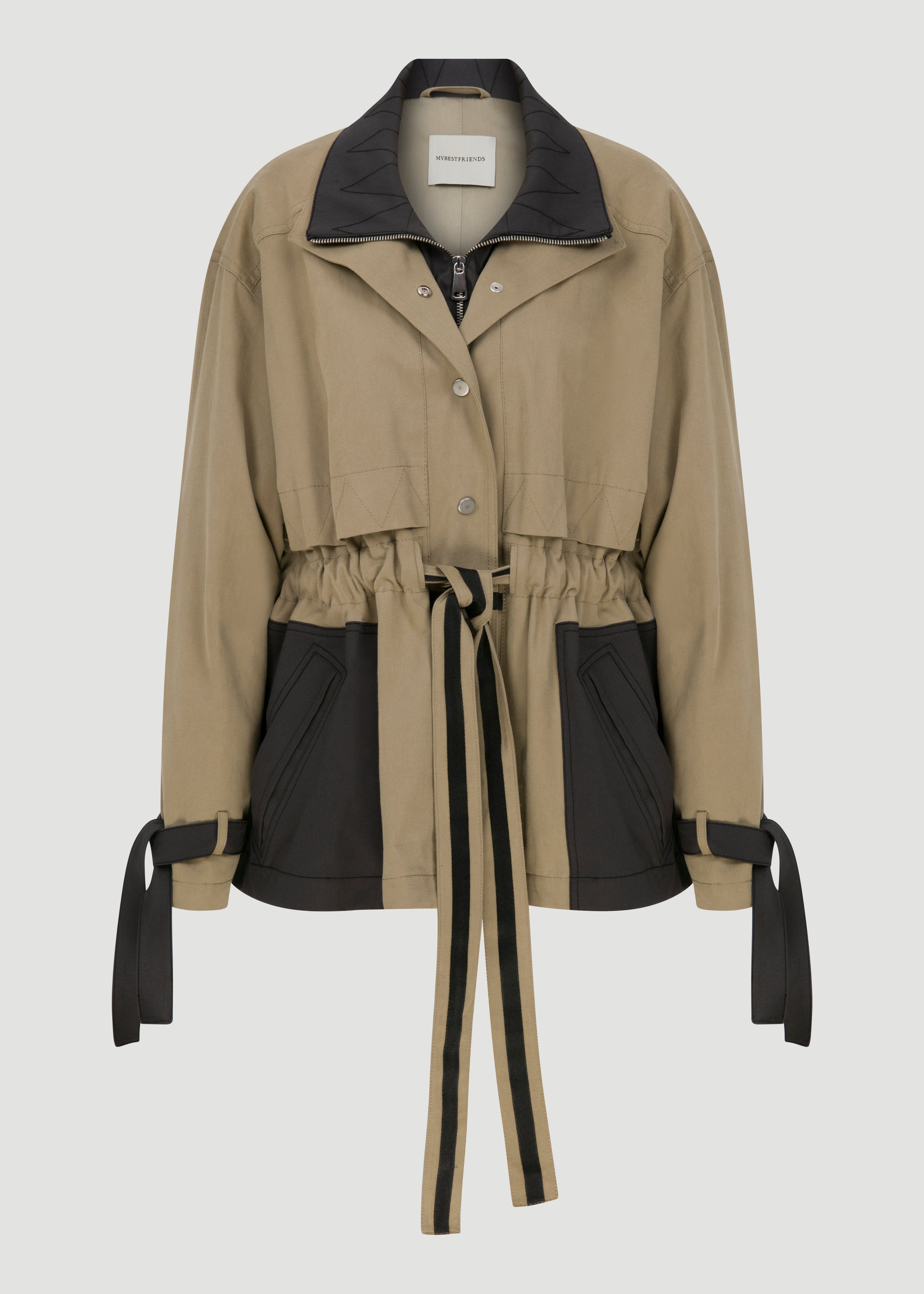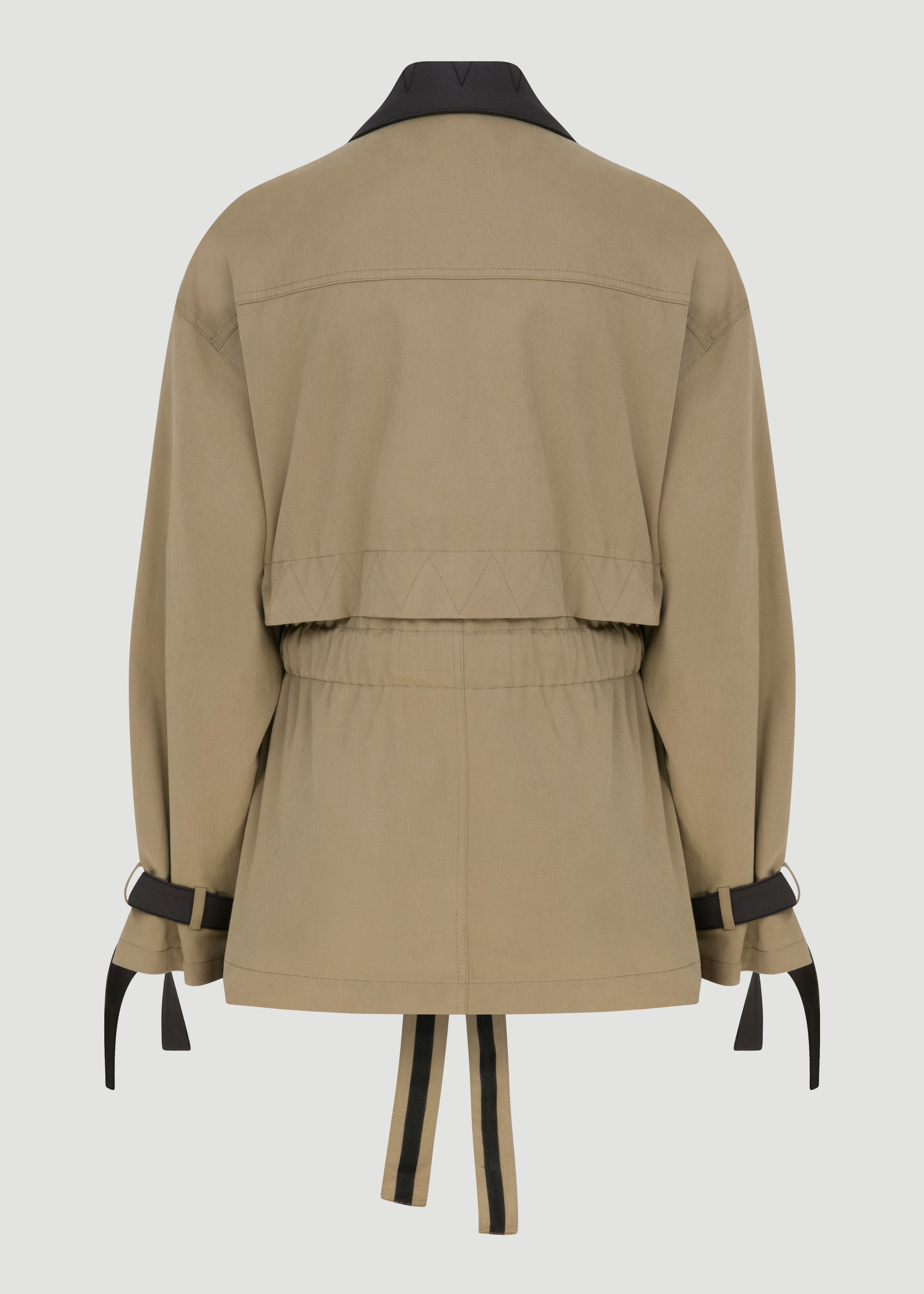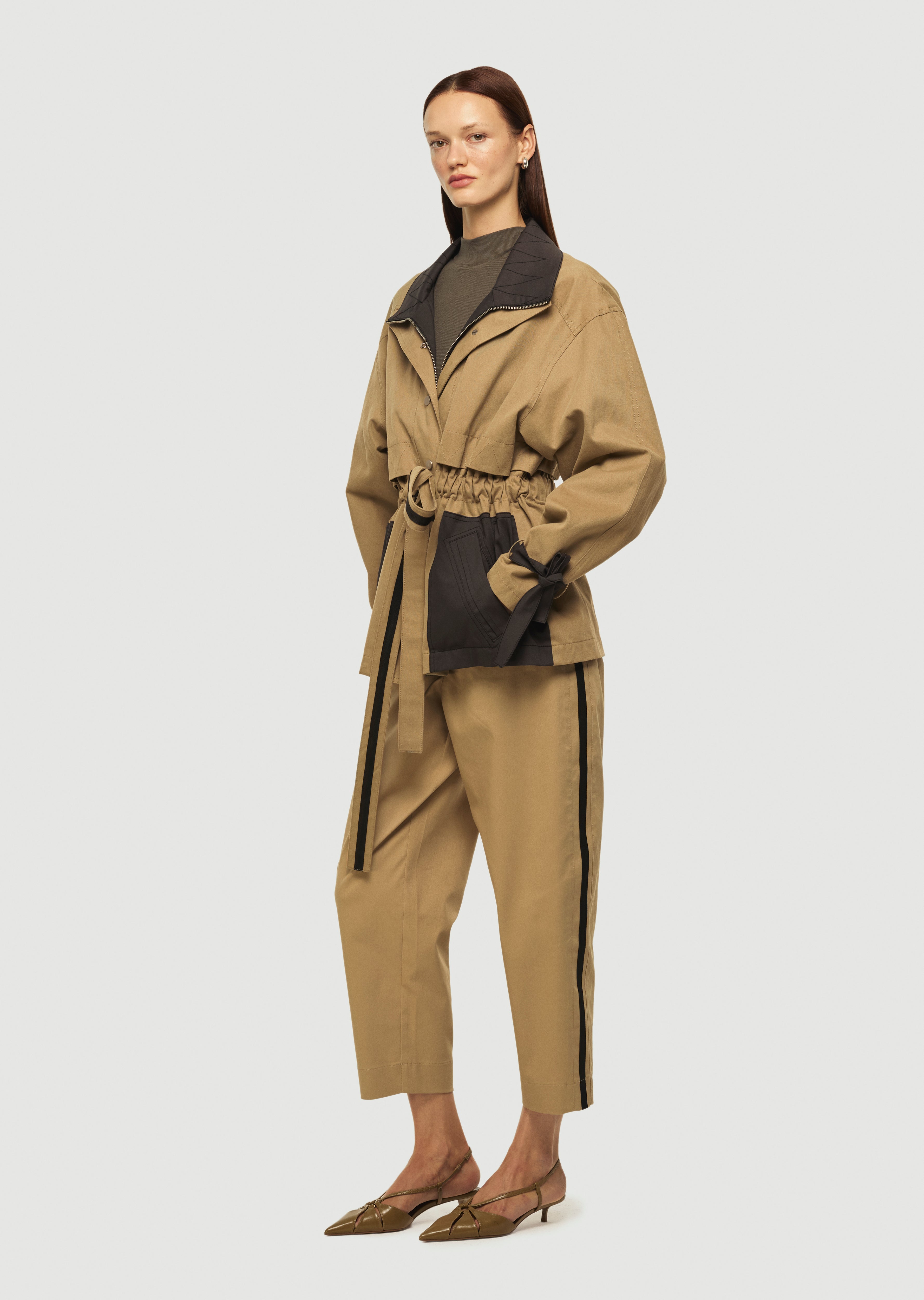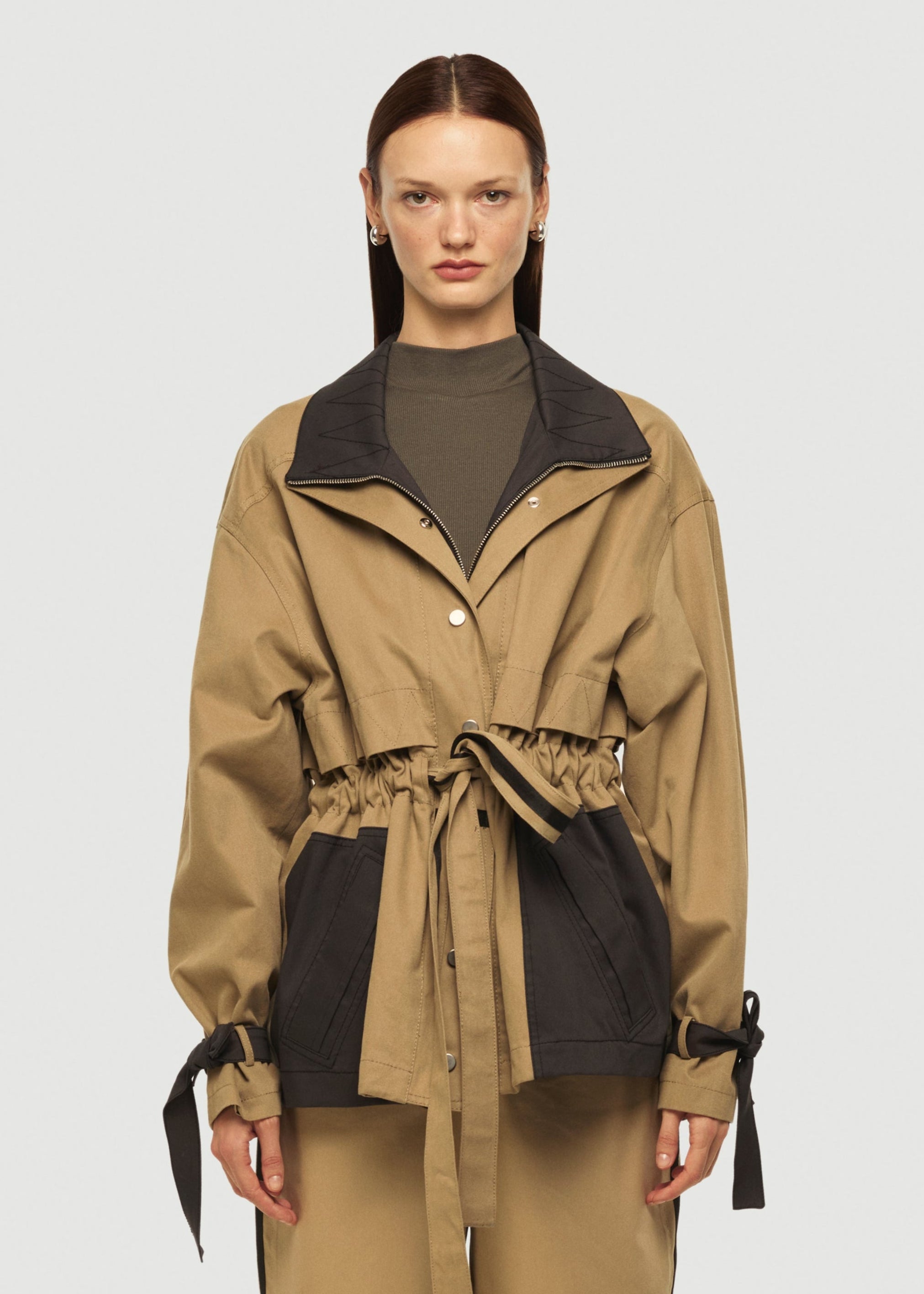 Kontrast cep ve yaka detaylı, bele oturan trençkot.