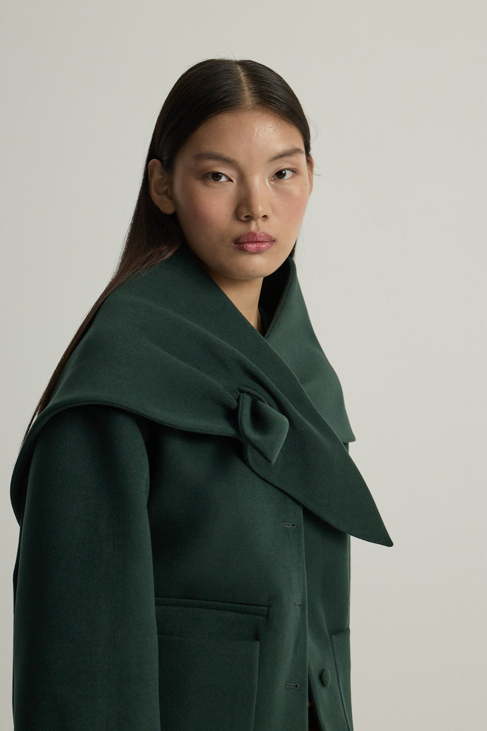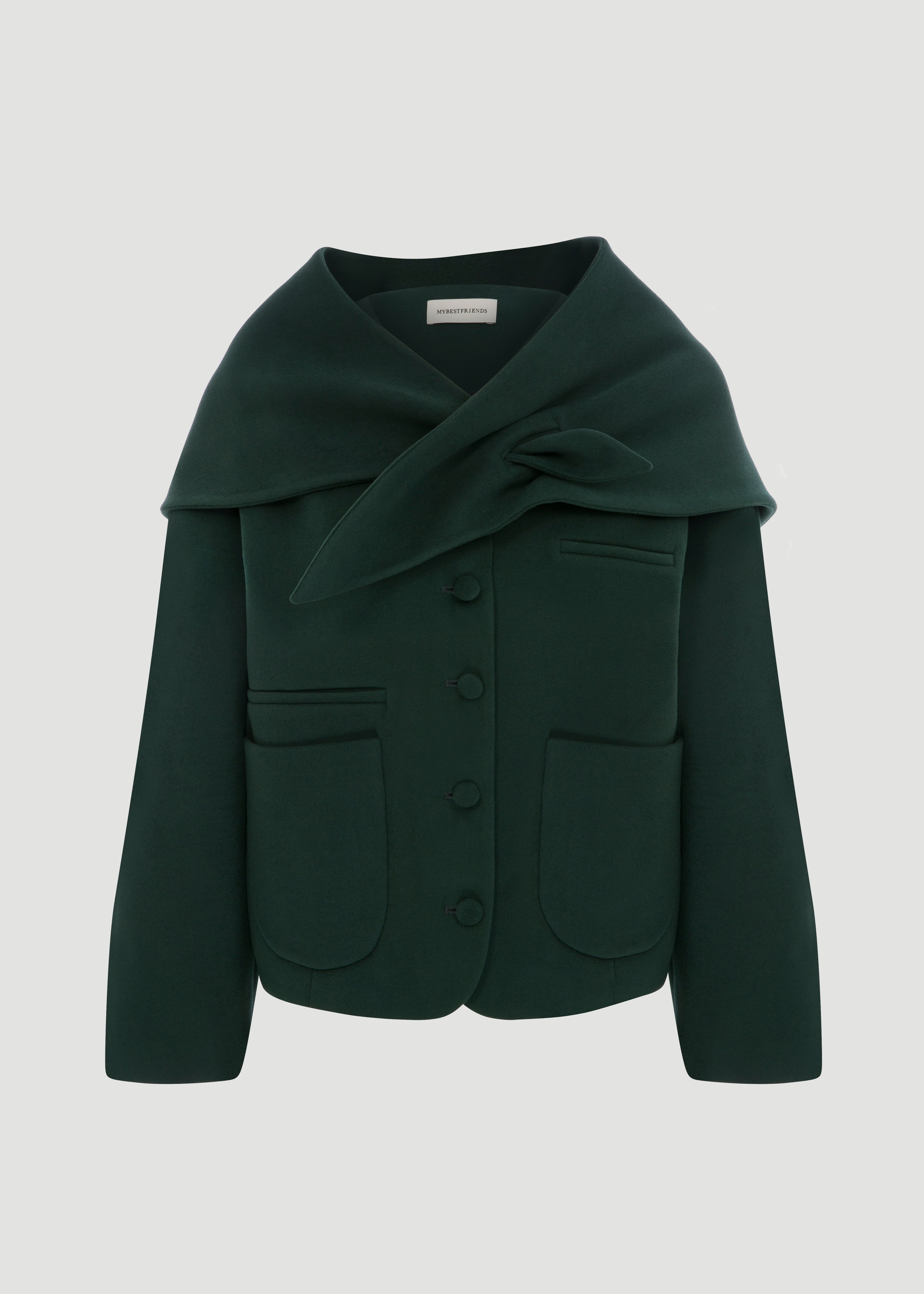 Bağlamalı büyük yaka ve cep detaylı ceket.