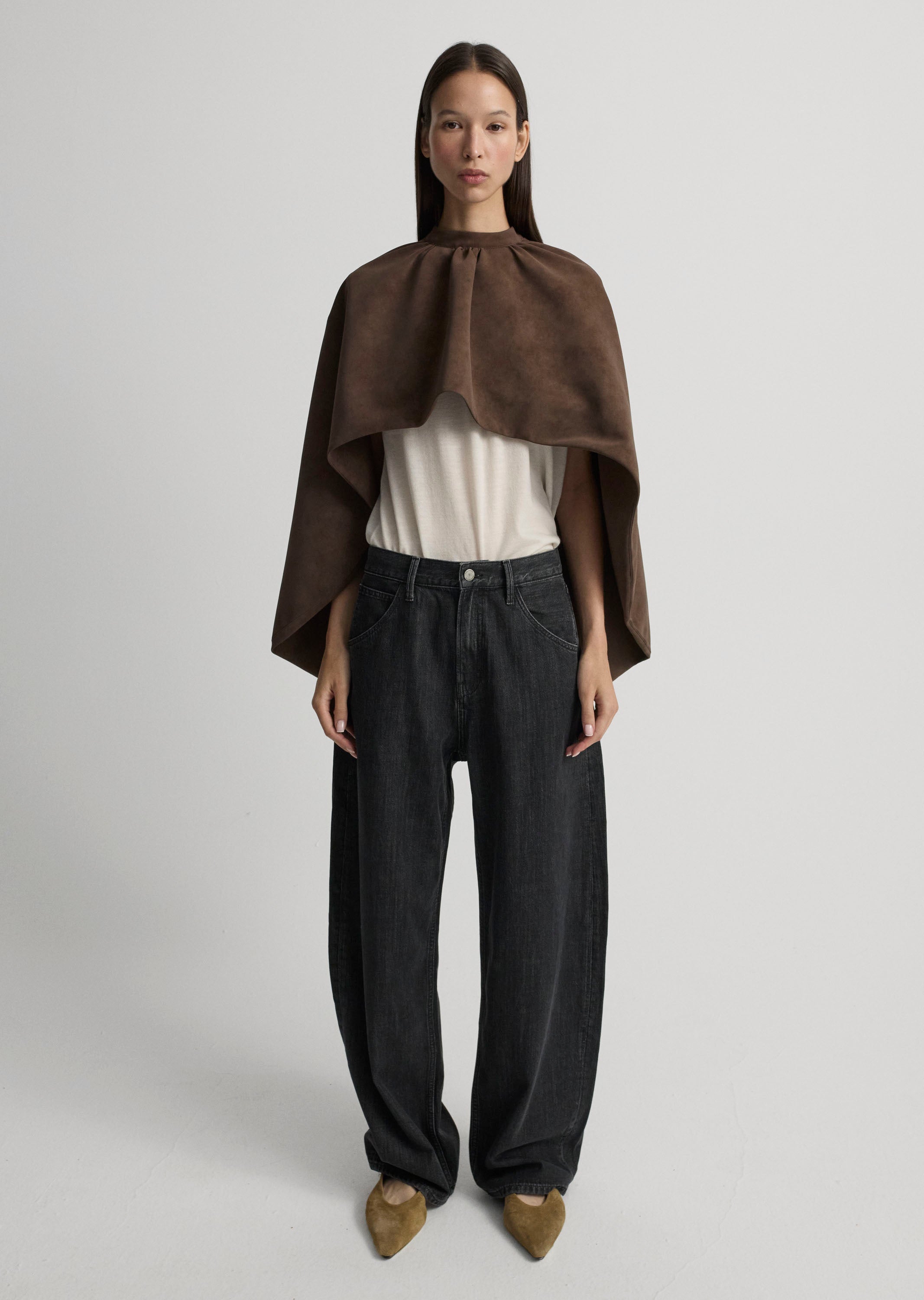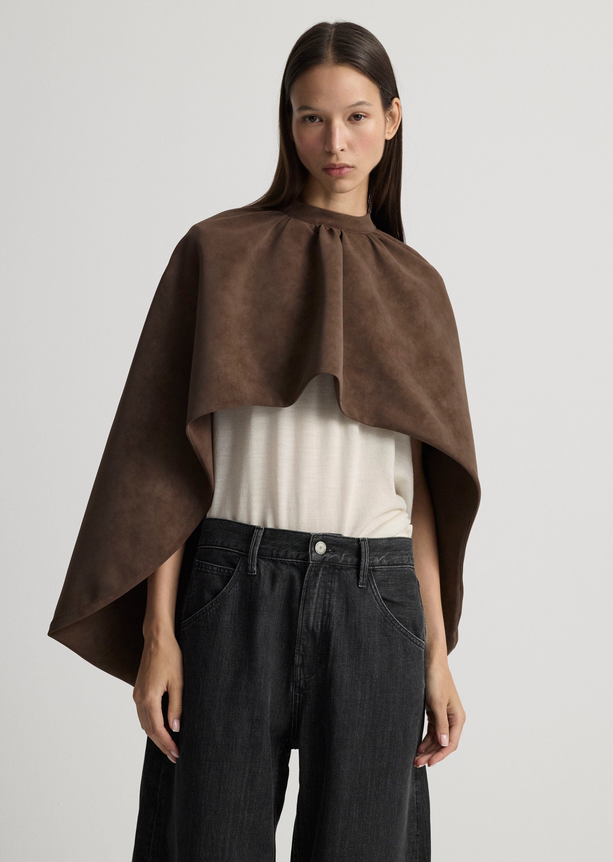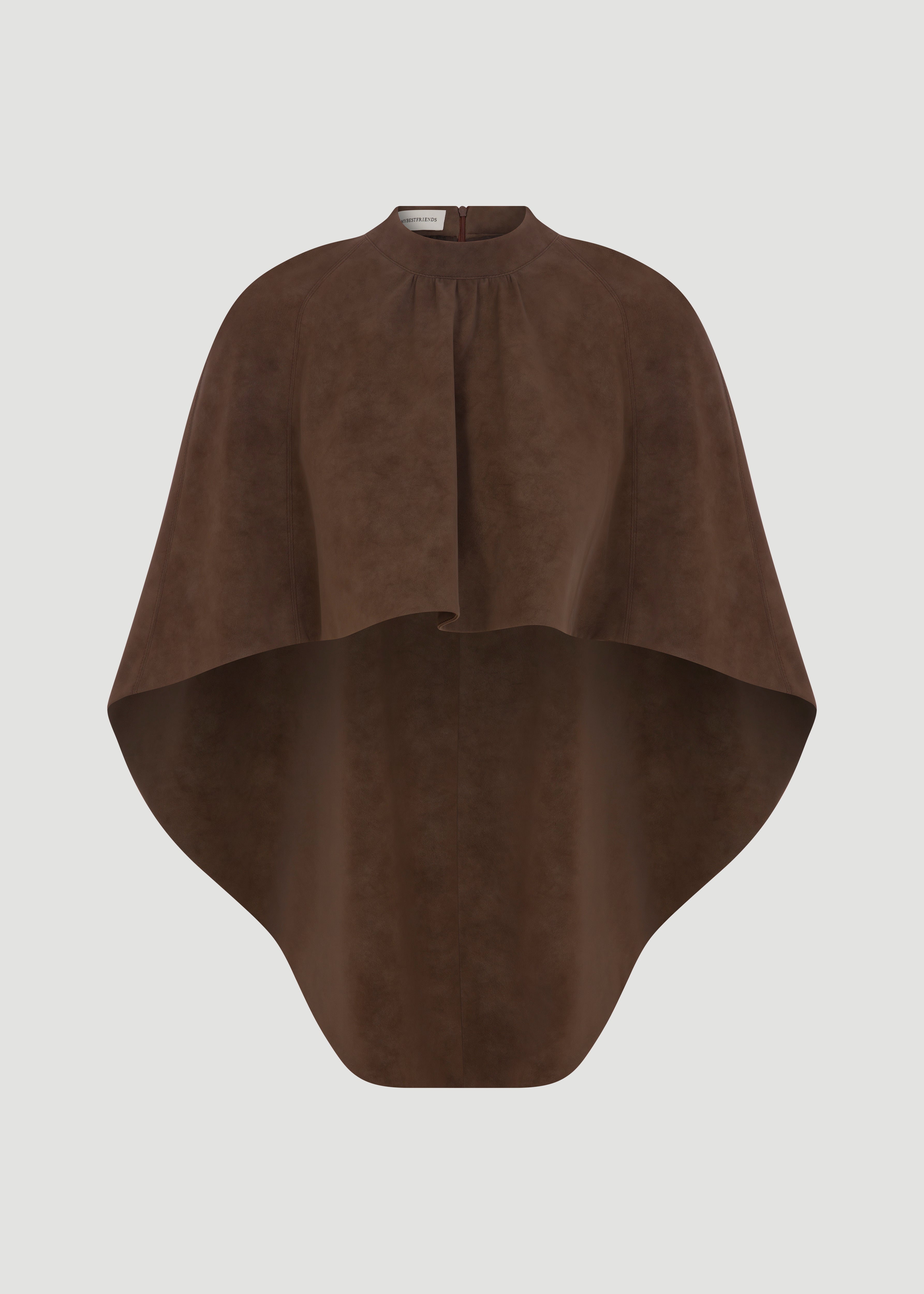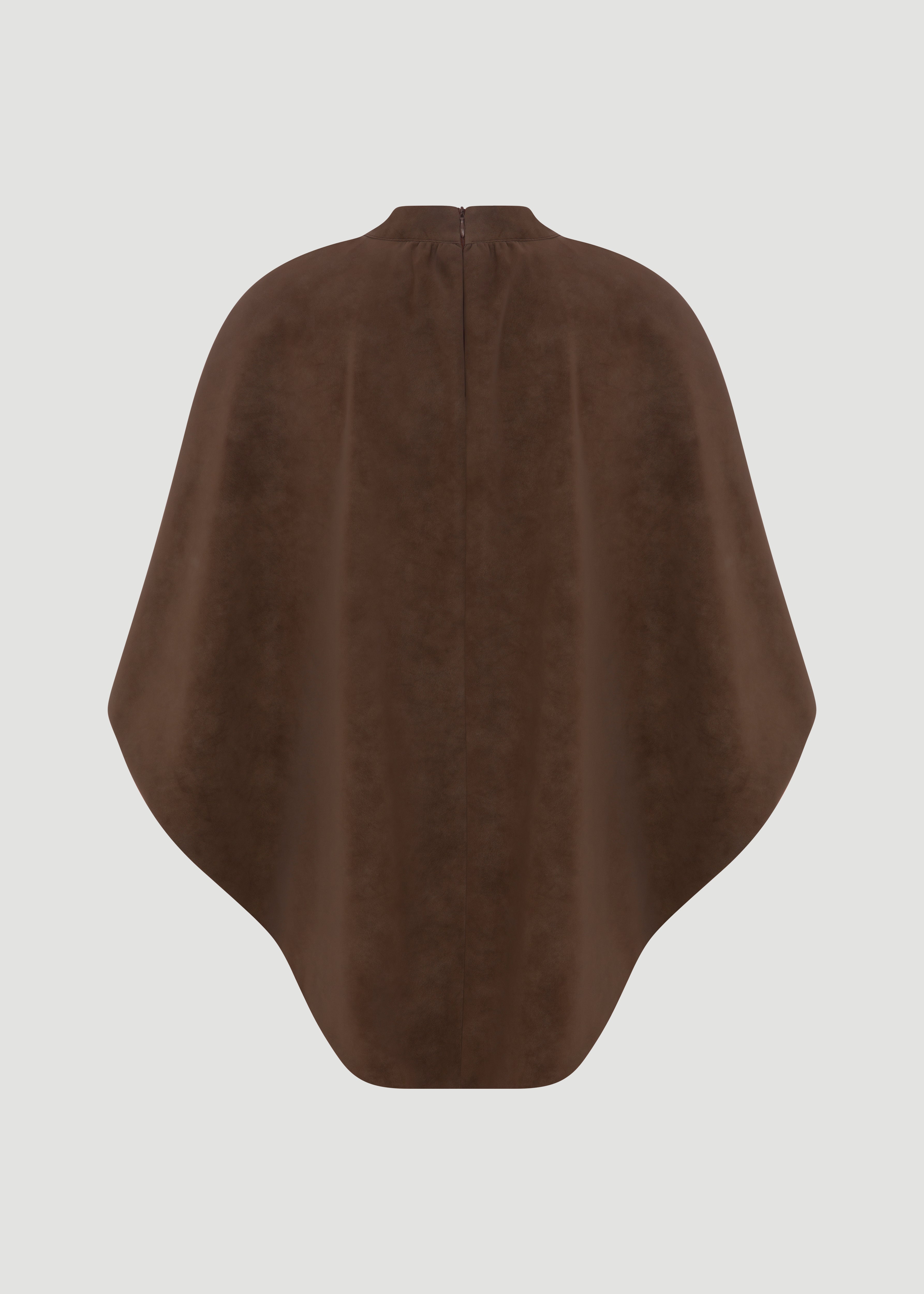 Yükse yakalı, boyun kısmı büzgü detaylı, önü kısa, arkası uzun panço.