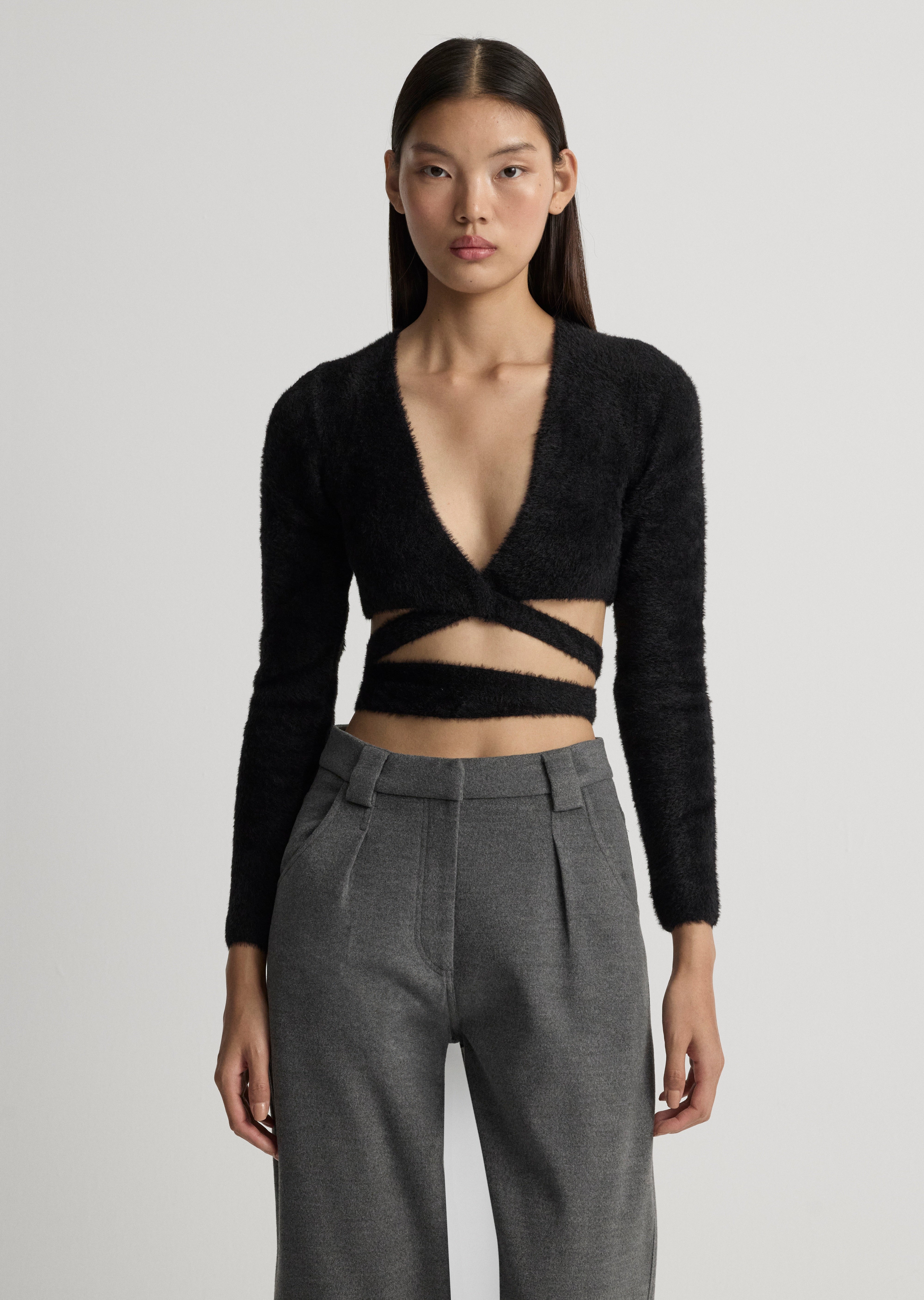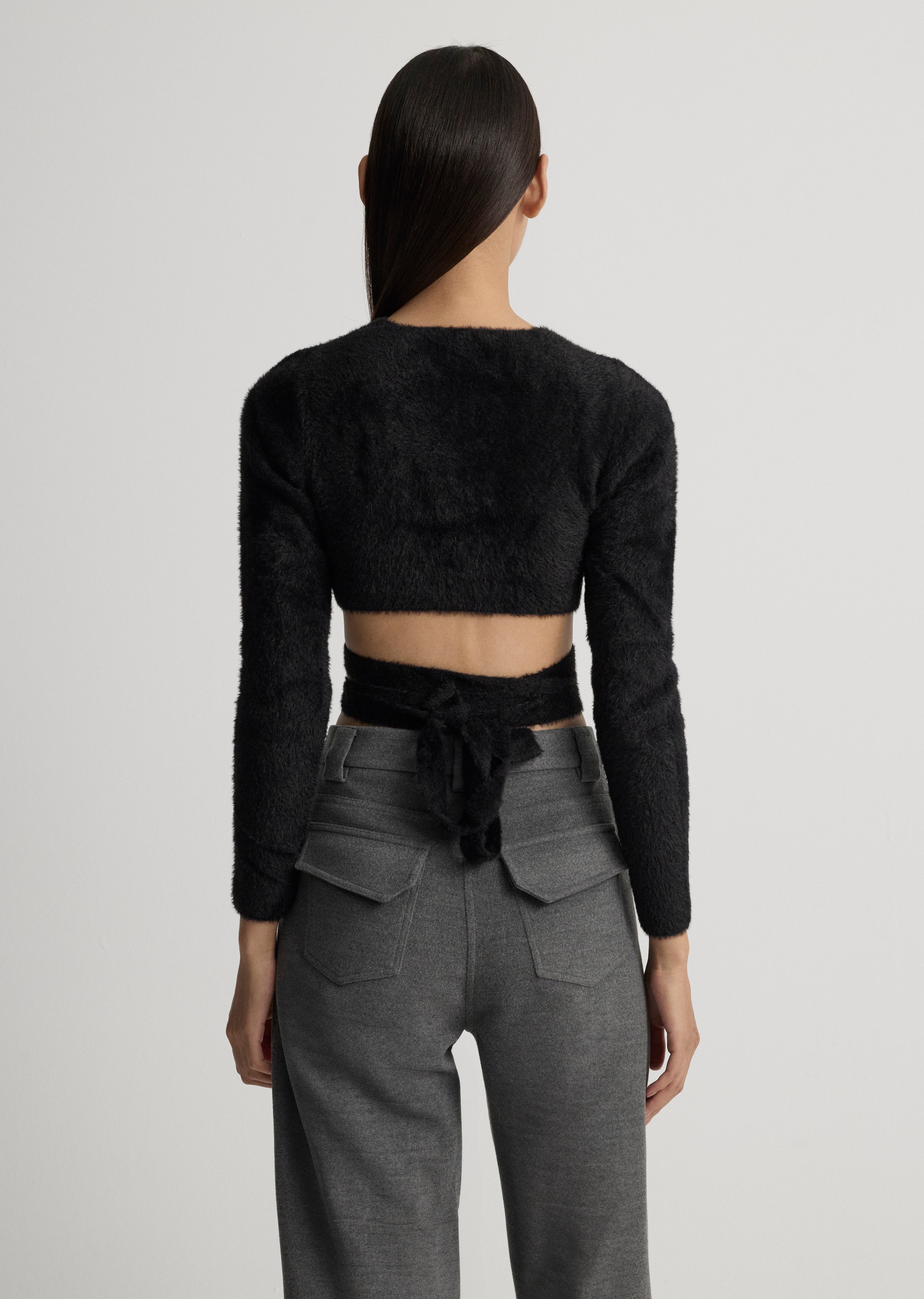 Hem ön hem de arka kısımları farklı modellerde giyilebilen bu hırka, birden fazla bağlama fonksiyonu sunar. Aynı zamanda dolgun dokusu ve ipeksi yumuşaklığı ile ekstra konfor sağlar.