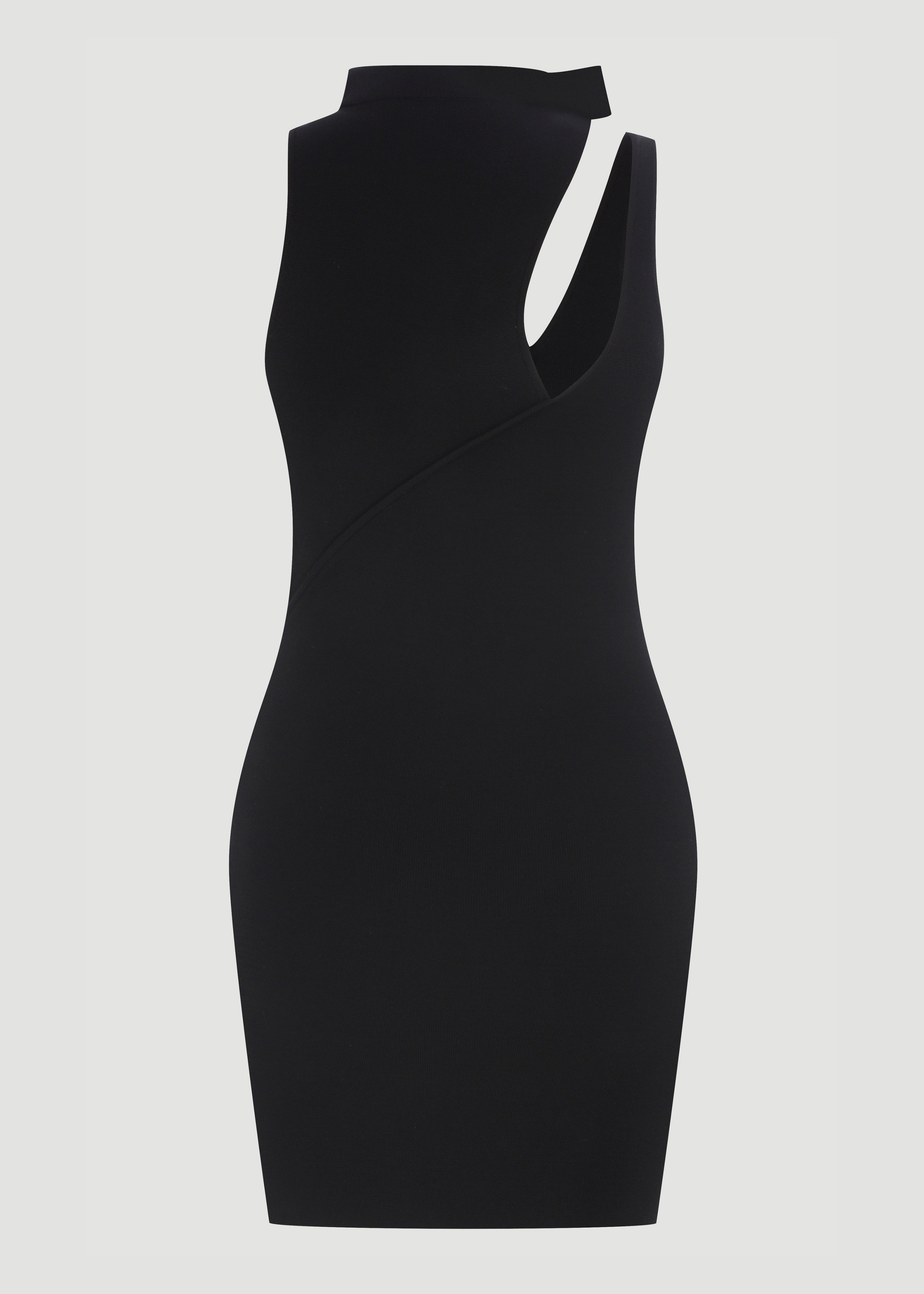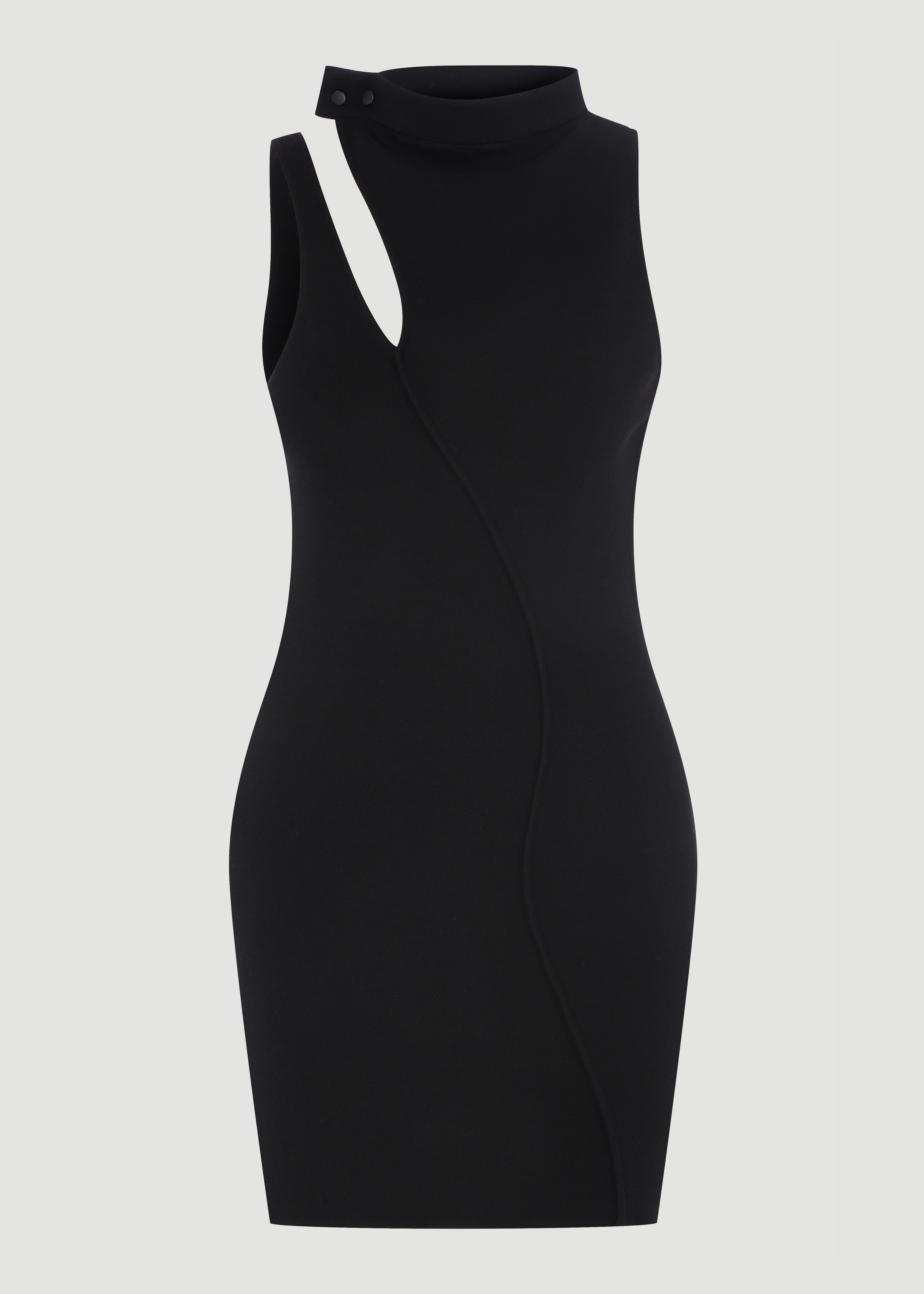 Cut-out detaylı çıt çıt yakalı, örme kumaş elbise.