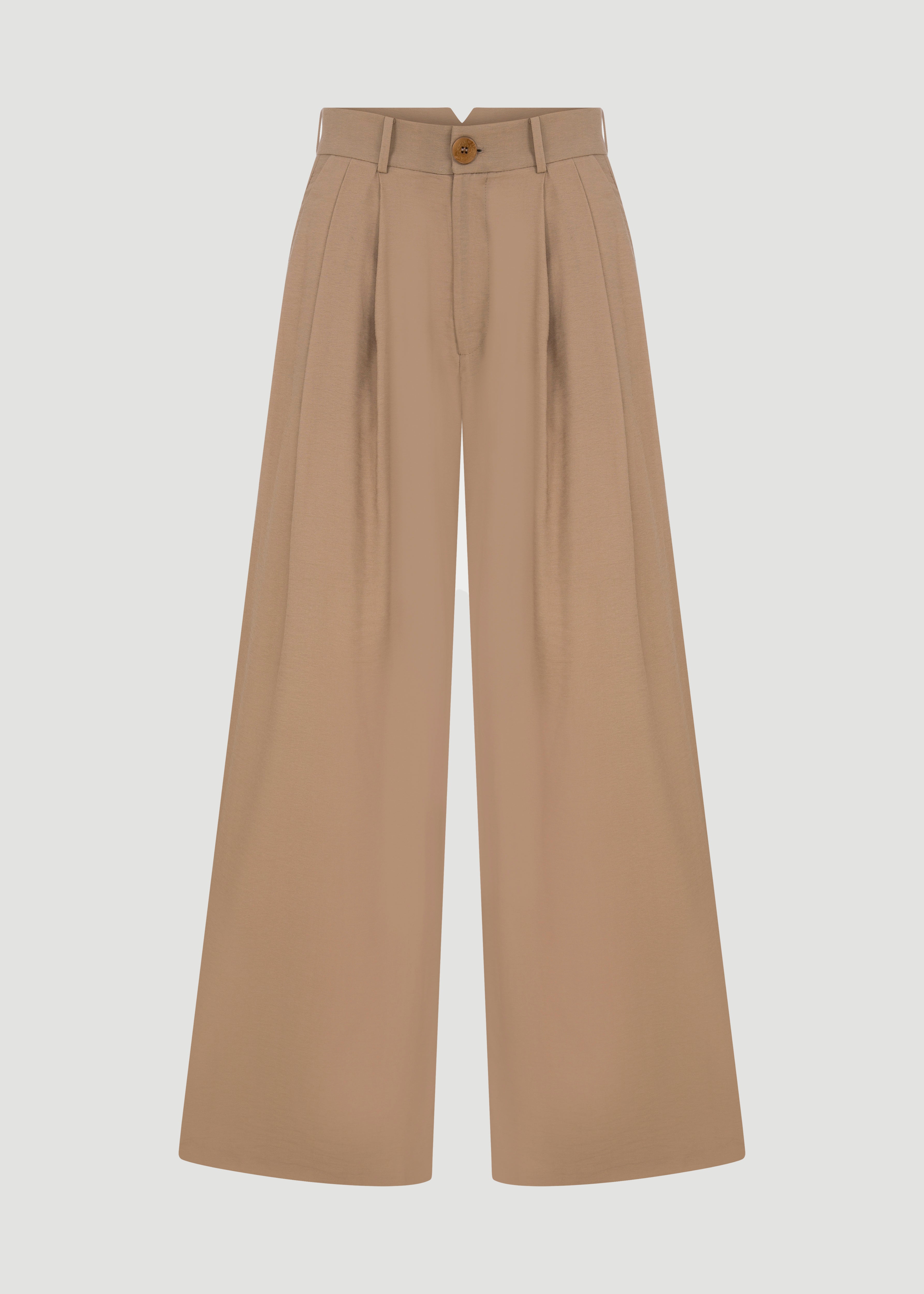 Yüksek belli, pile detaylı, geniş paçalı pantolon.