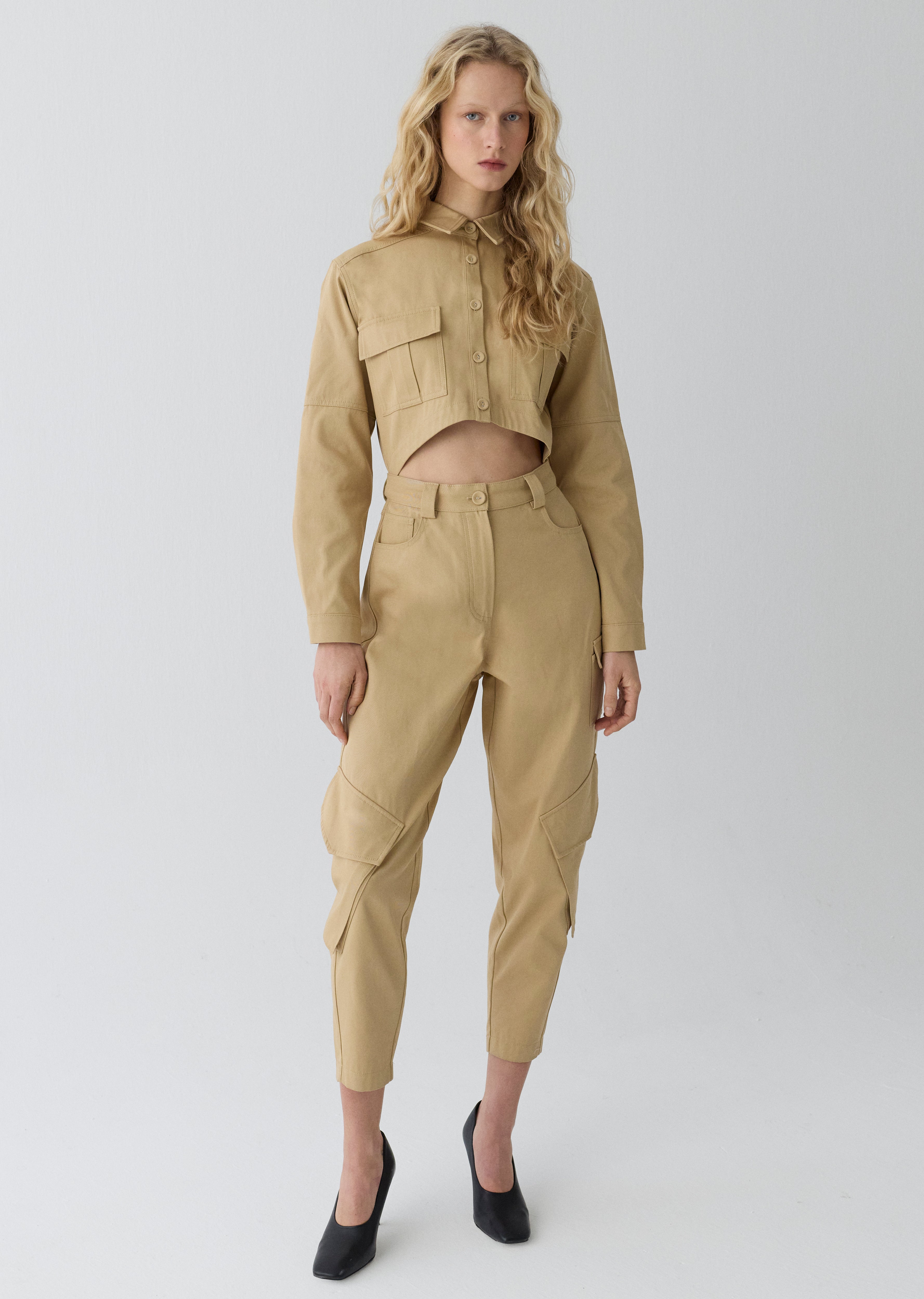 Cep ve cut-out detaylı, uzun kollu, havuç kesim tulum.