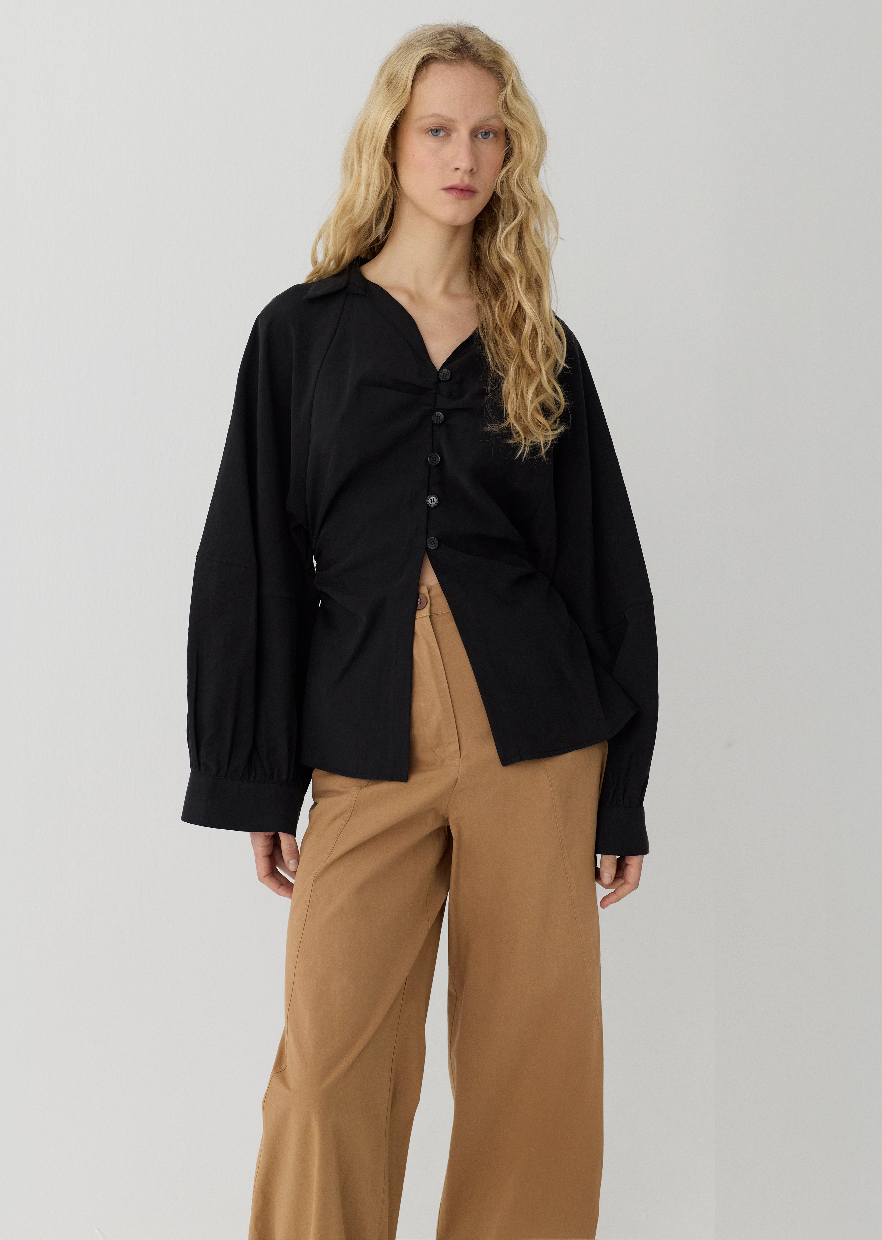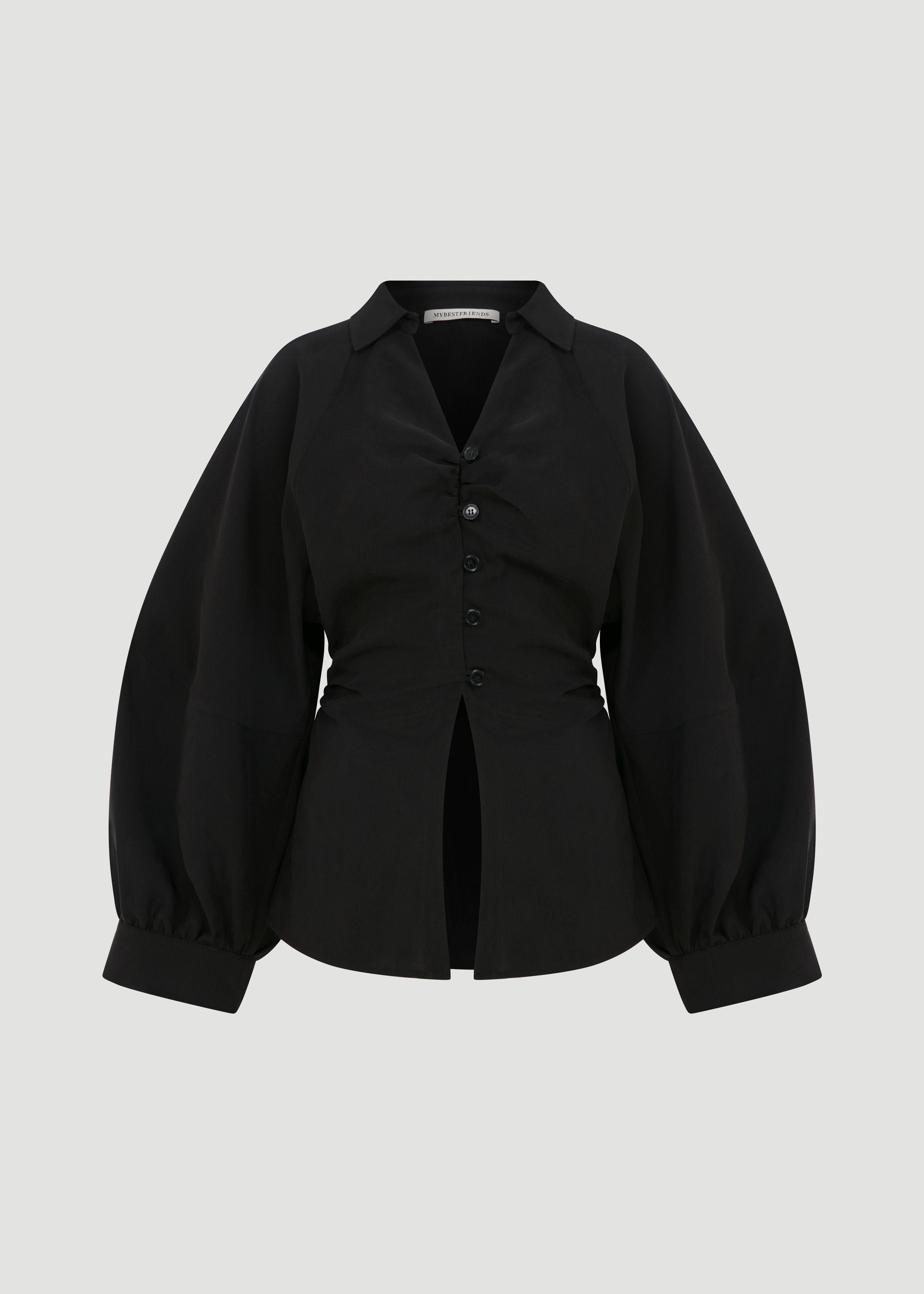 Klasik yaka ve önden kumaş kaplı düğmeli kapama detaylı, uzun balon kollu, Bel kısmı drape detaylı manşetli gömlek.