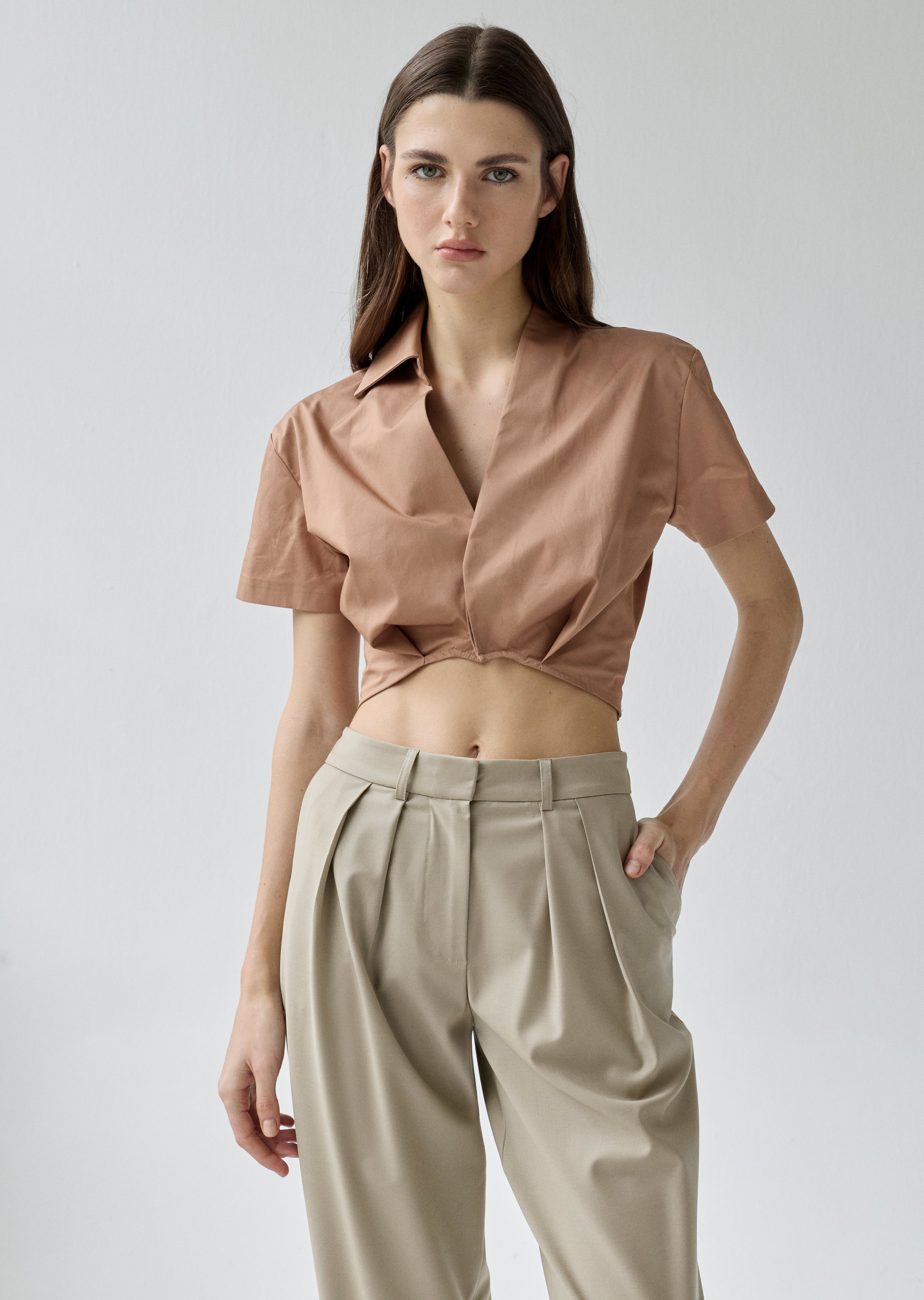 Tek yaka detaylı, kısa kollu, crop gömlek.