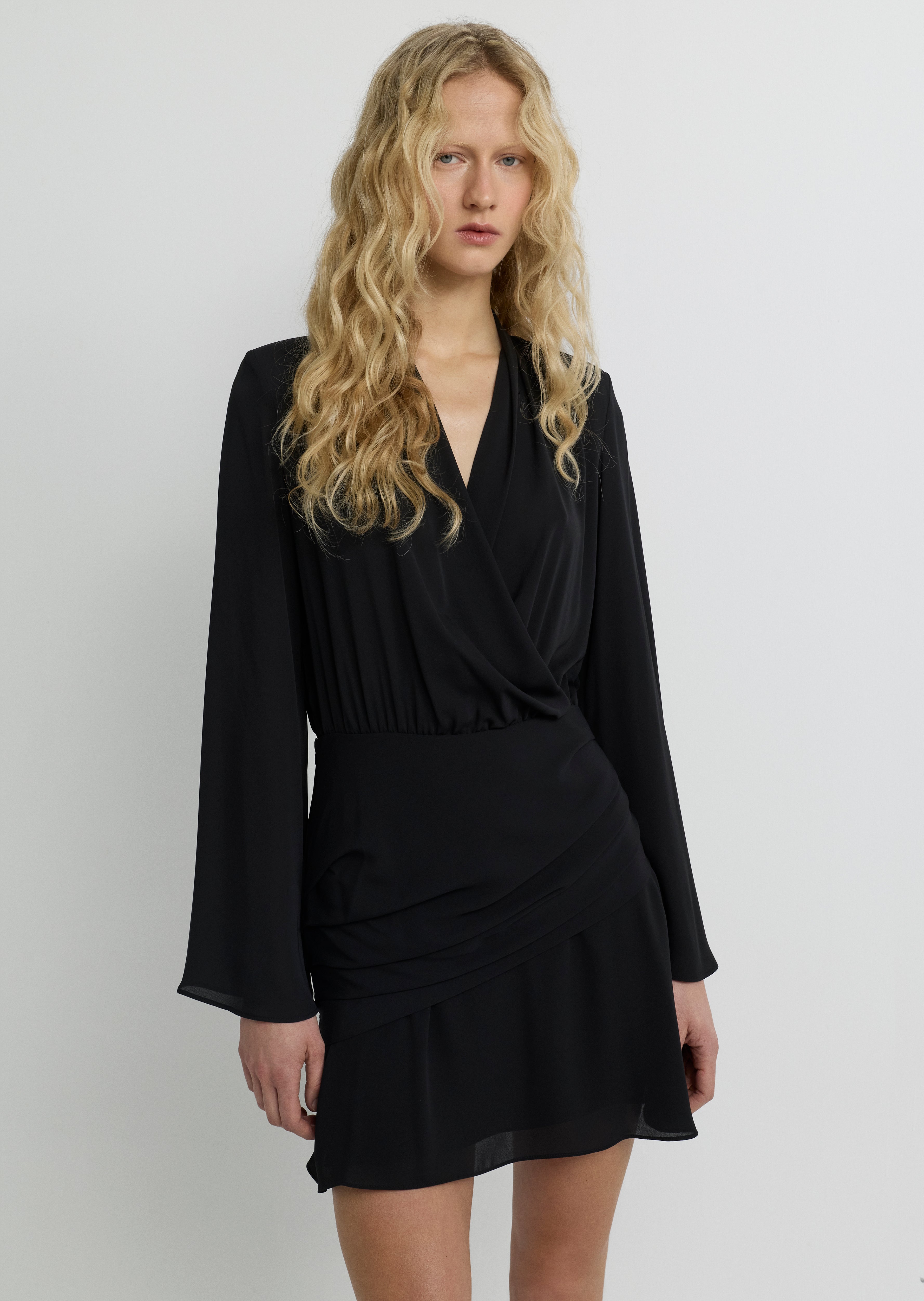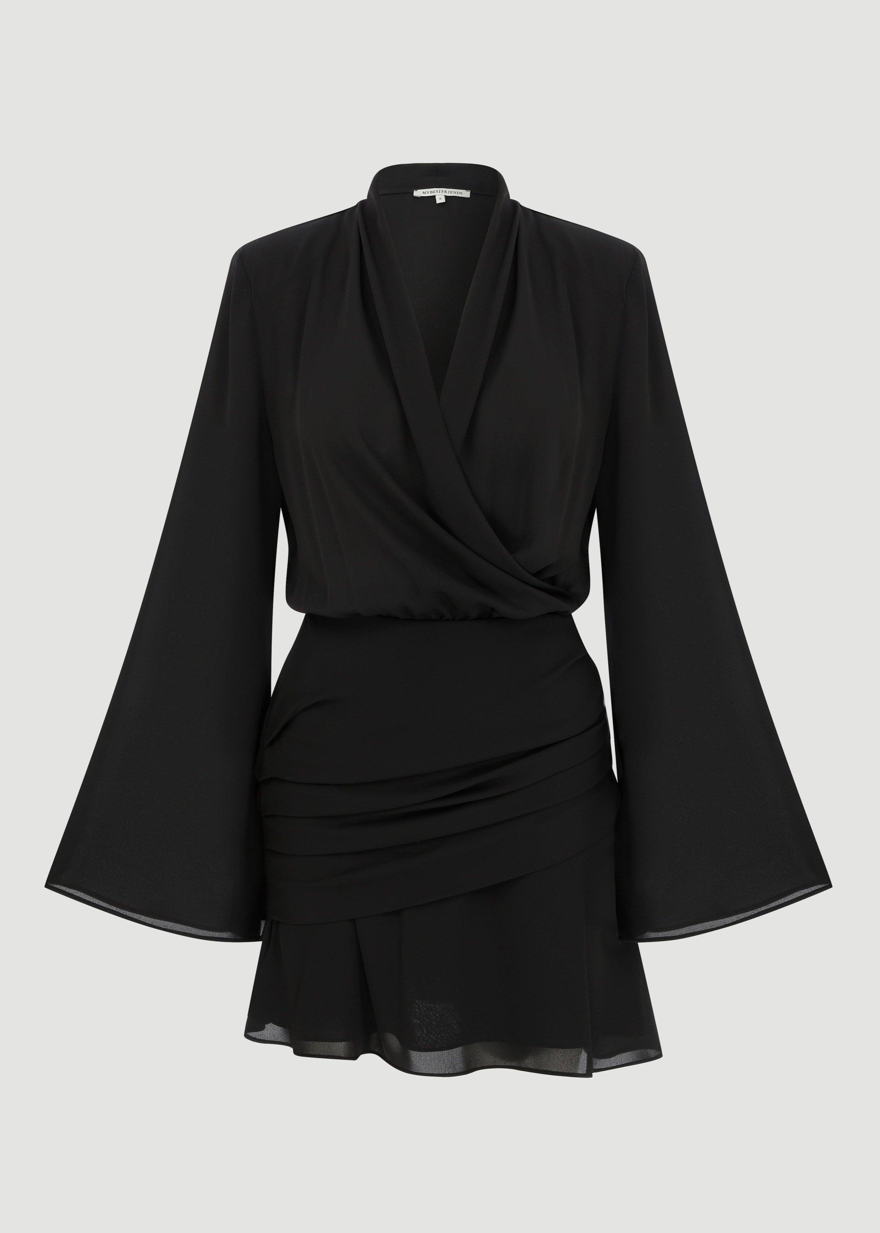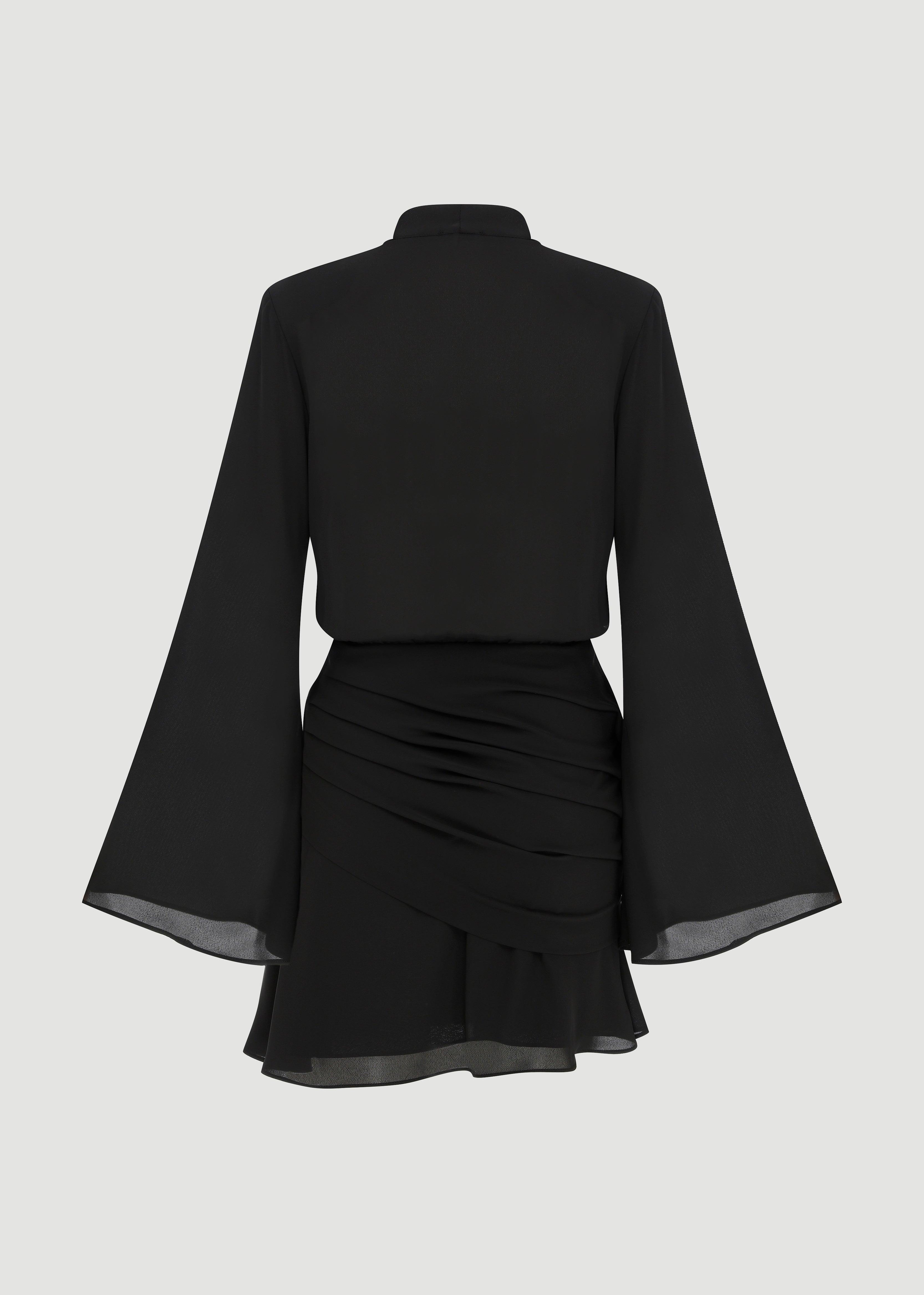Bornoz yakalı, uzun kollu mini elbise. Omuzdan itibaren 87 cm'dir