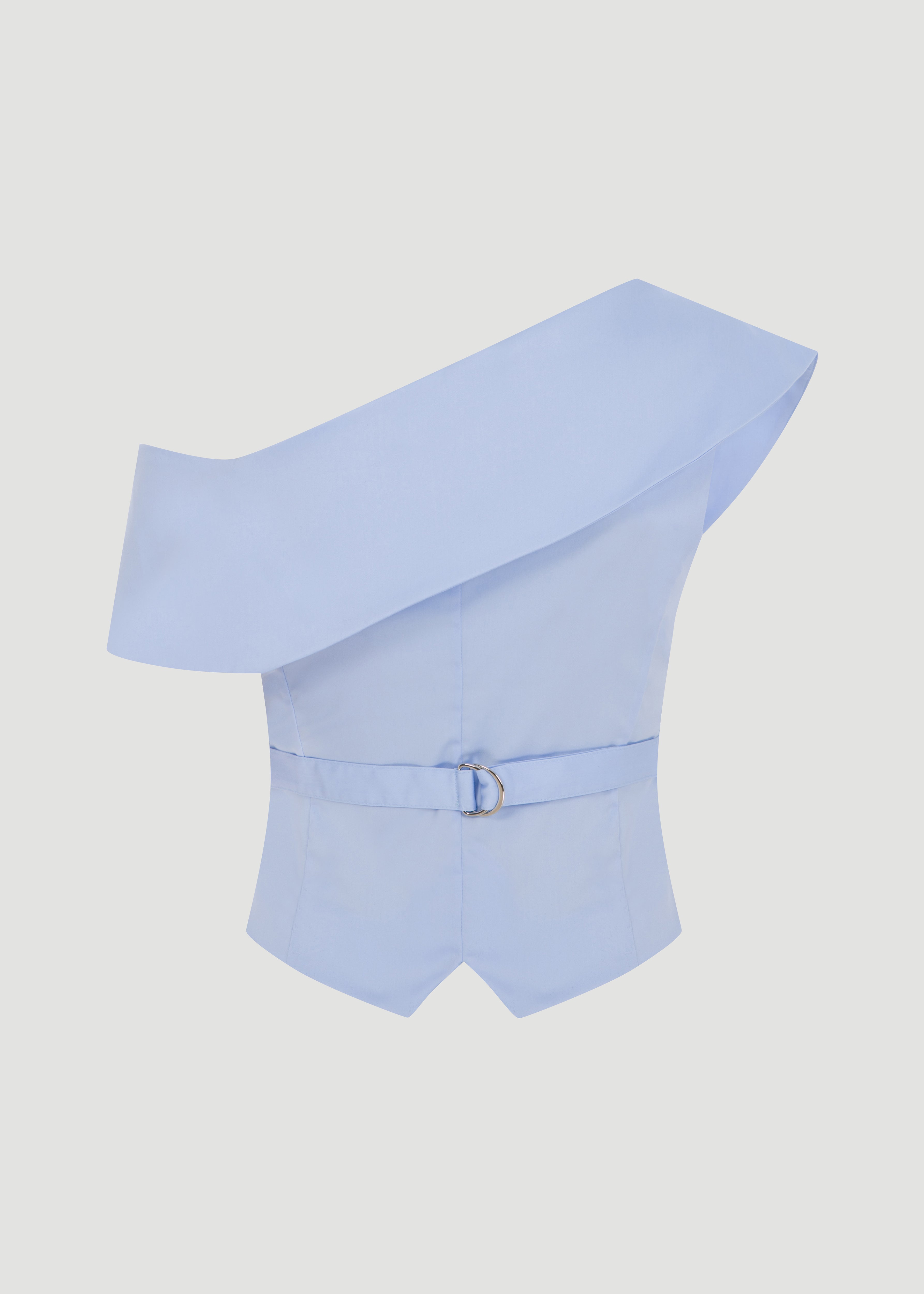 Asimetrik yakalı, düğmeli, omuz dekolteli gömlek.