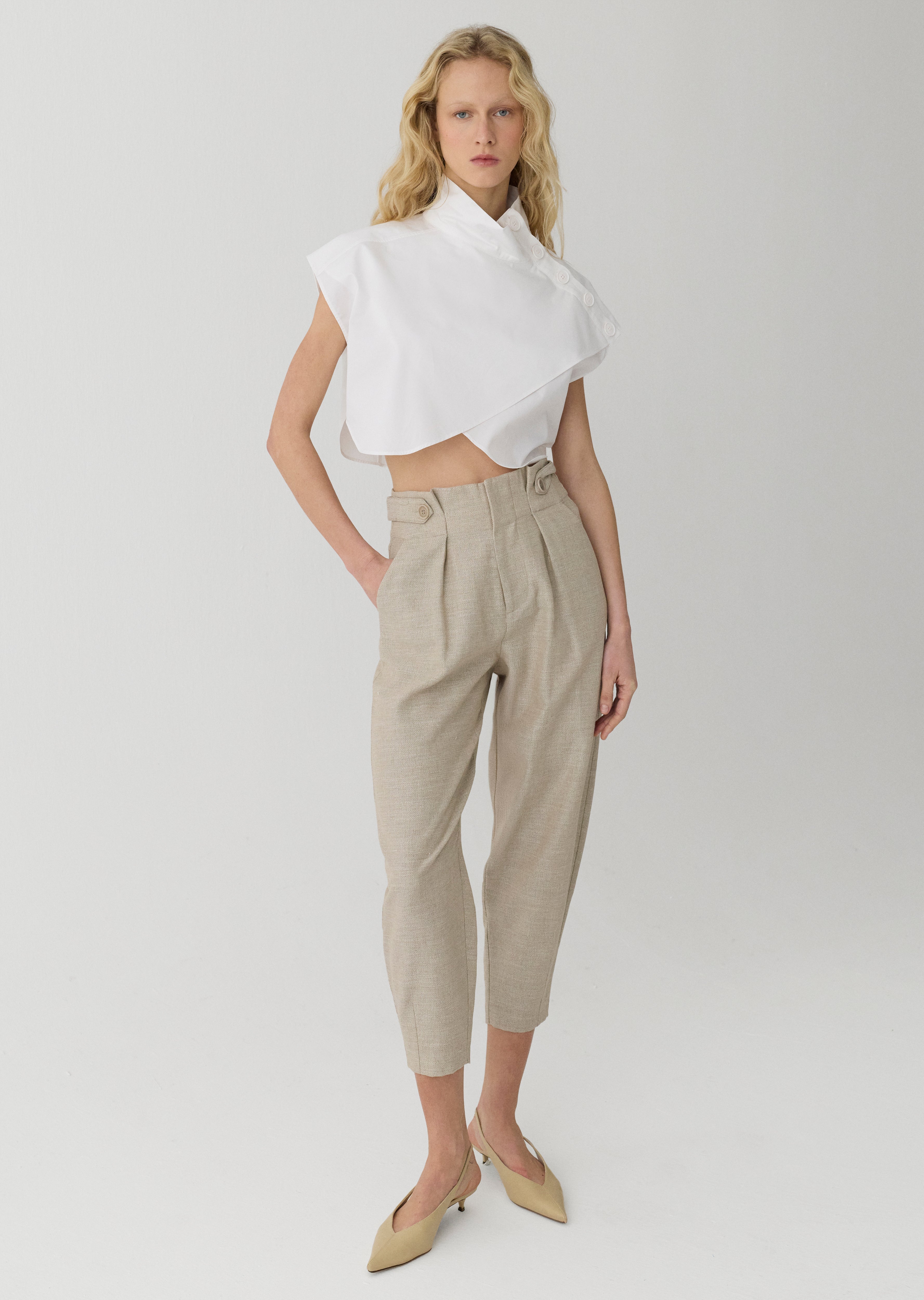 Pileli, düğme detaylı, havuç kesim pantolon.