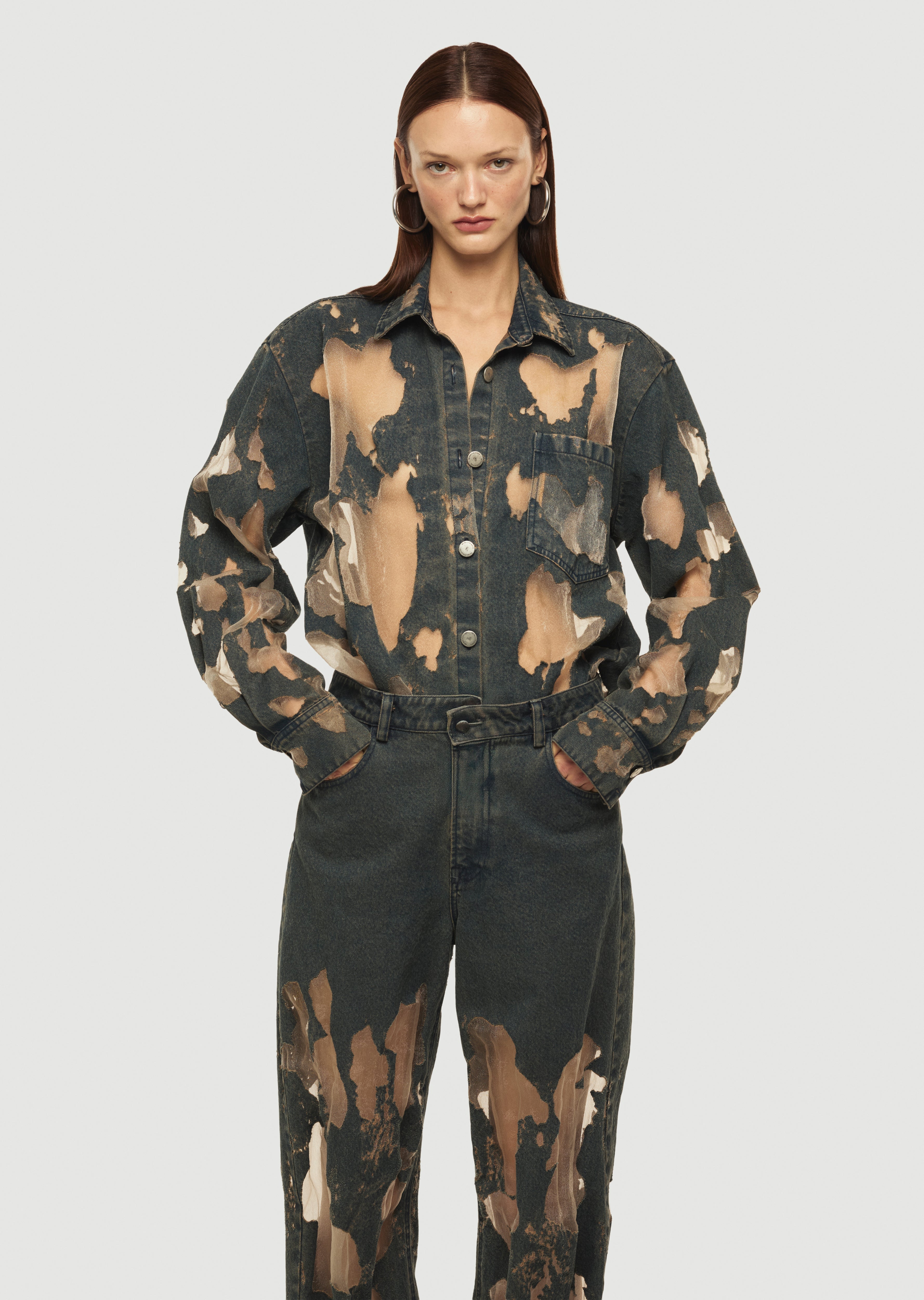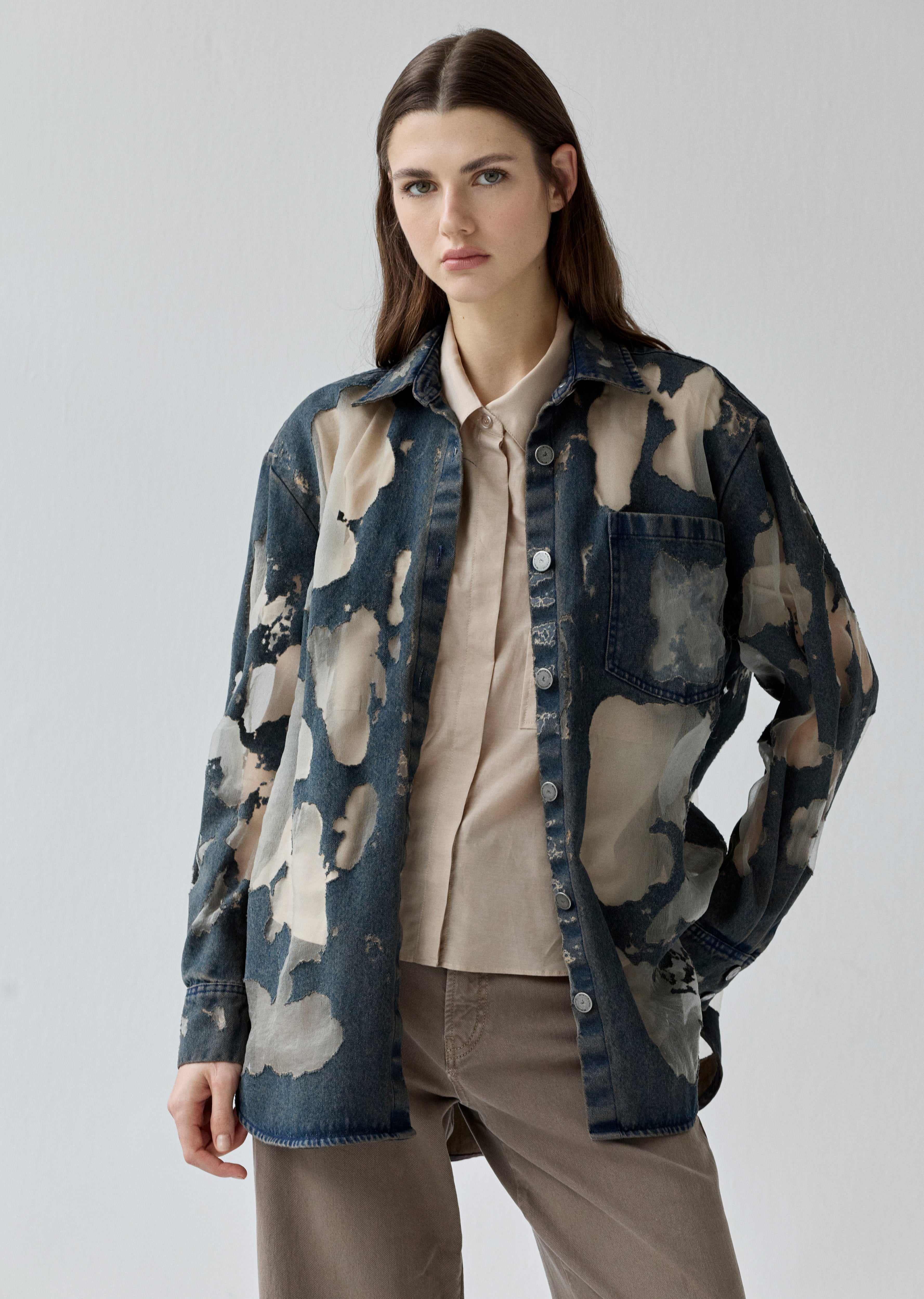 Özel yıkamalı, klasik yakalı, önden düğmeli kapamalı, uzun kollu, tek cepli denim gömlek.