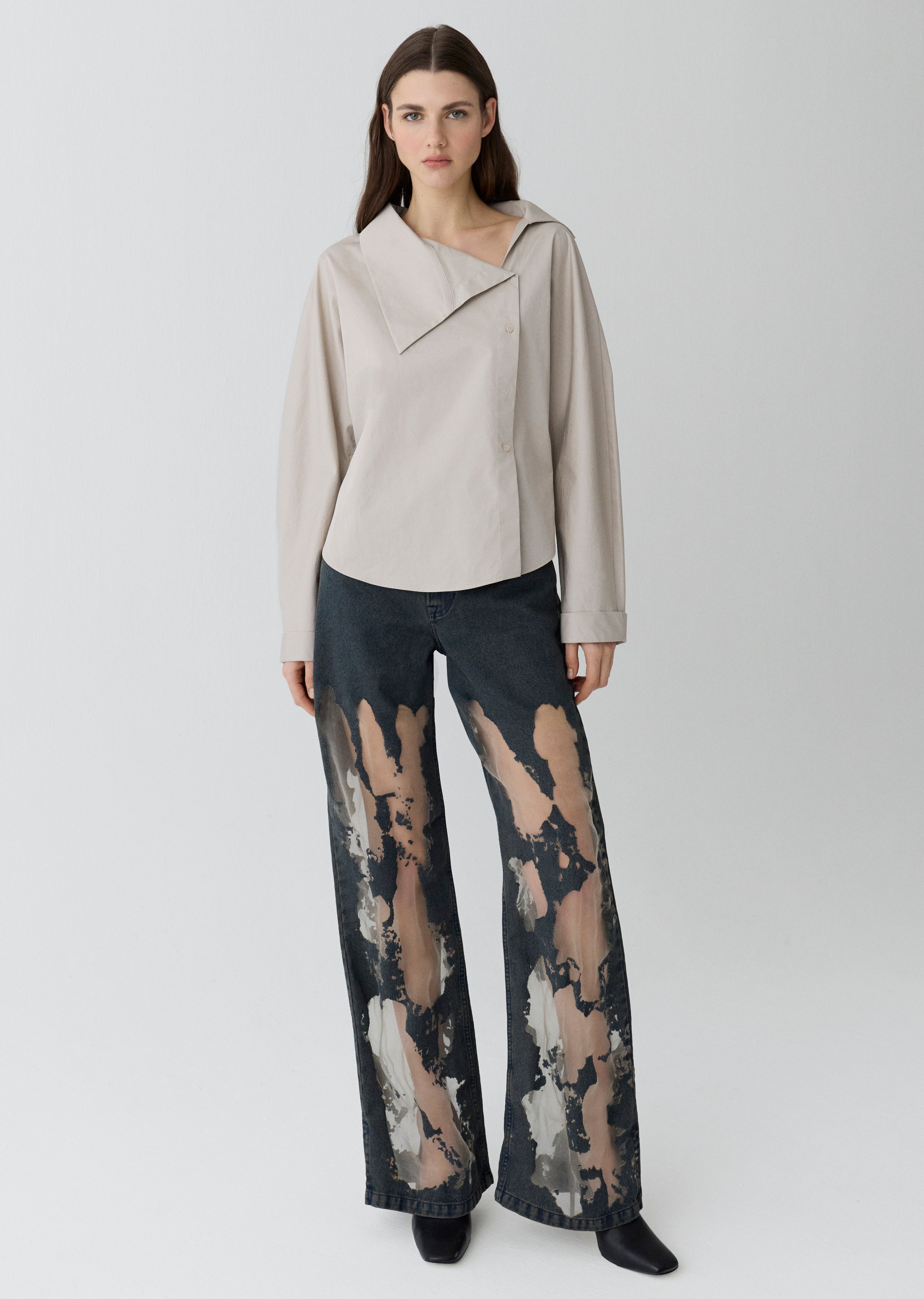 Özel yıkamalı, geniş paçalı denim pantolon.