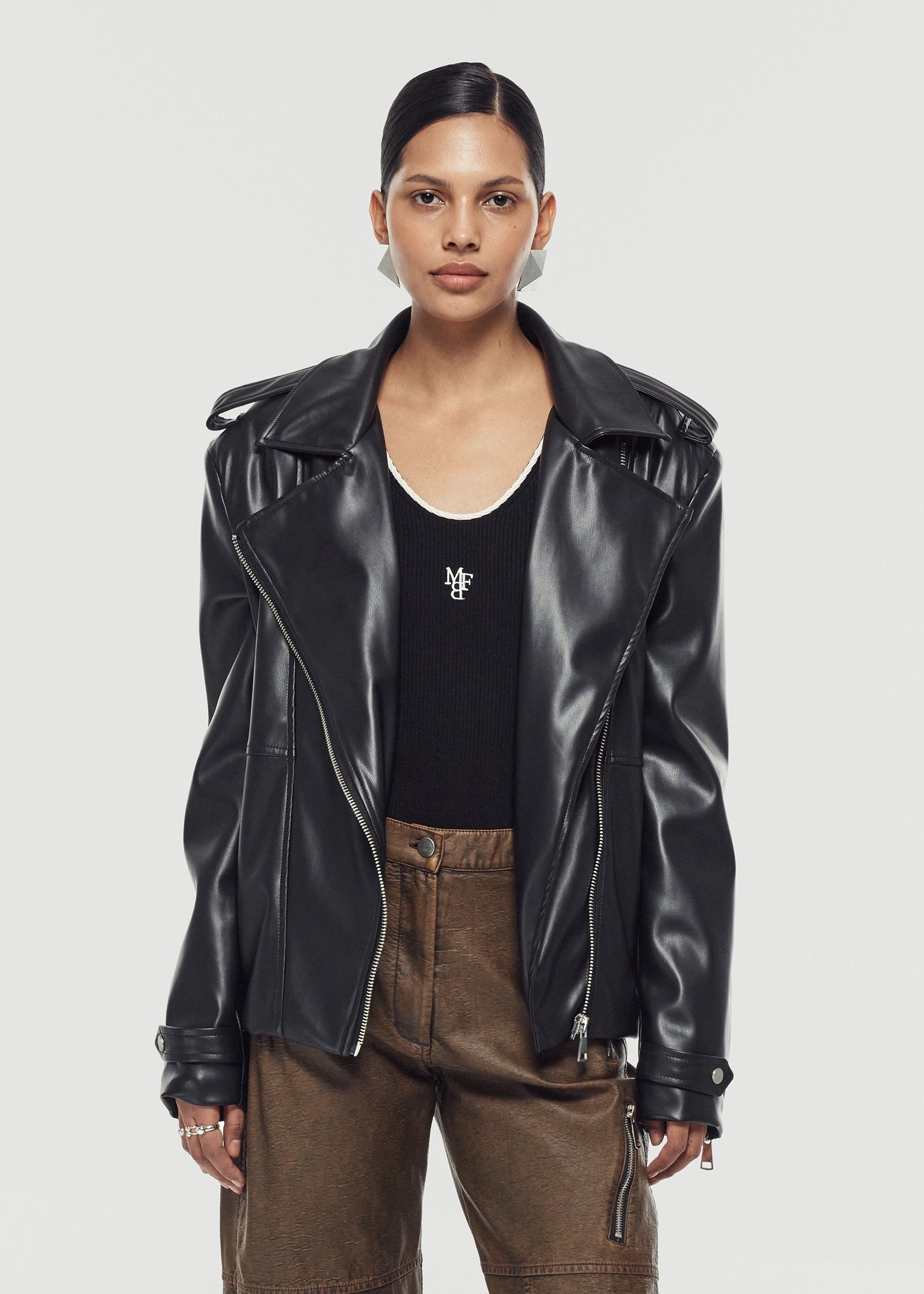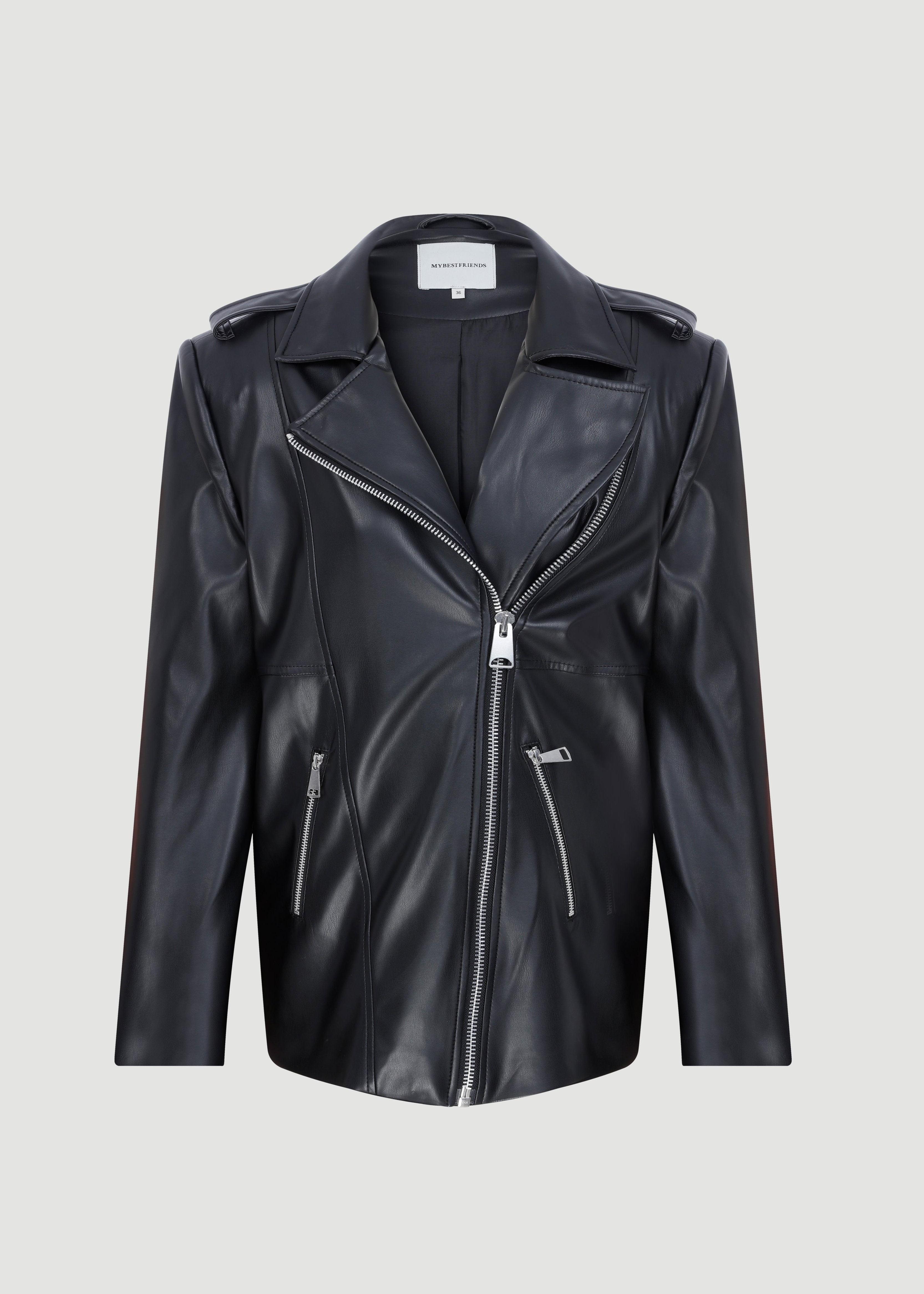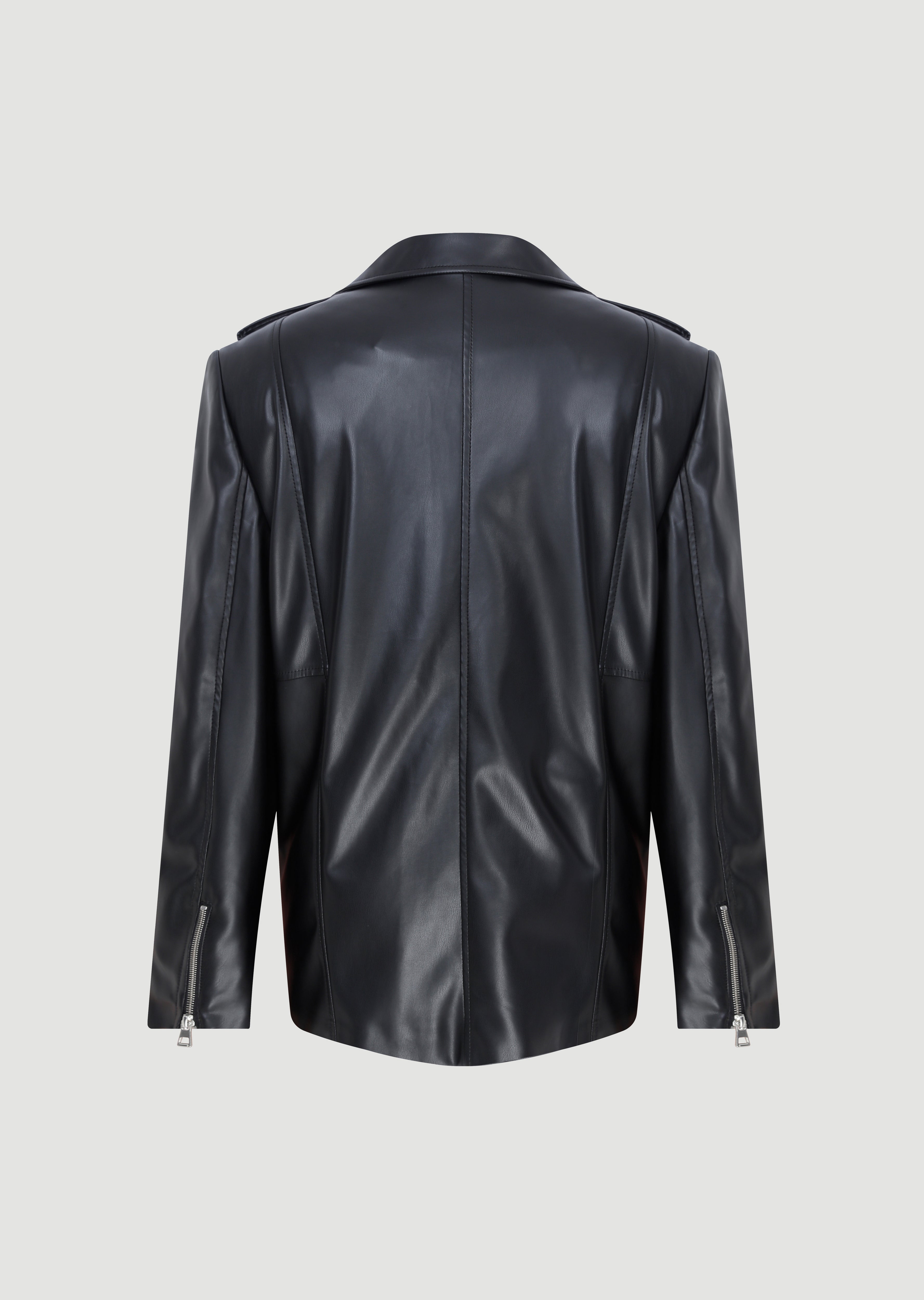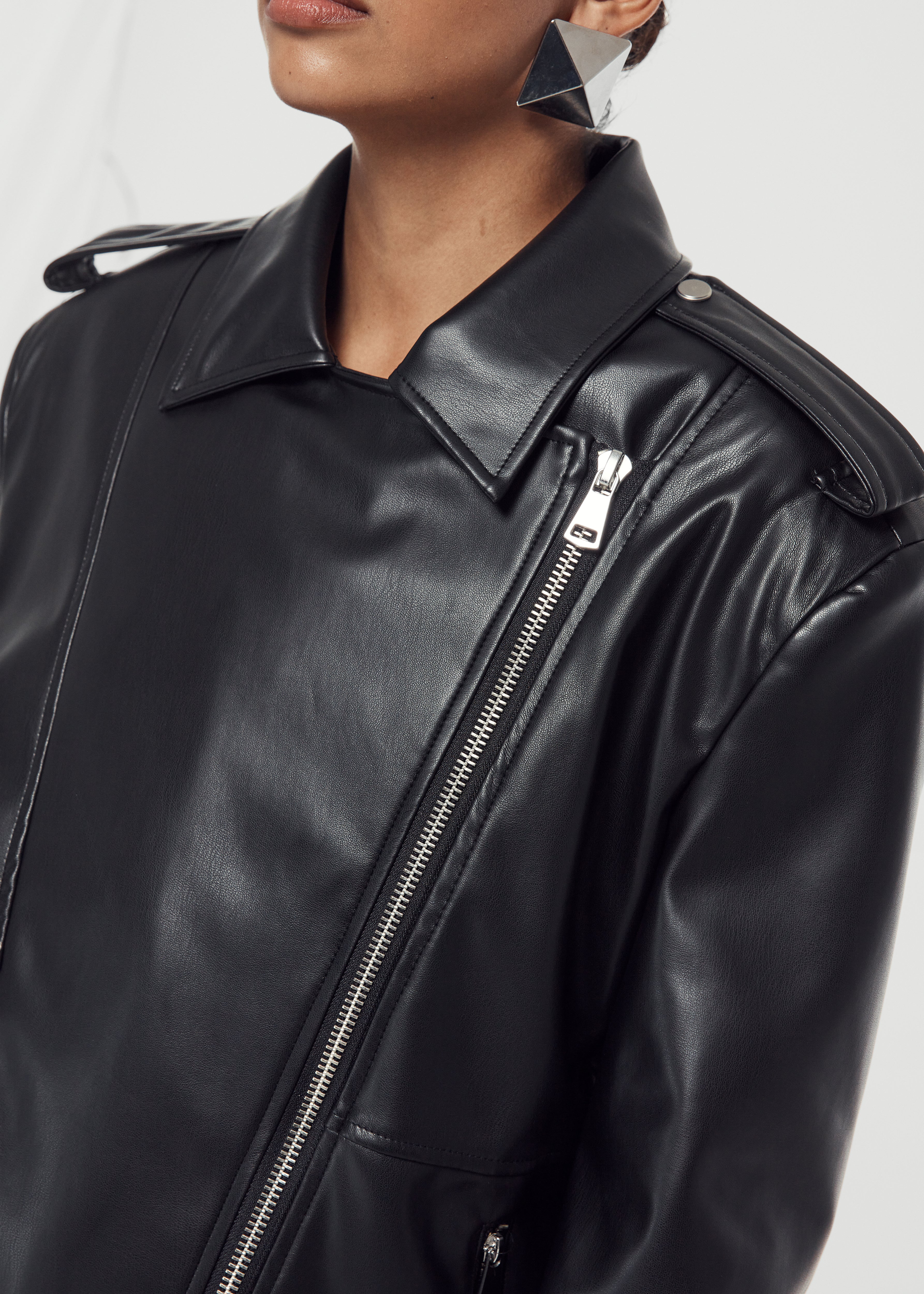 Straight cut leather jacket with pads and zipper closure.