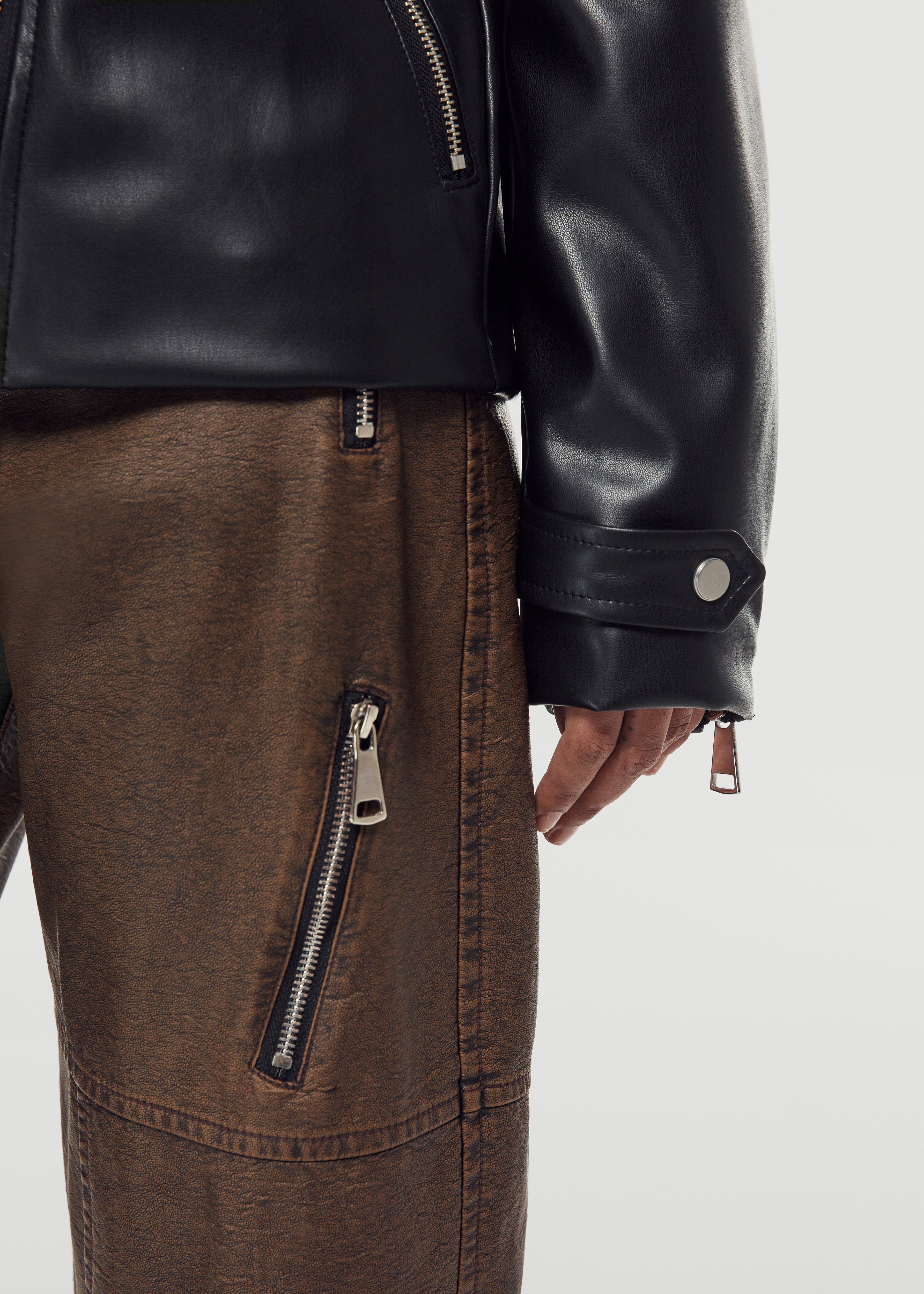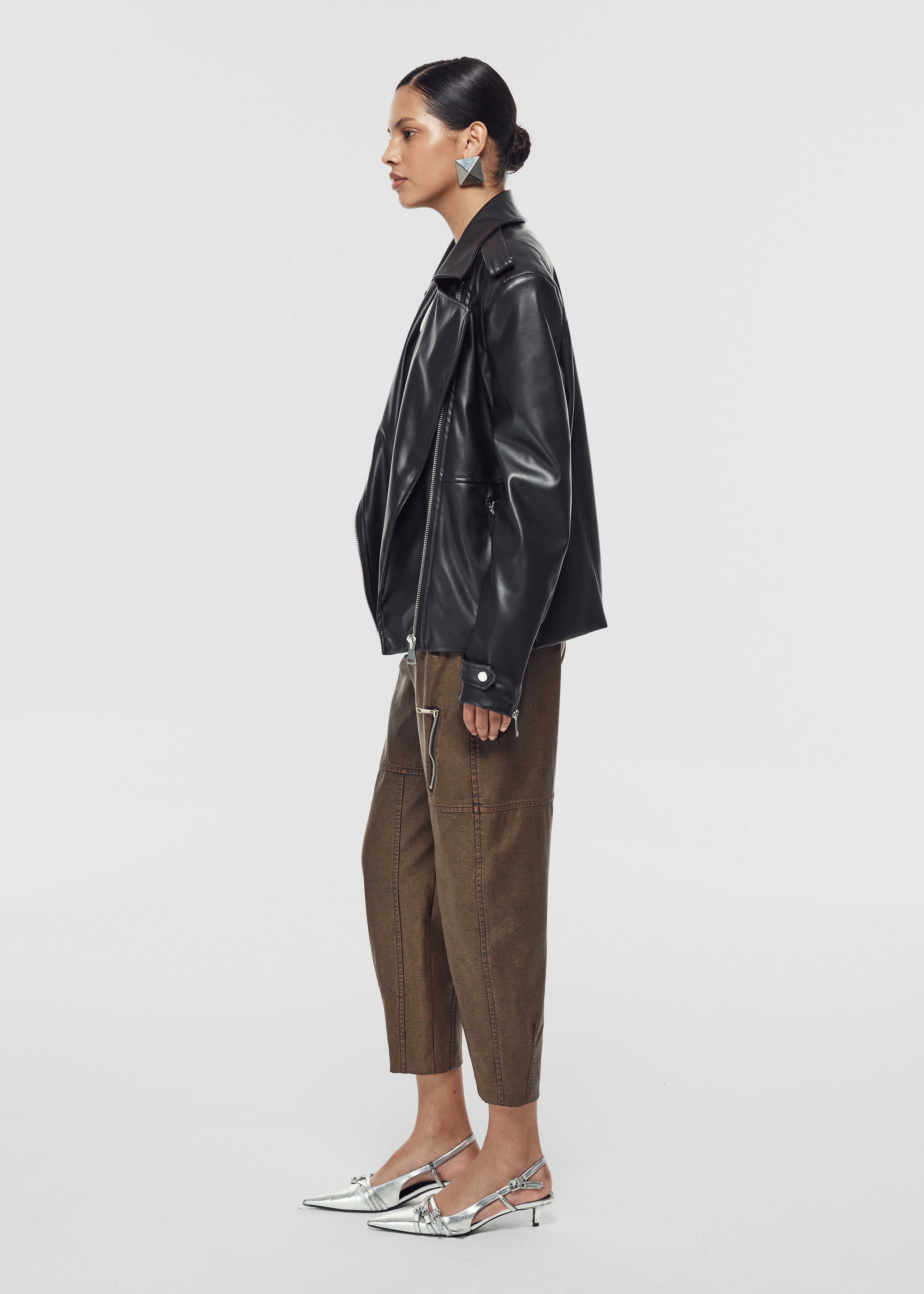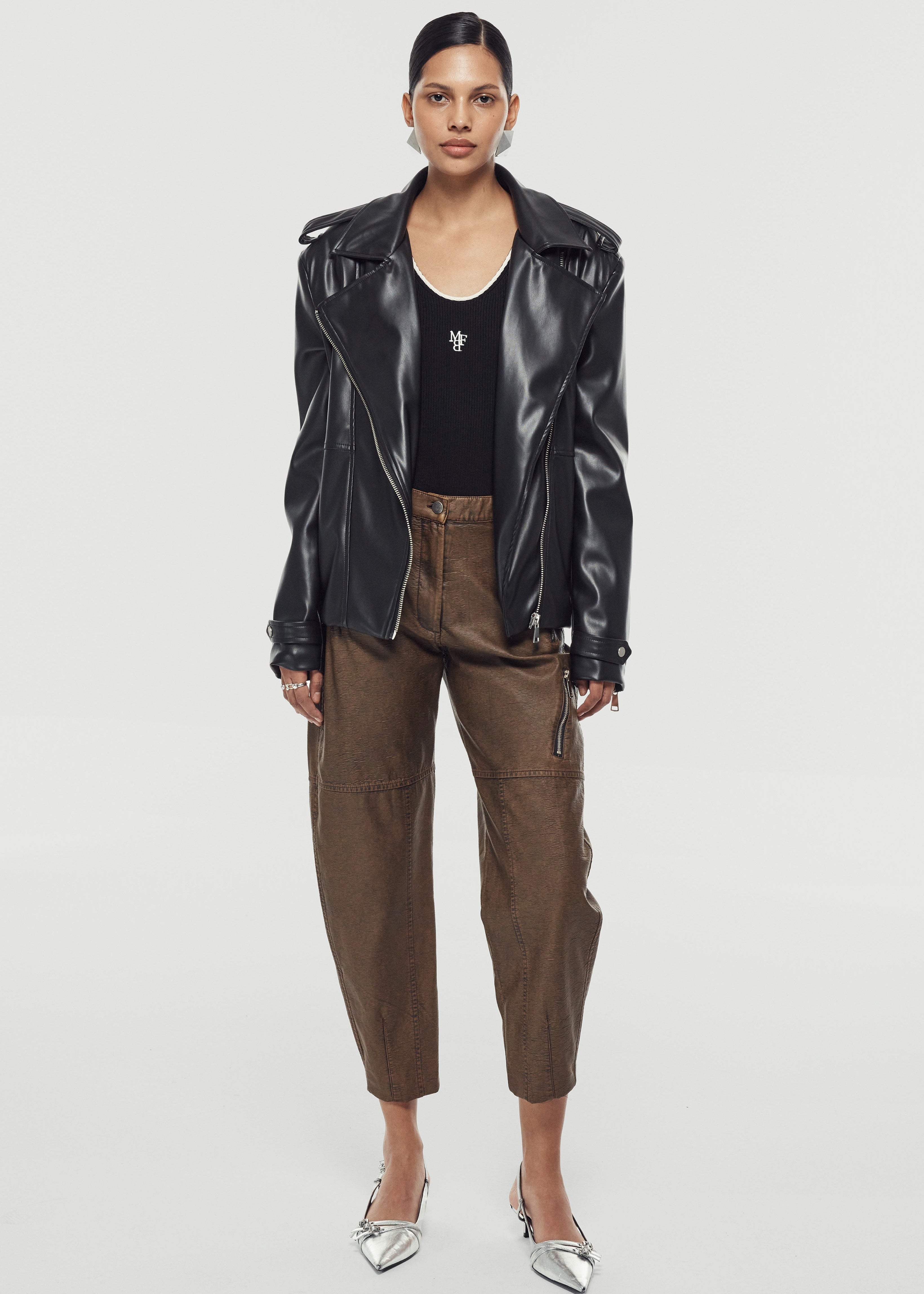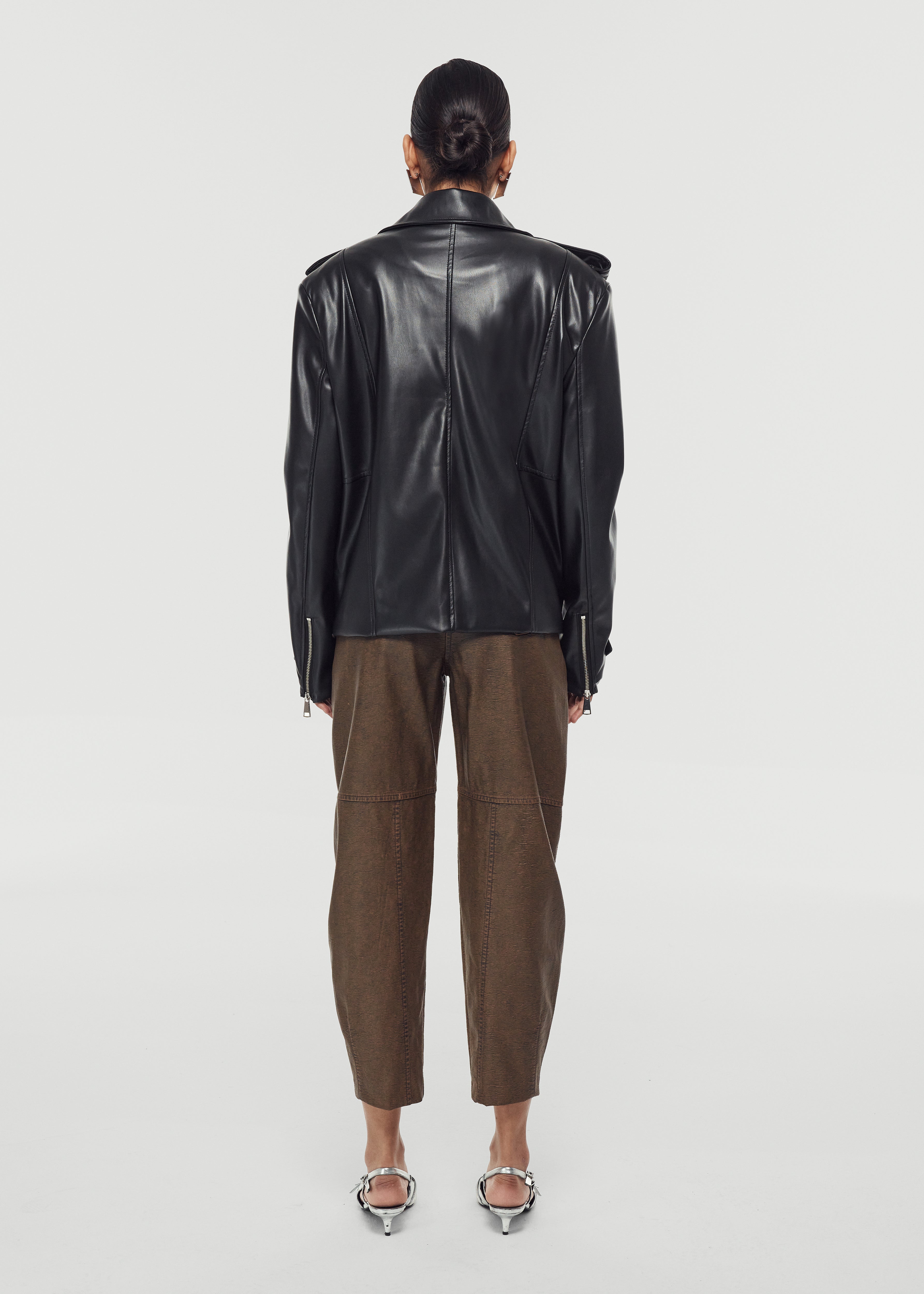 Straight cut leather jacket with pads and zipper closure.