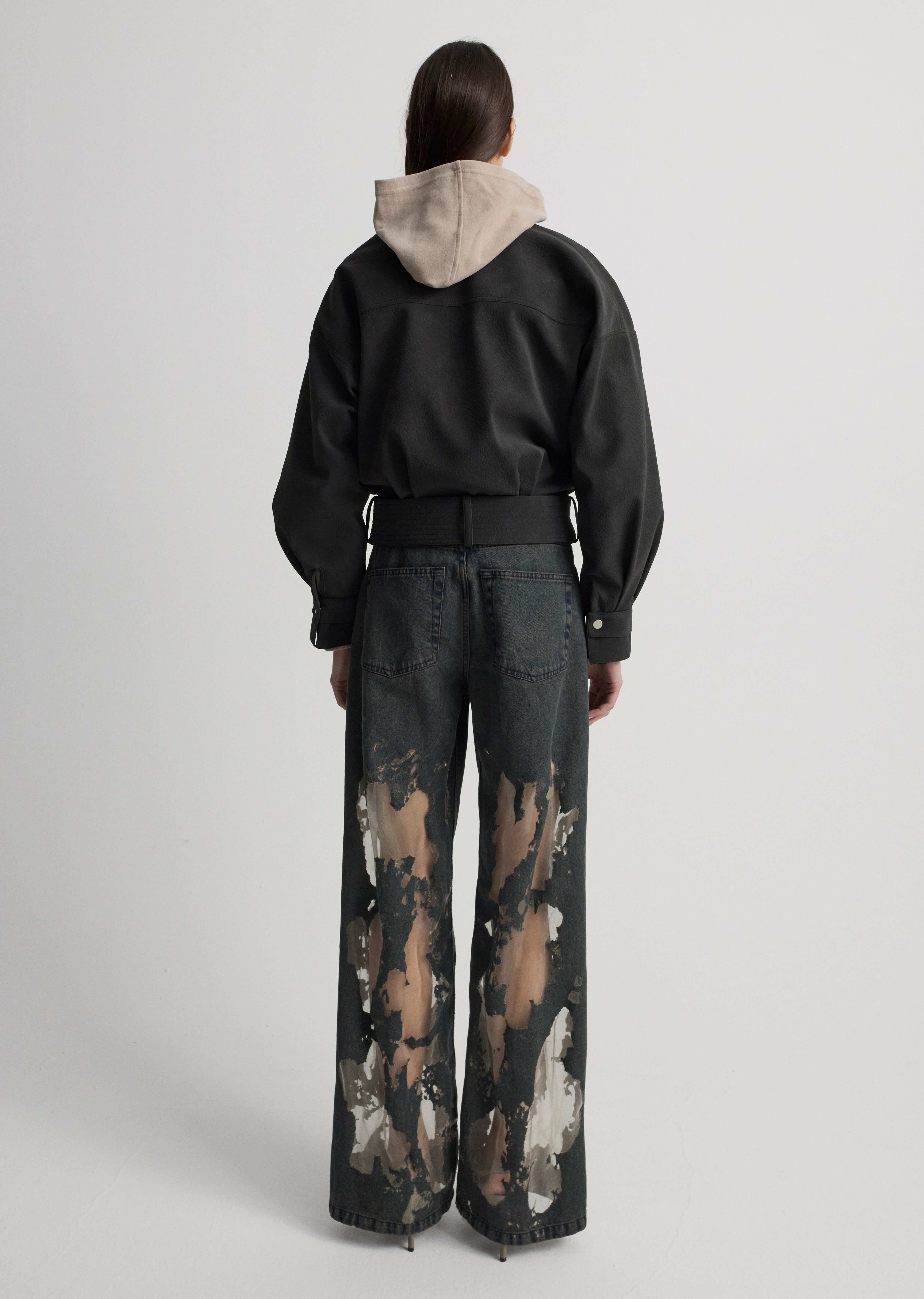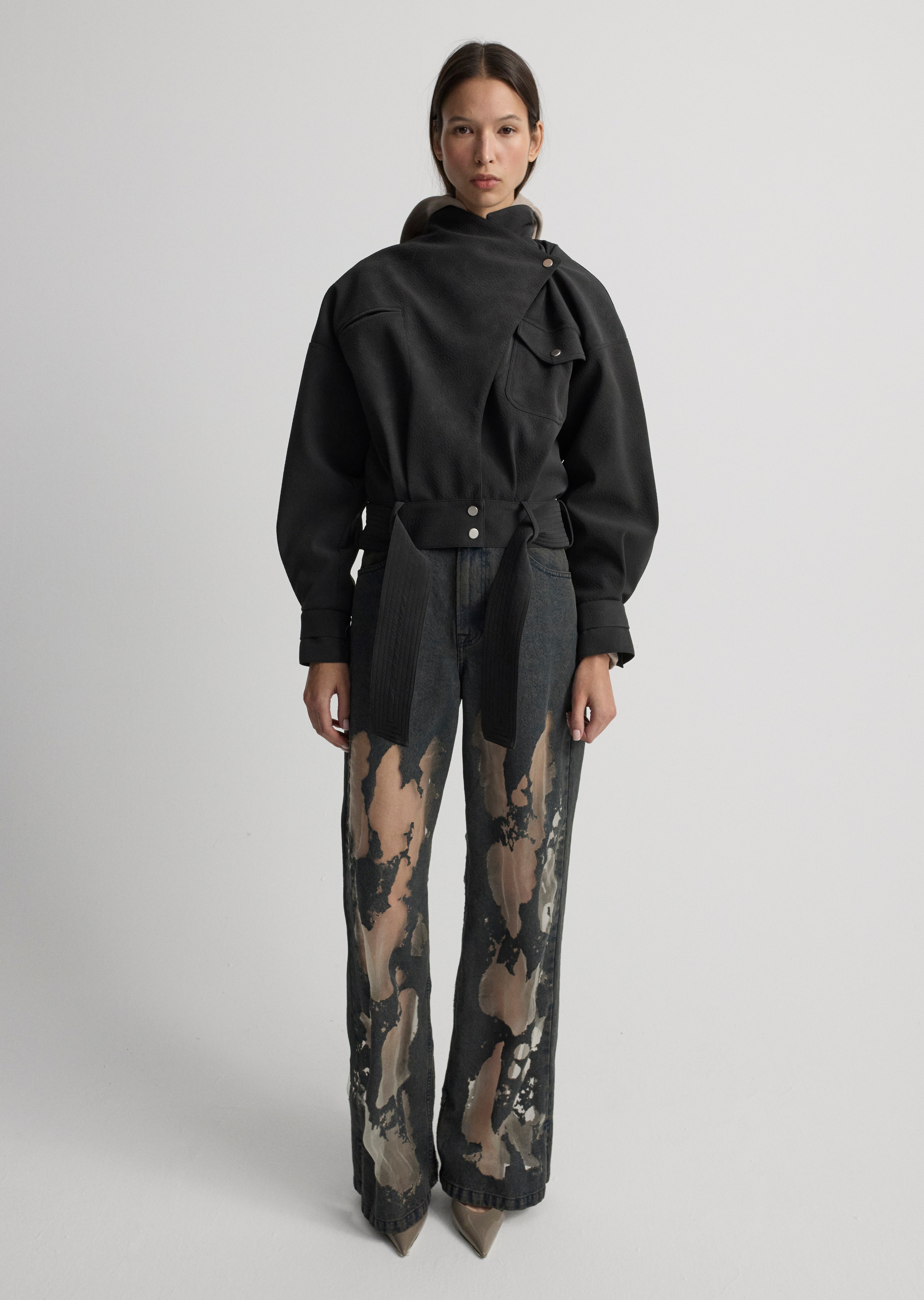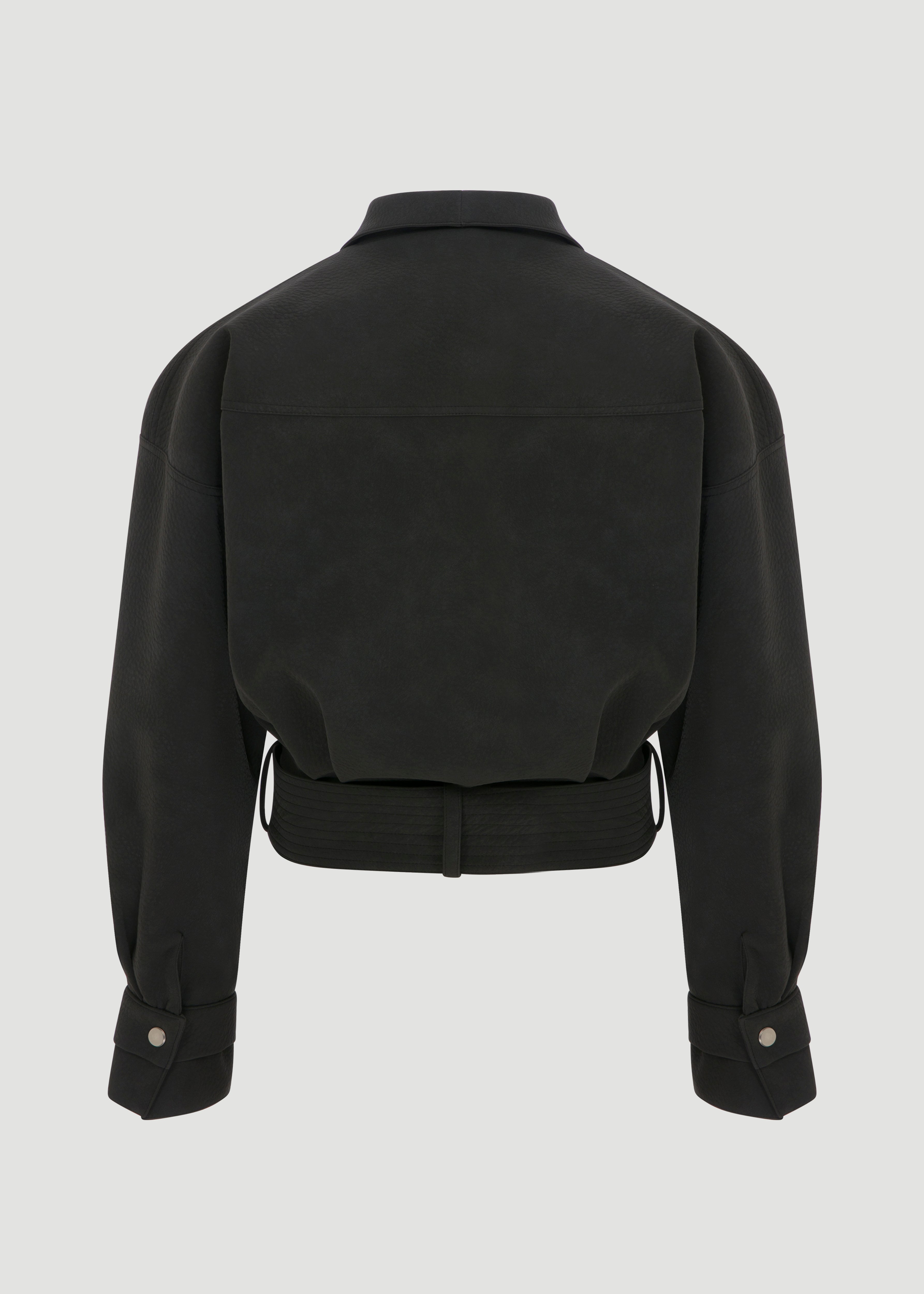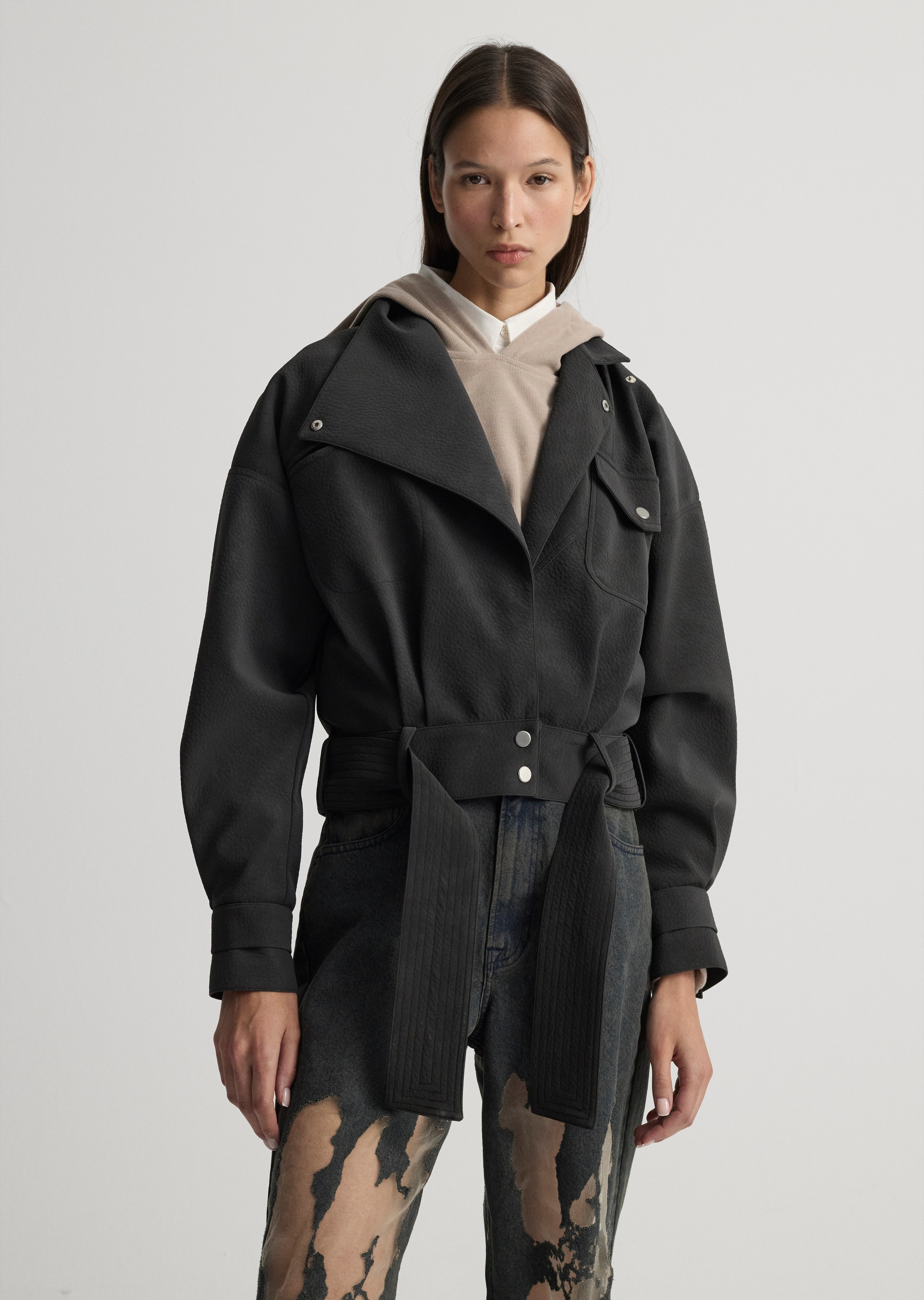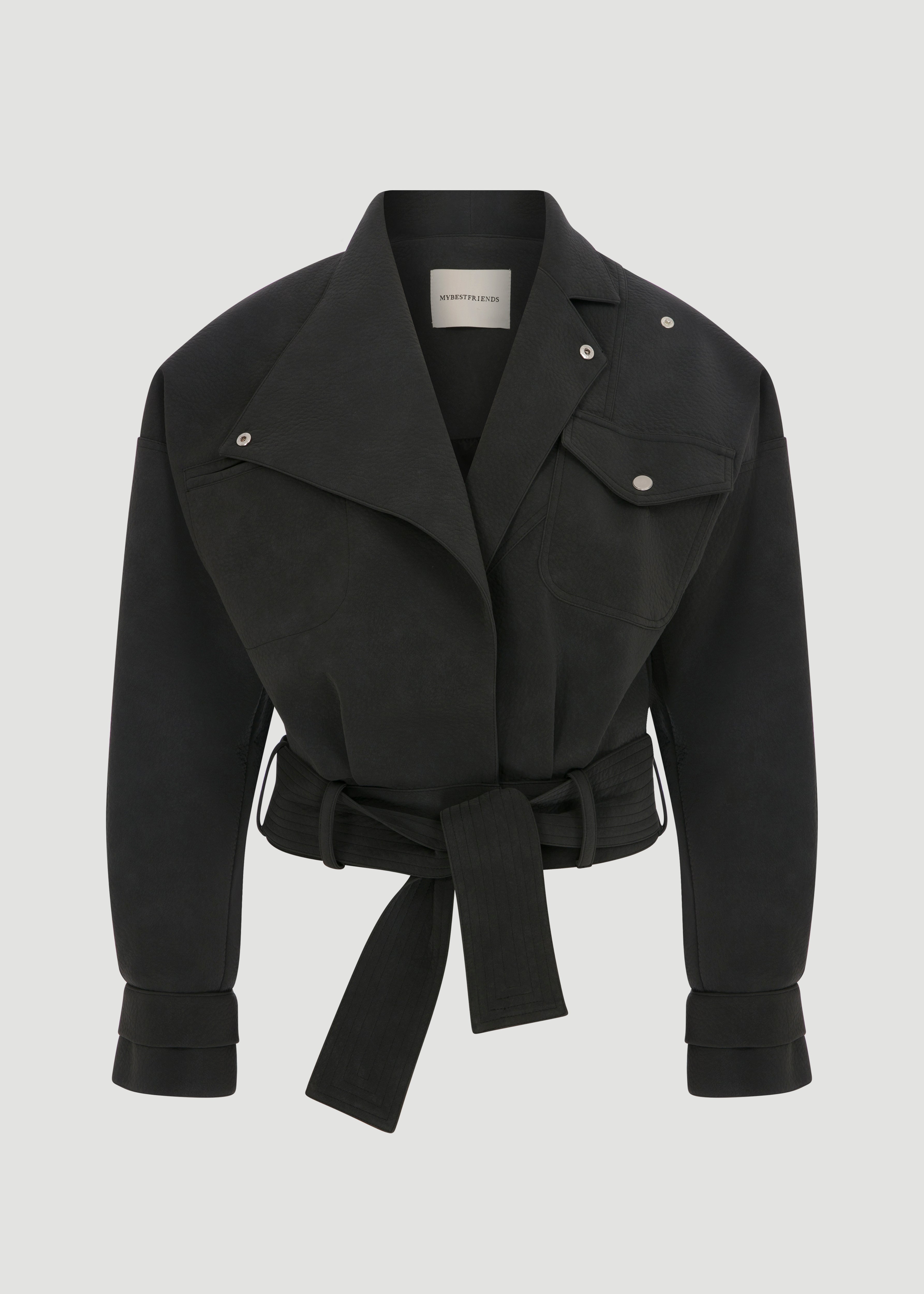 Buy belt-detailed, asymmetrical collar crop jacket.