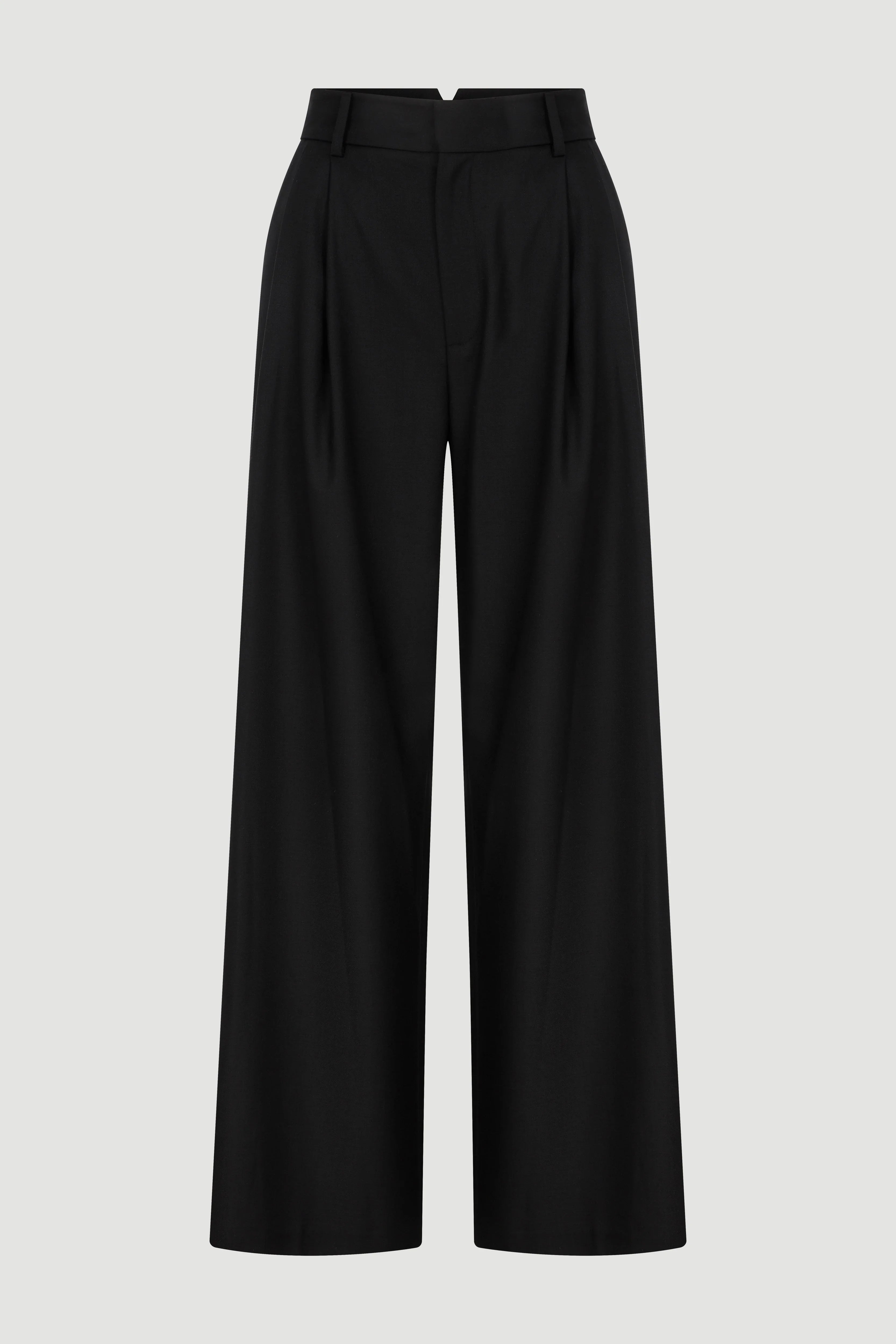 High-waisted, pleated, wide-leg trousers.