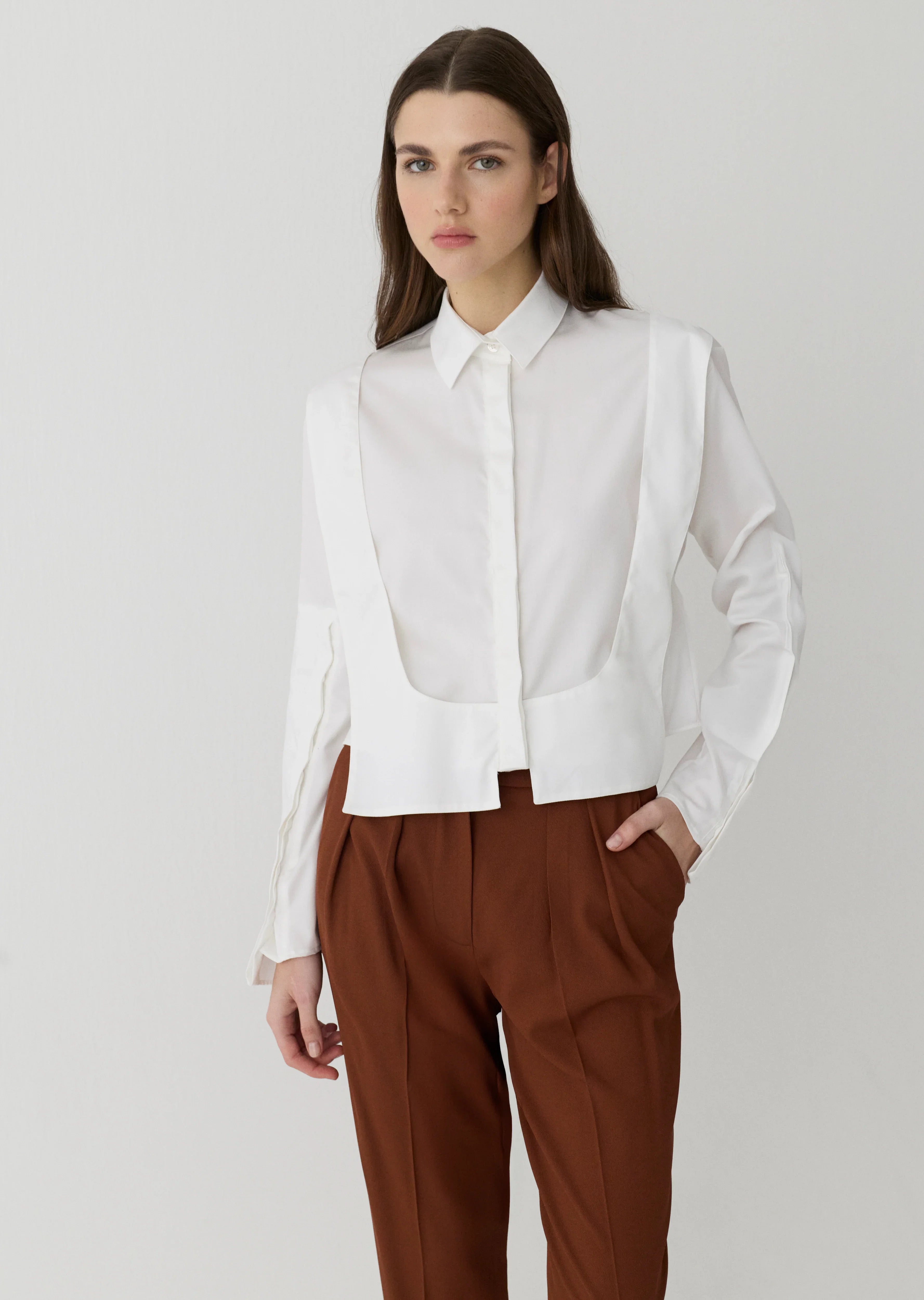 Double-layered shirt with concealed placket and button detail along the sleeve.