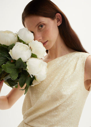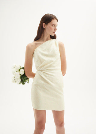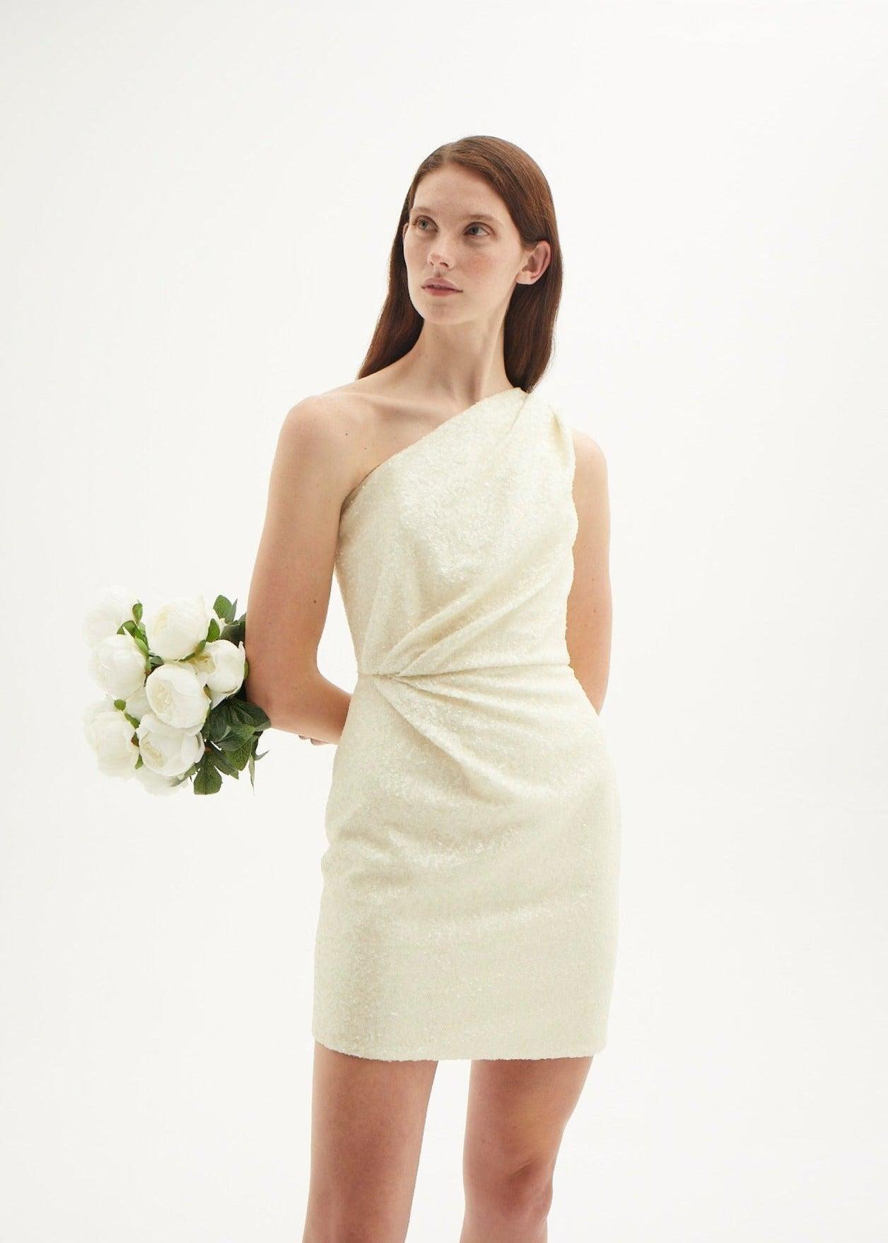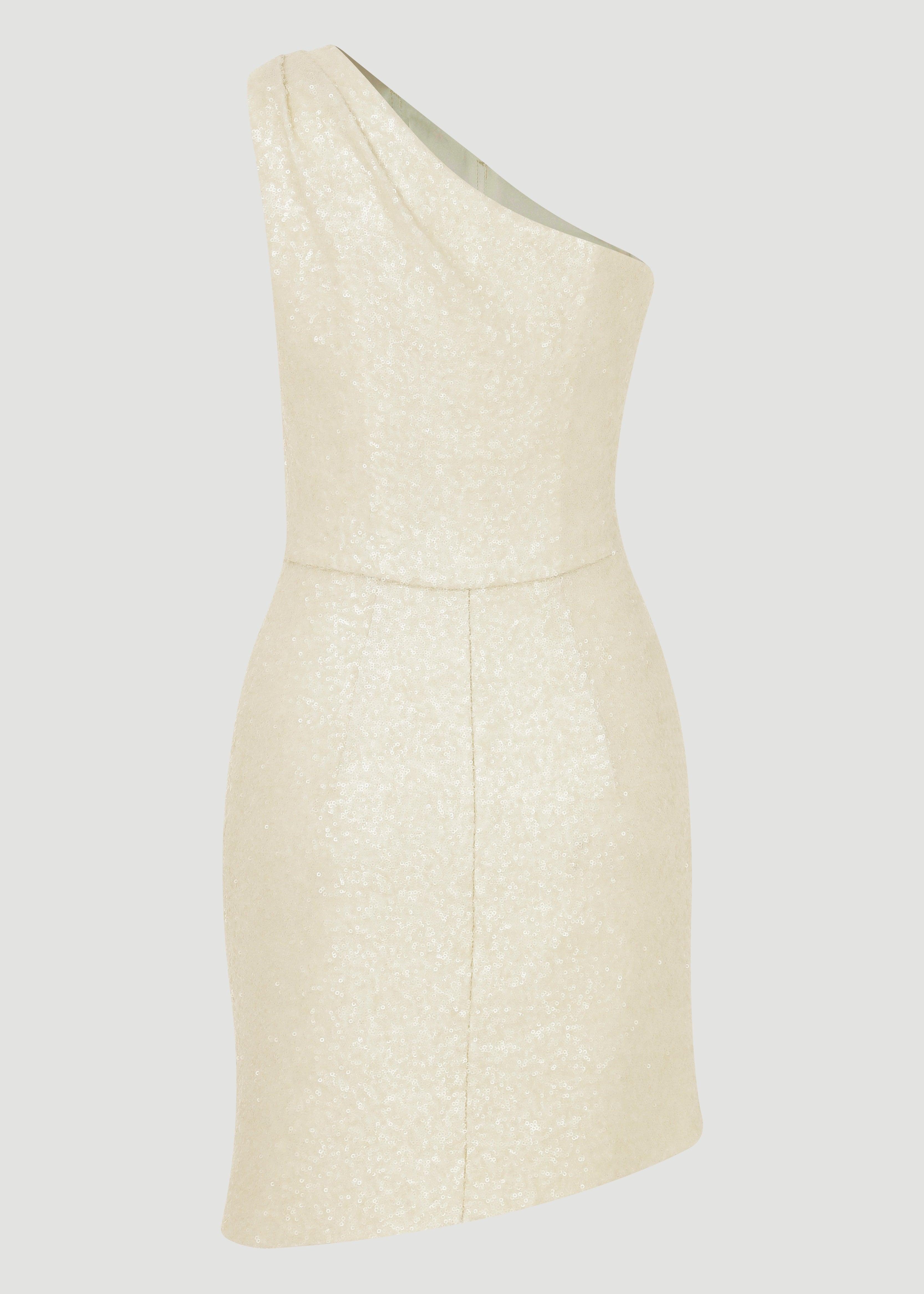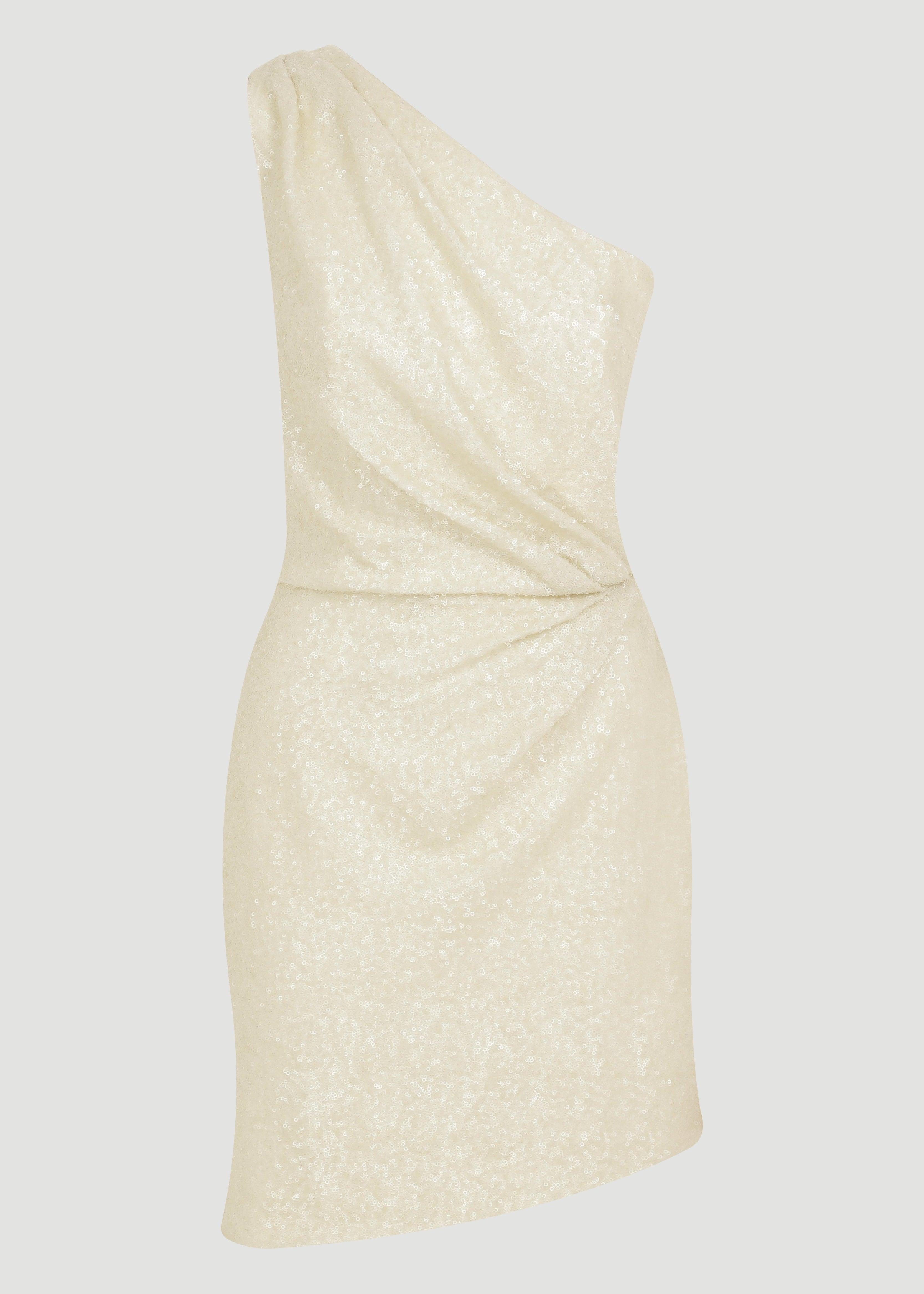 One-shoulder, draped detail, sequined mini dress. It is 87 cm from shoulder.