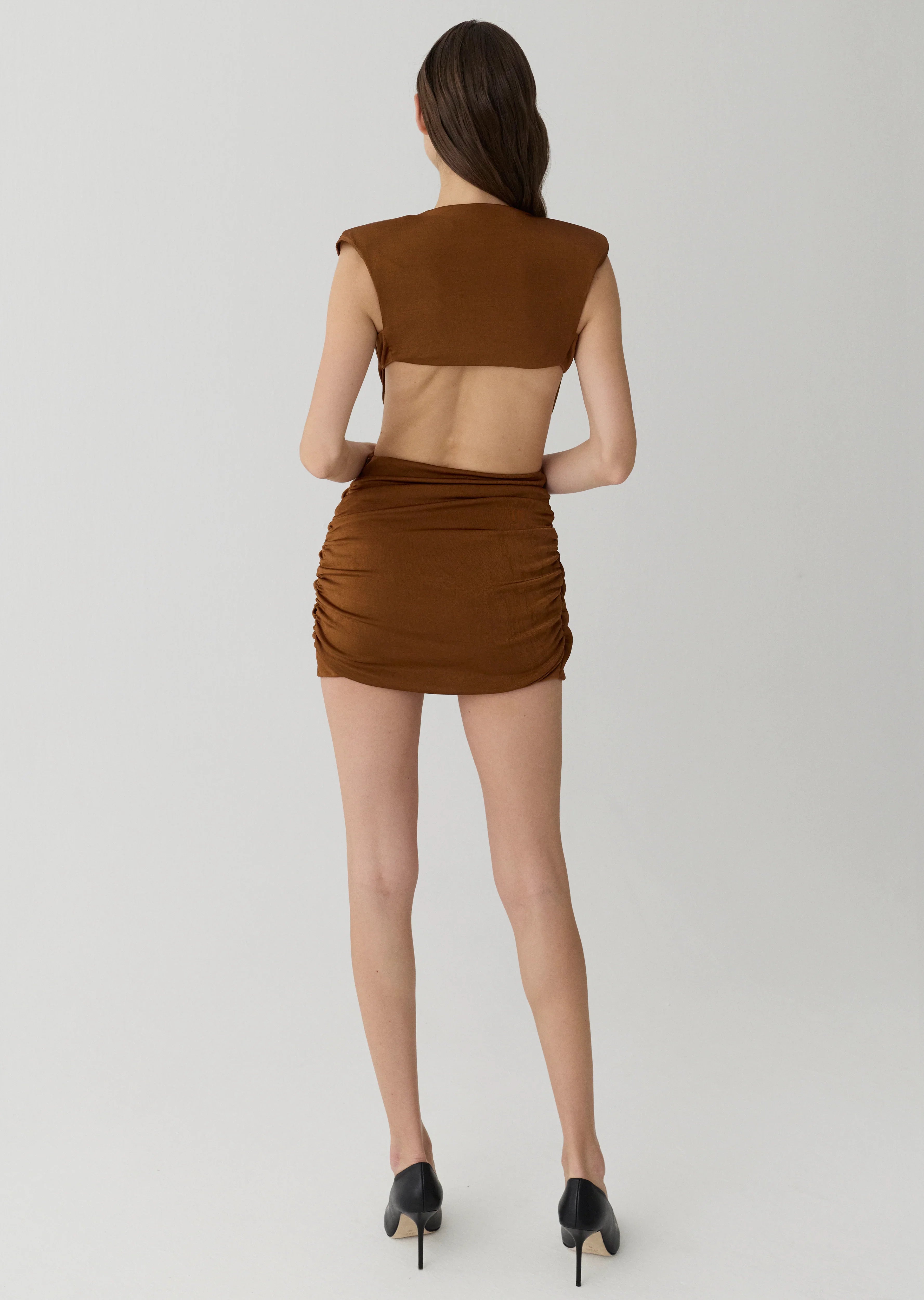 Mini dress with low-cut back and double-breasted drape detail.