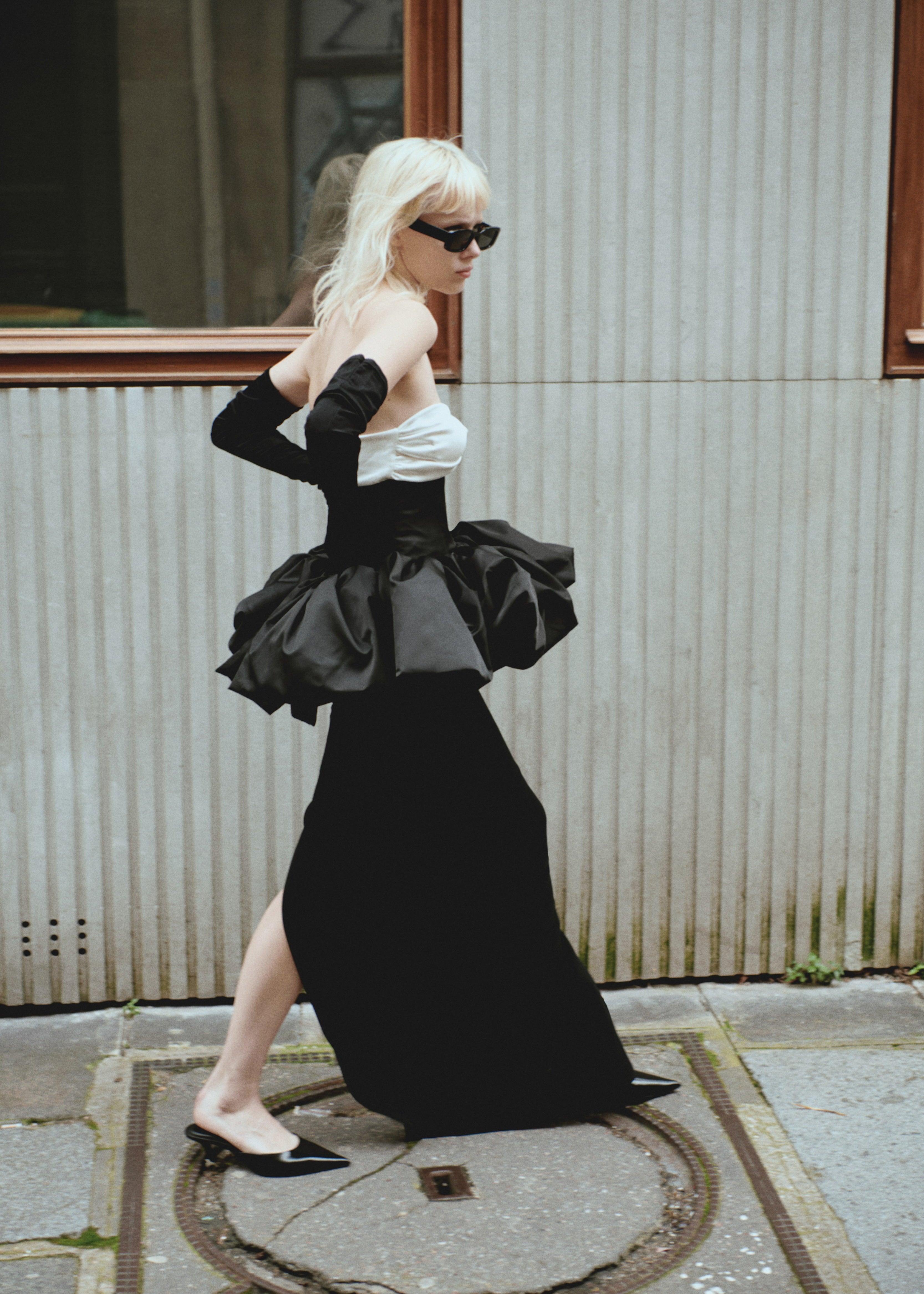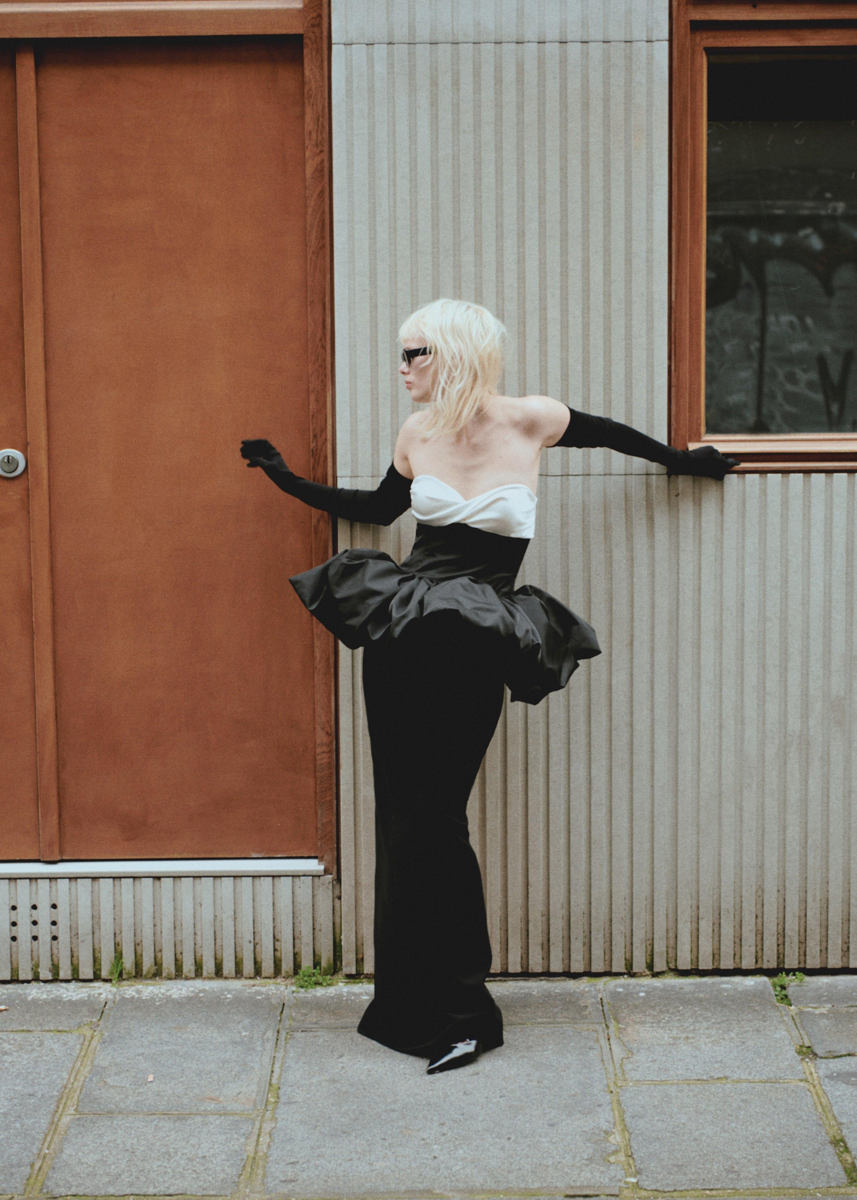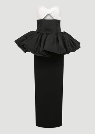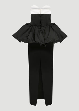 Pencil skirt dress with twisted chest and peplum detail at the waist.