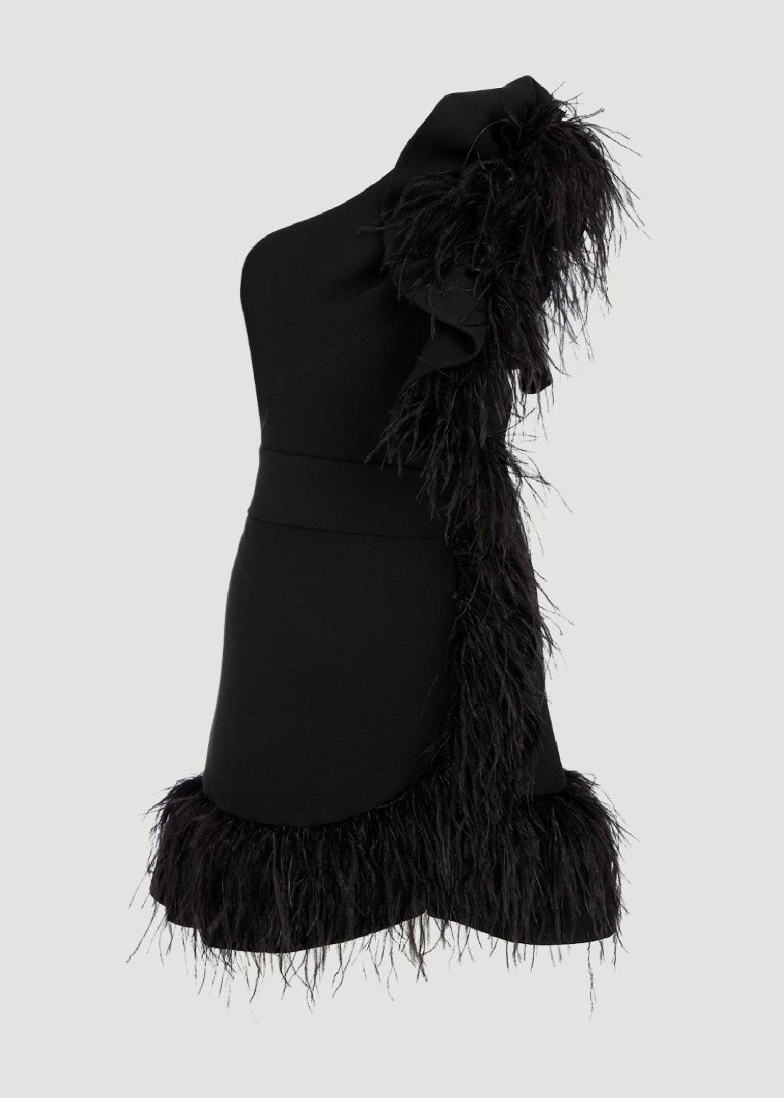 One sleeve, feather detailed short dress. It is 82 cm from shoulder.