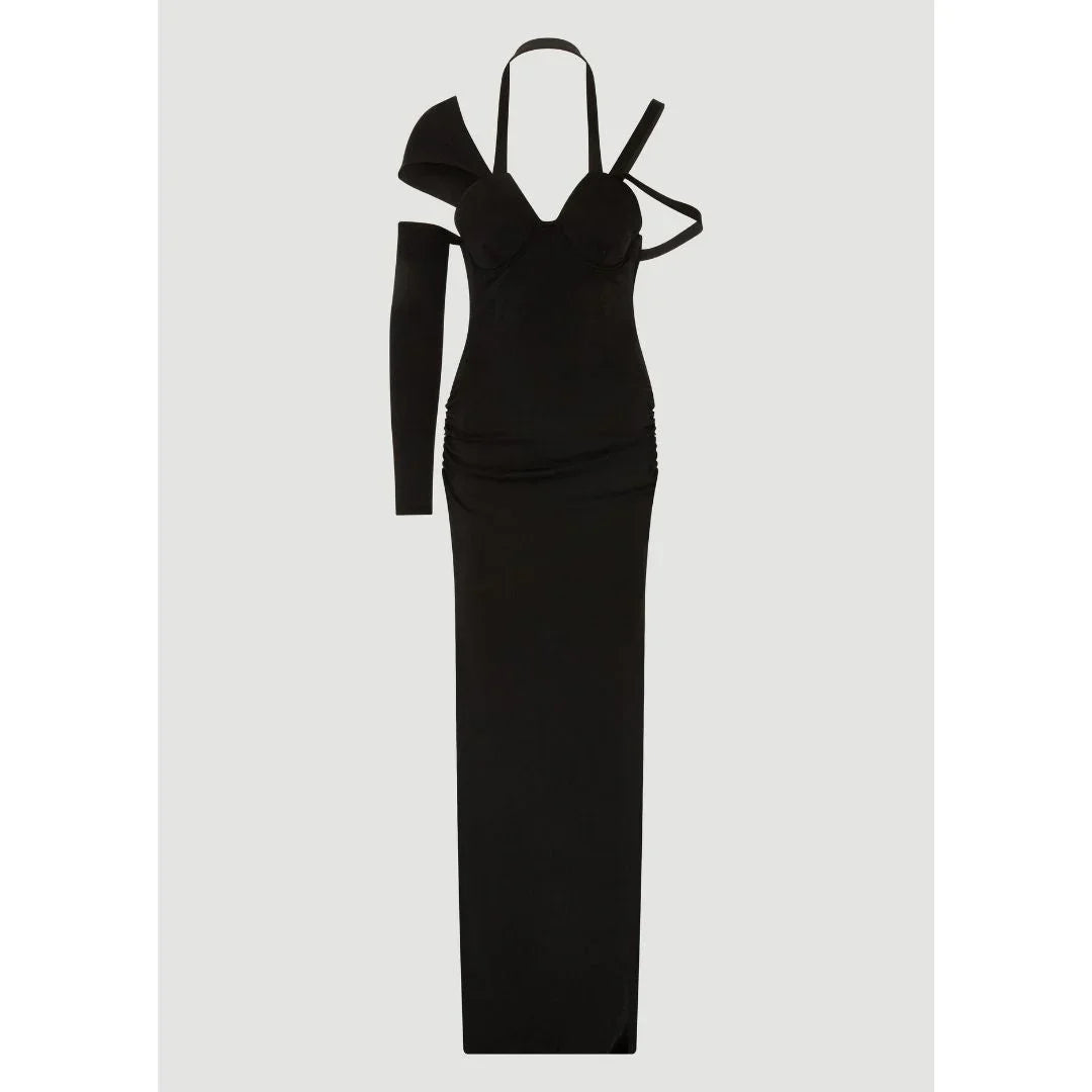 One-sleeved dress with cut-out and strap detail.