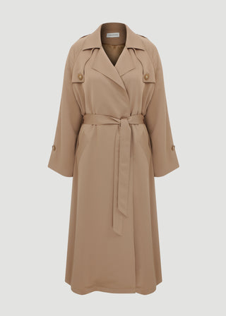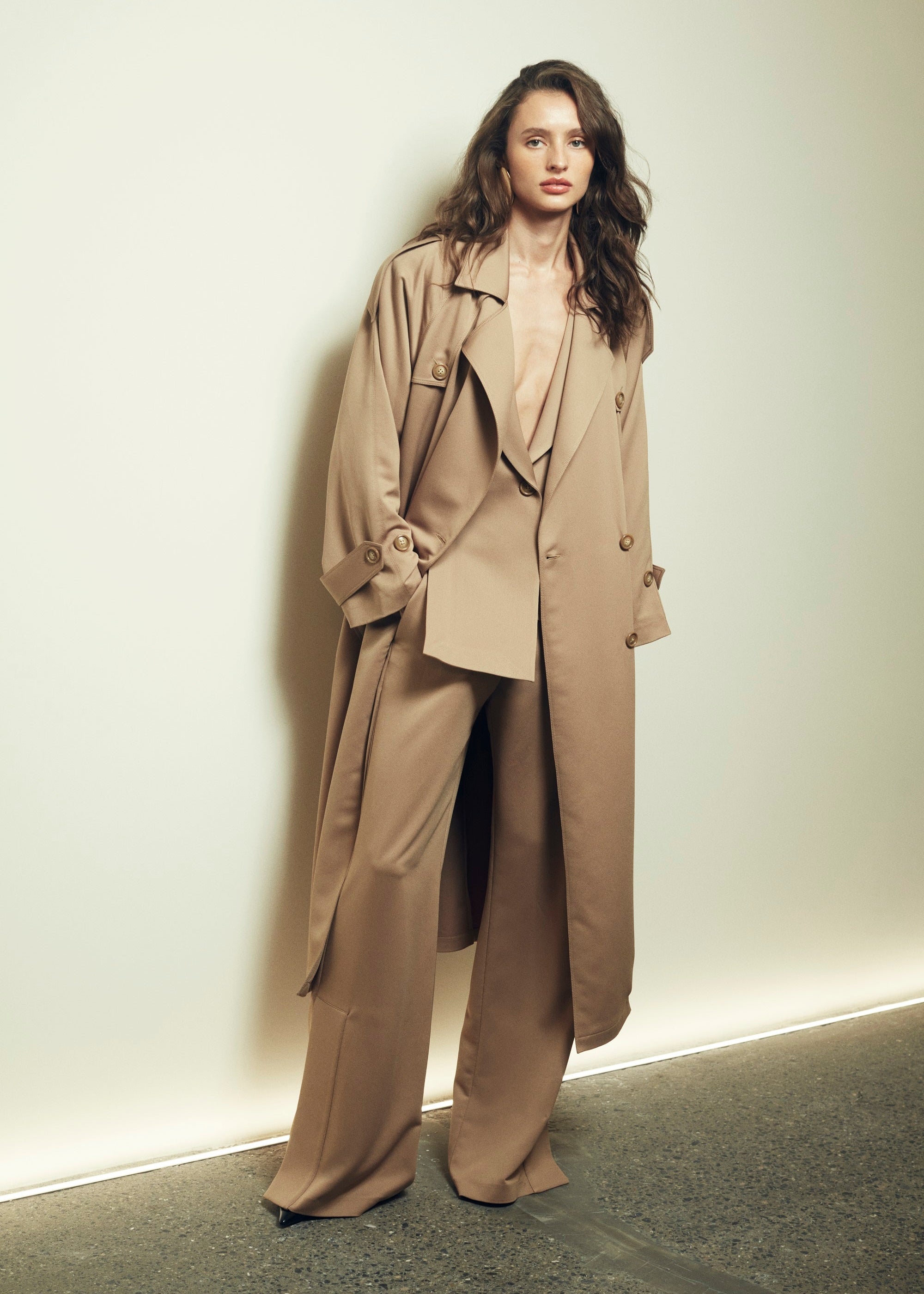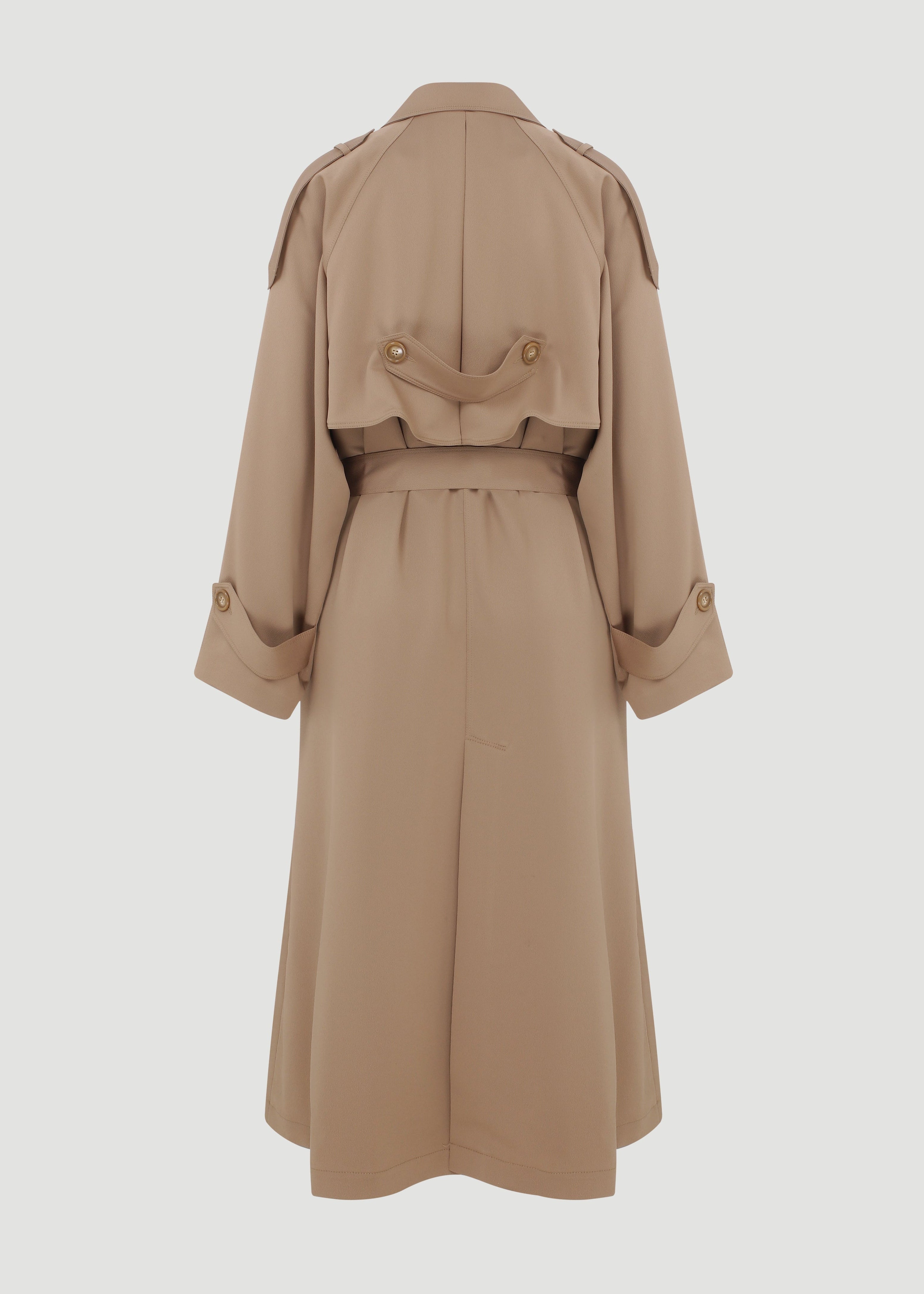 Oversize cut trench coat with epaulette details on the arms, back and shoulders, and a specially designed windbreaker for air circulation.