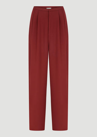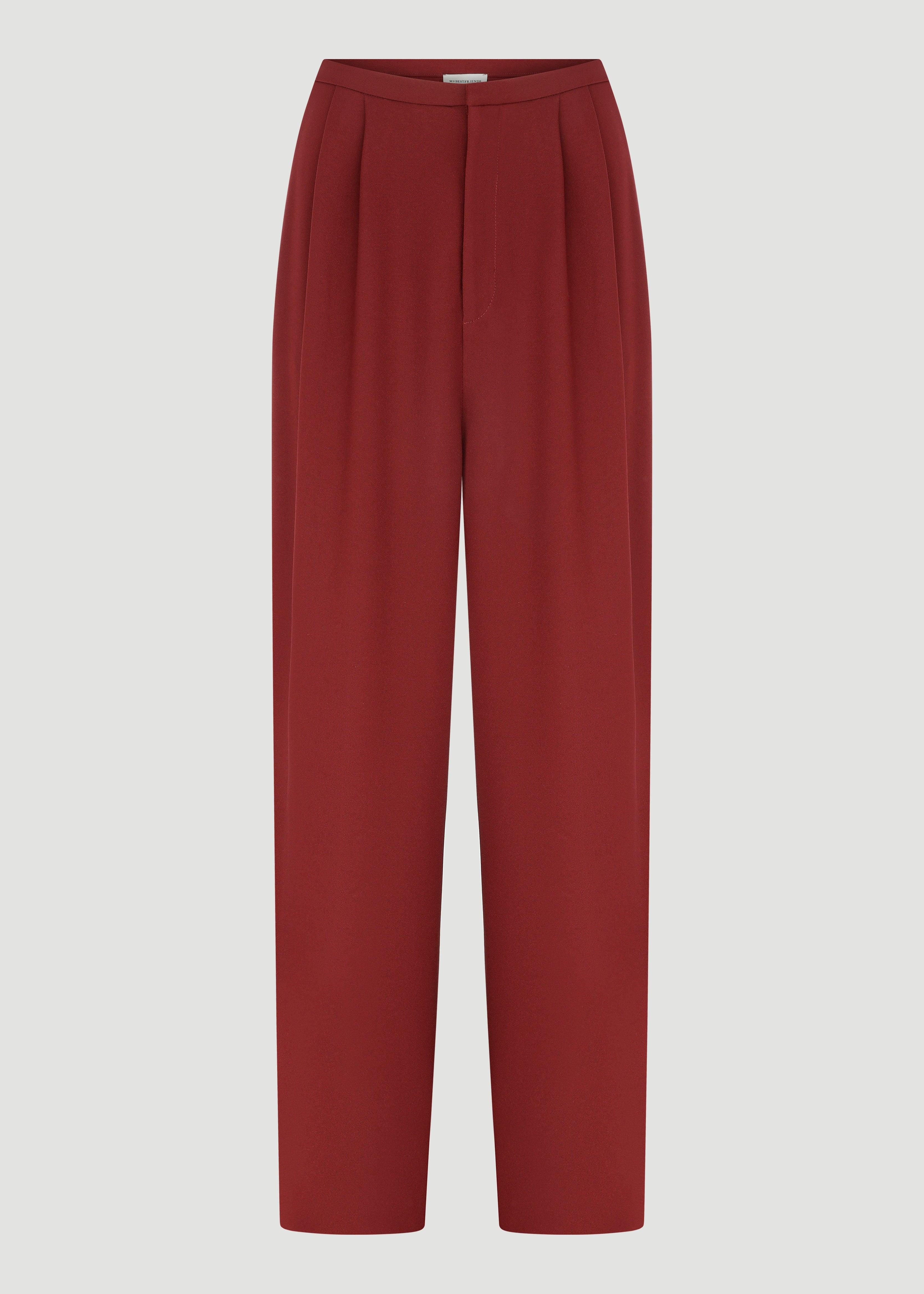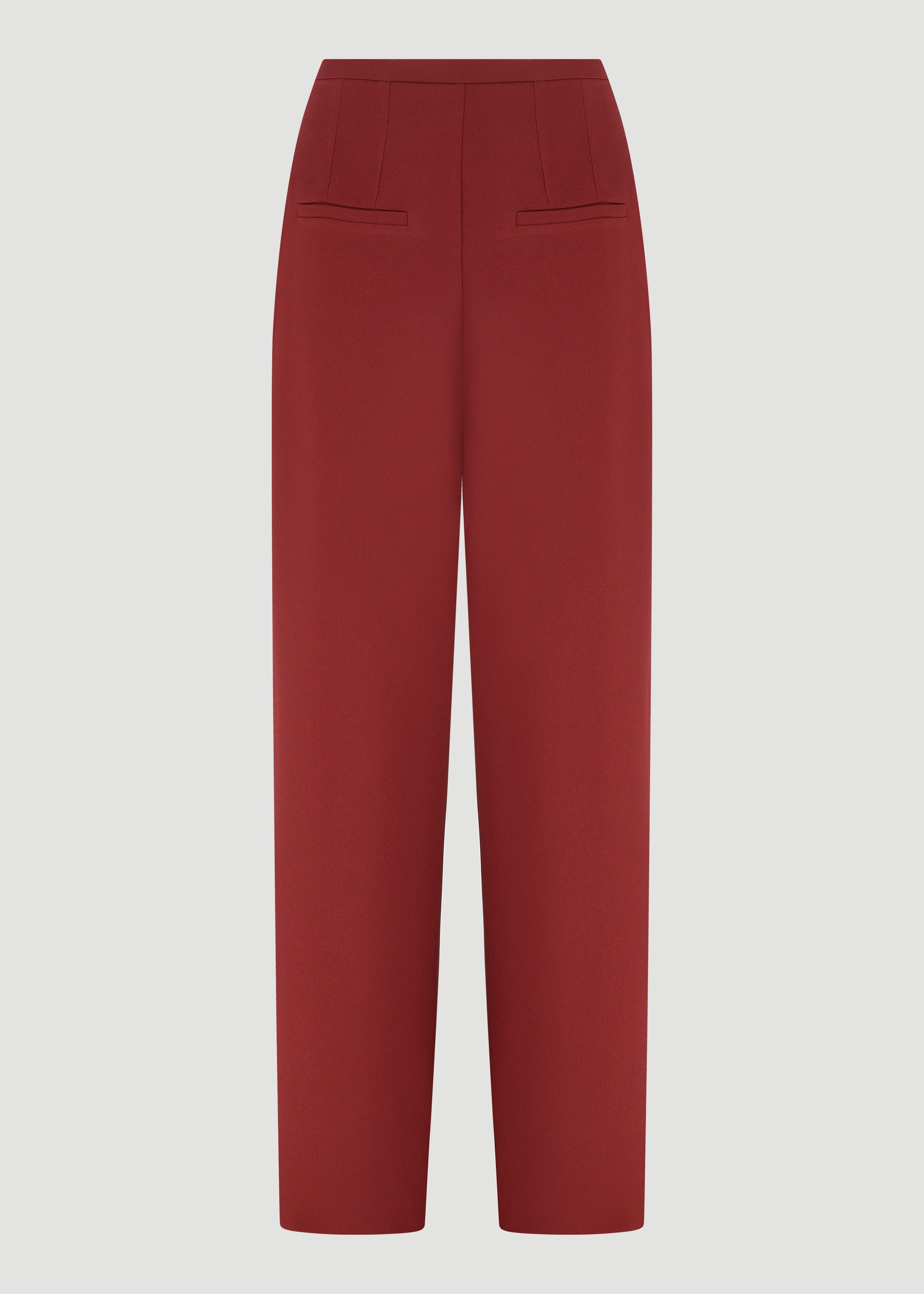 It is a trouser that stands out with its pleat details and thin belt. It has a pattern that fits at the waist and expands towards the legs. These trousers are made of crepe fabric.