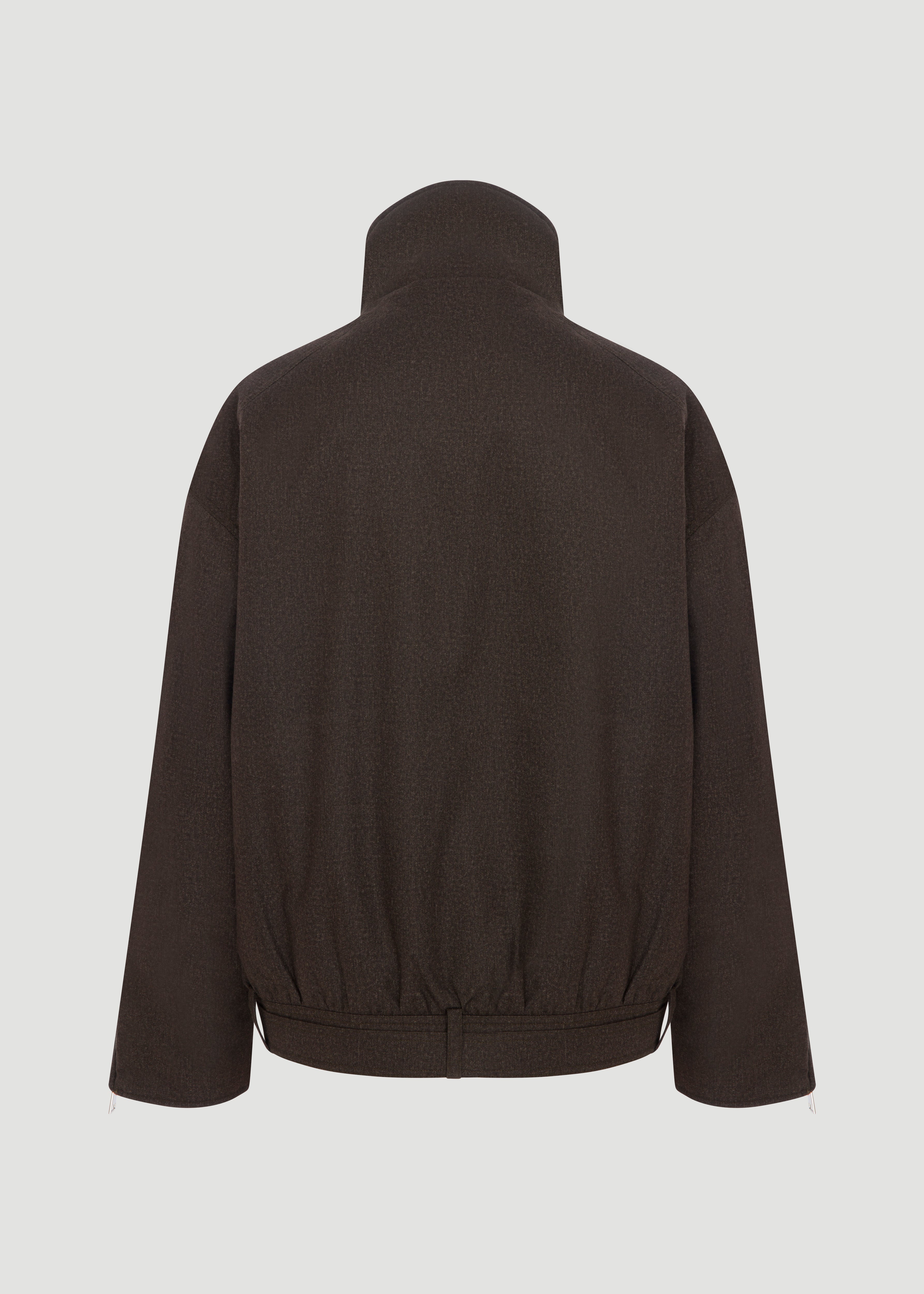 Belted, high-collared, zippered jacket with removable shawl detail.