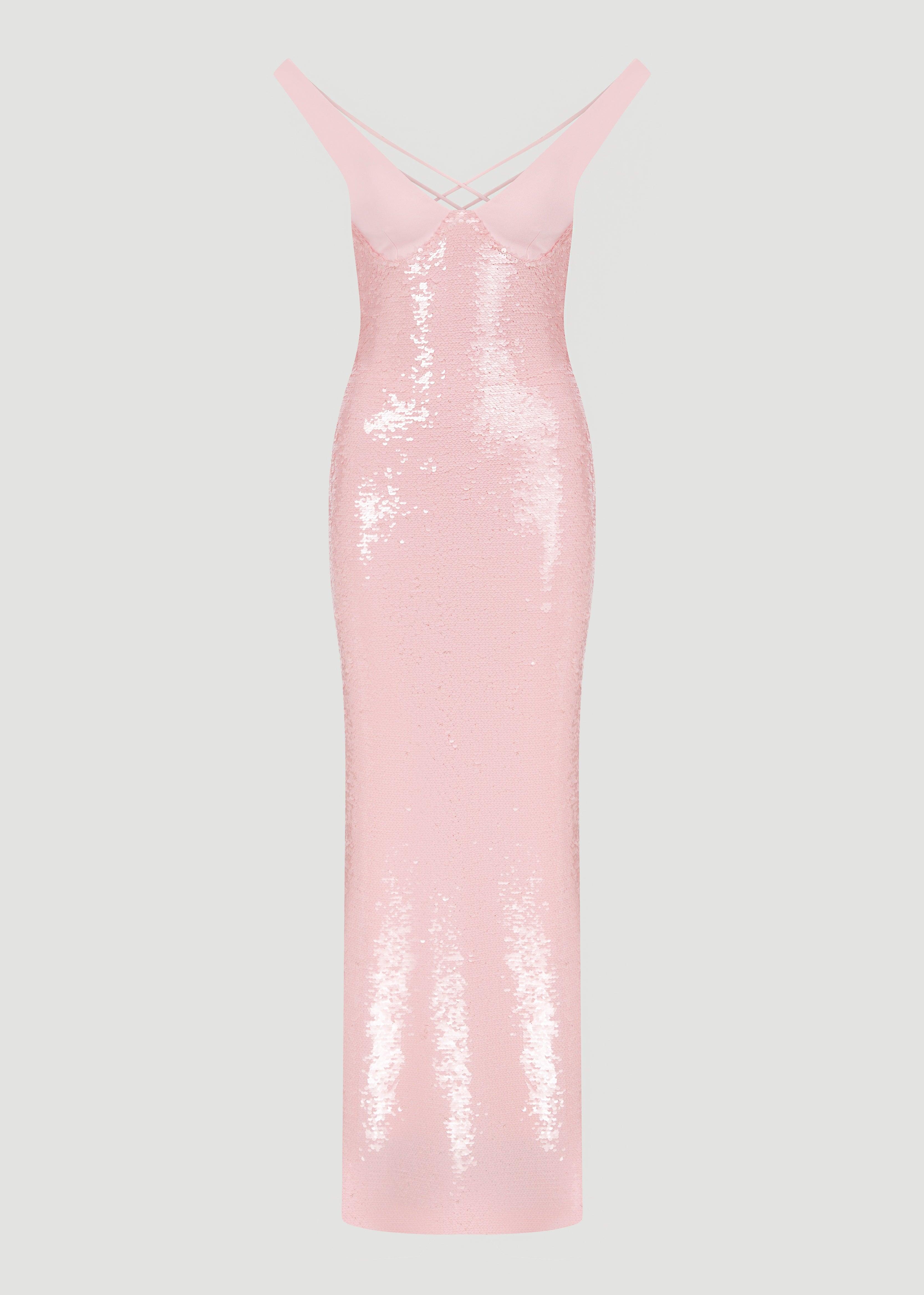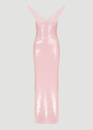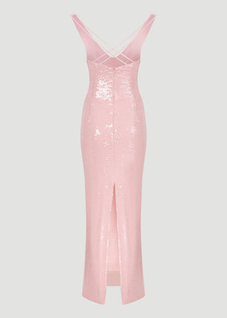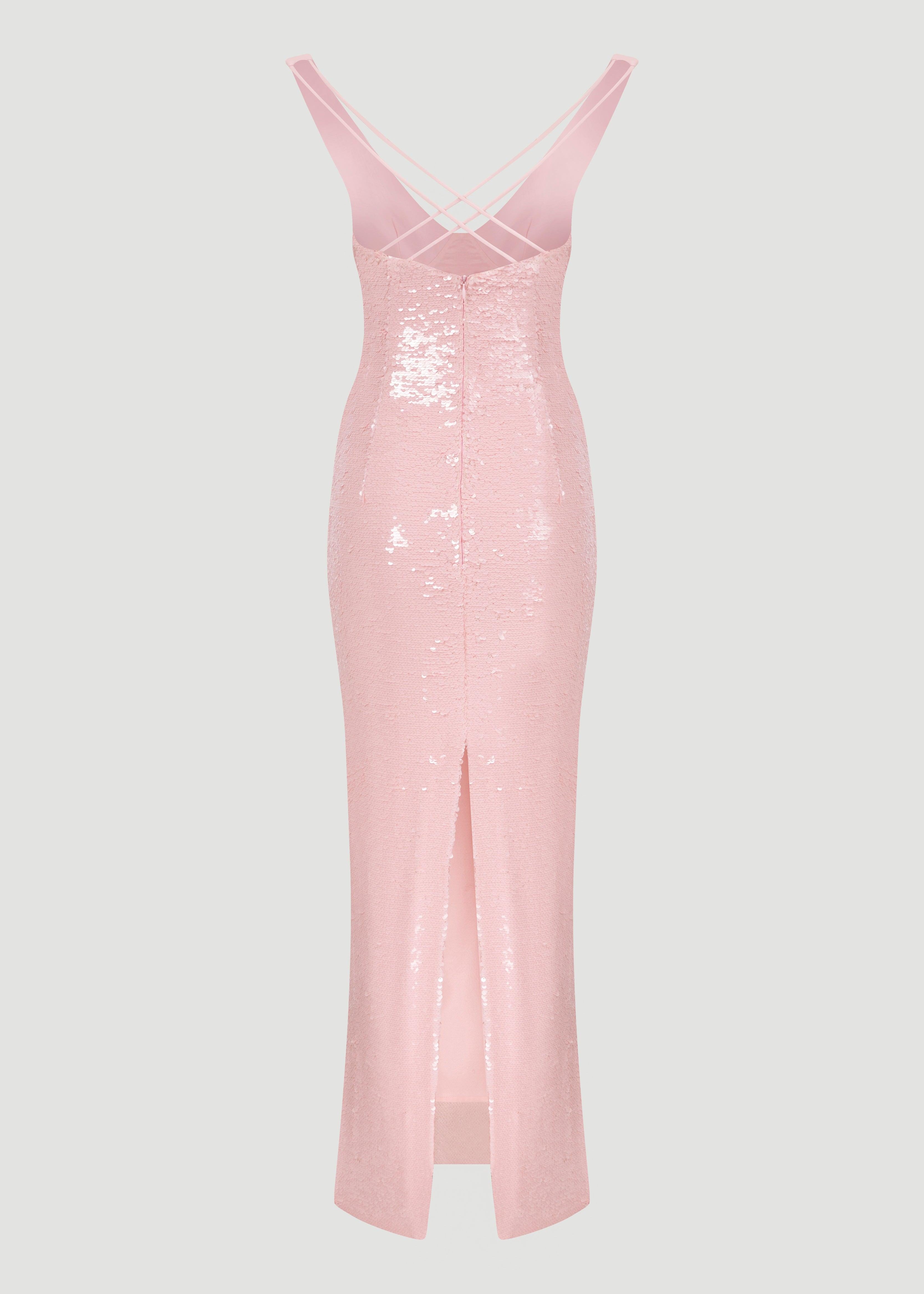 Sırtı çift askılı, kalem etek payet elbise.