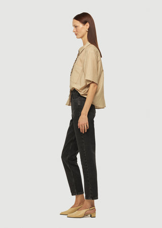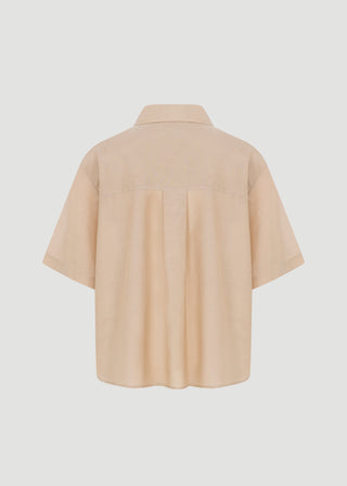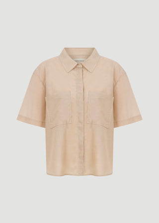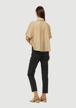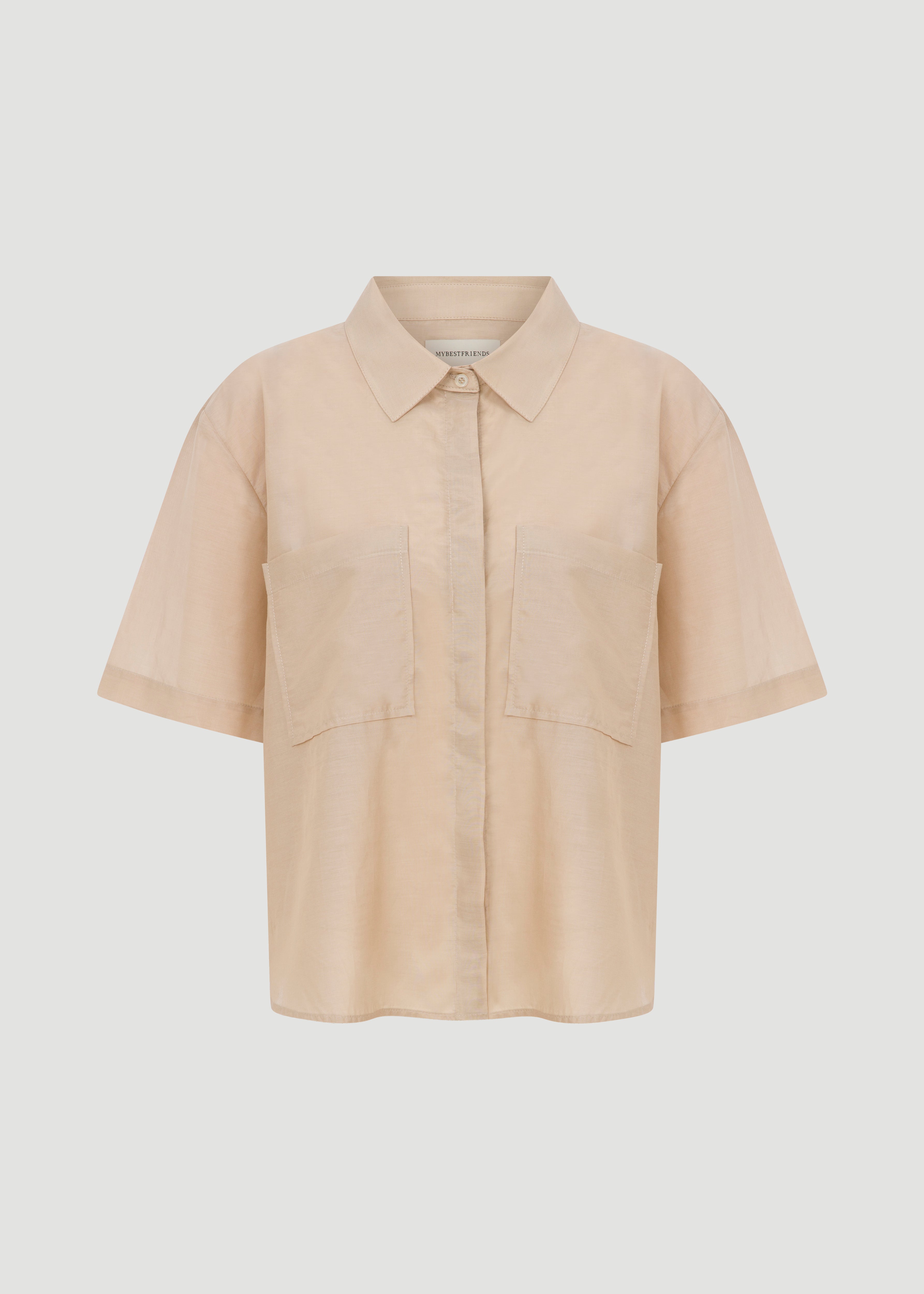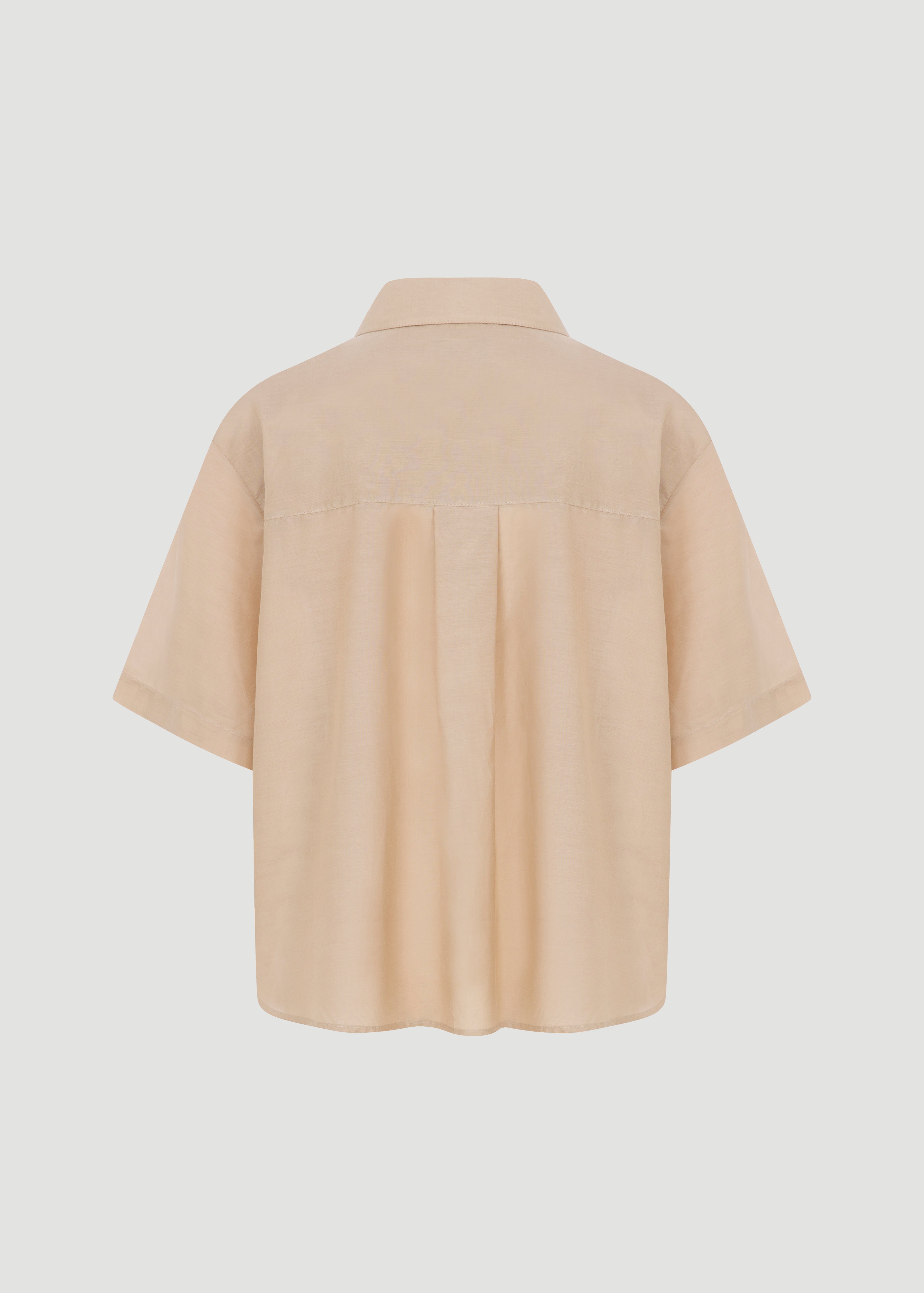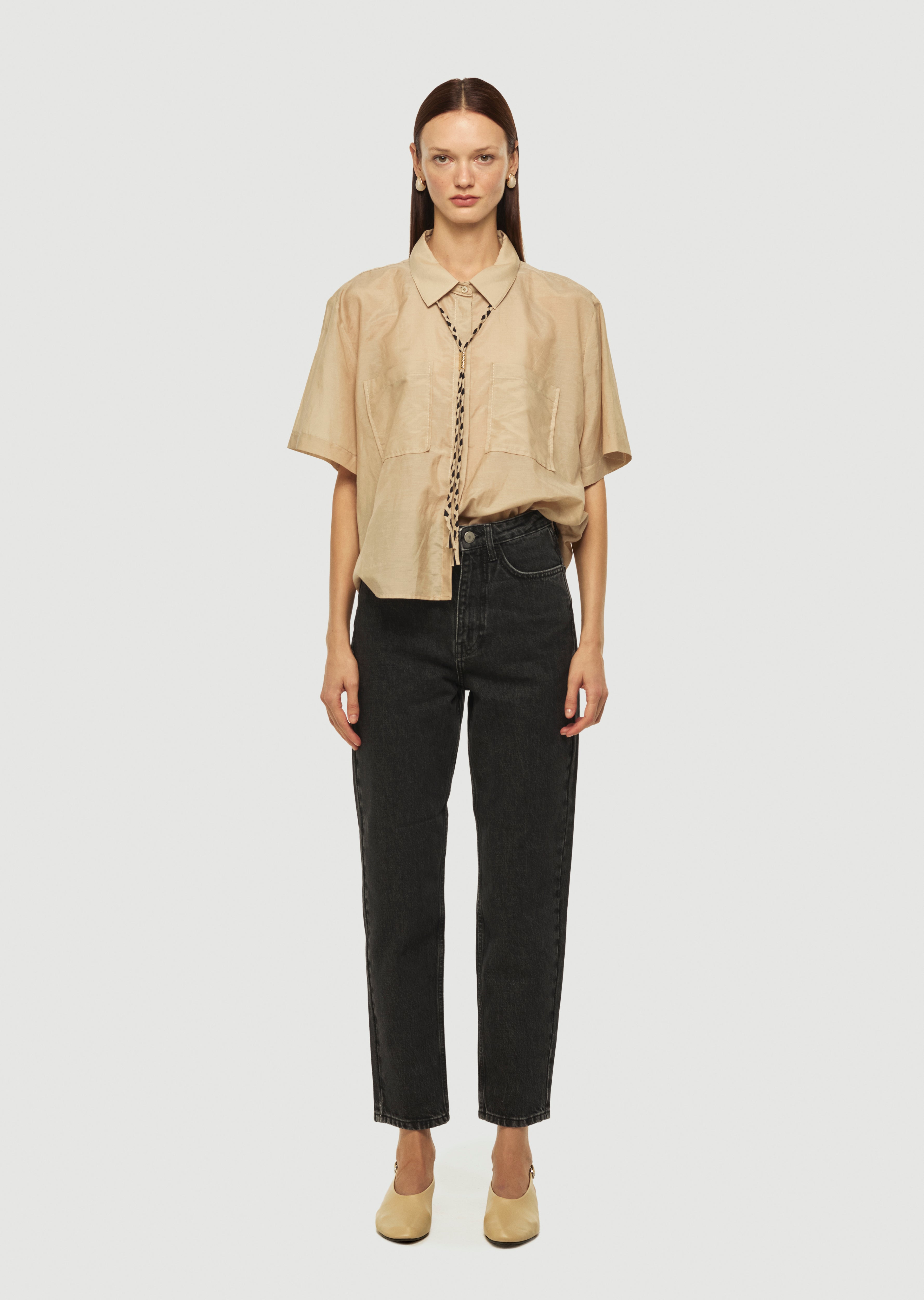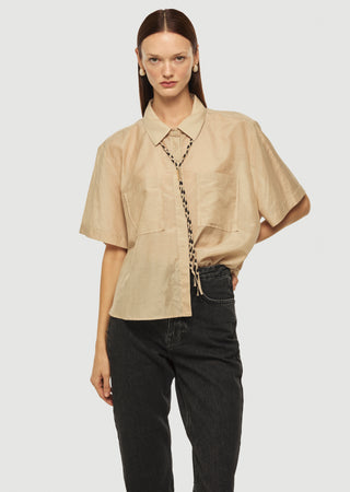 Kısa kollu, aksesuar detaylı ipek gömlek.